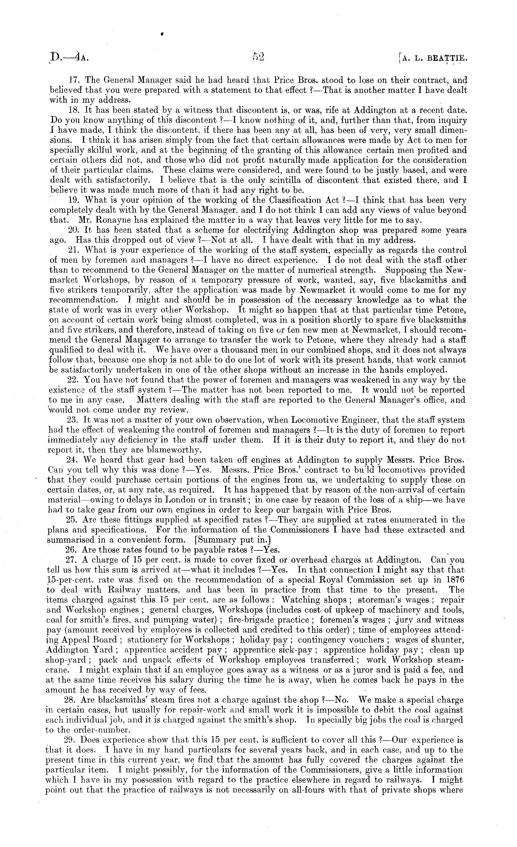 17. The General Manager said lie had heard that Price Bros, stood to lose on their contract, and believed that you were prepared with a statement to that effect ? —That is another matter I have dealt with in my address. 18. It has been stated by a witness that discontent is, or was, rife at Addington at a recent date. Do you know anything of this discontent ? —I know nothing of it, and, further than that, from inquiry I have made, I think the discontent, if there has been any at all, has been of very, very small dimensions. I think it has arisen simply from the fact that certain allowances were made by Act to men for specially skilful work, and at the beginning of the granting of this allowance certain men profited and certain others did not, and those who did not profit naturally made application for the consideration of their particular claims. These claims were considered, and were found to be justly based, and were dealt with satisfactorily. I believe that is the only scintilla of discontent that existed there, and I believe it was made much more of than it had any right to be. 19. What is your opinion of the working of the Classification Act ? —I think that has been very completely dealt with by the General Manager, and I do hot think I can add any views of value beyond that. Mr. Ronayne has explained the matter in a way that leaves very little for me to say. 20-. It has been stated that a scheme for electrifying Addington shop was prepared some years ago. Has this dropped out of view ?—Not at all. I have dealt with that in my address. 21. What is your experience of the working of the staff system, especially as regards the control of men by foremen and managers ? —I have no direct experience. Ido not deal with the staff other than to recommend to the General Manager on the matter of numerical strength. Supposing the Newmarket Workshops, by reason of a temporary pressure of work, wanted, say, five blacksmiths and five strikers temporarily, after the application was made by Newmarket it would come to me for my recommendation. I might and should be in possession of the necessary knowledge as to what the state of work was in every other Workshop. It might so happen that at that particular time Petone, on account of certain work being almost completed, was in a position shortly to spare five blacksmiths and five strikers, and therefore, instead of taking on five or ten new men at Newmarket, I should recommend the General Manager to arrange to transfer the work to Petone, where they already had a staff qualified to deal with it. We have over a thousand men in our combined shops, and it does not always follow that, because one shop is not able, to do one lot of work with its present hands, that work cannot be satisfactorily undertaken in one of the other shops without an increase in the hands employed. 22. You have not found that the power of foremen and managers was weakened in any way by the existence of the staff system ? —The matter has not been reported to me. It would not be reported to me in any case. Matters dealing with the staff are reported to the General Manager's office, and Would not come under my review. 23. It was not a matter of your own observation, when Locomotive Engineer, that the staff system had the effect of weakening the control of foremen and managers ? —lt is the duty of foremen to report immediately any deficiency in the staff under them. If it is their duty to report it, and they do not report it, then they are blameworthy. 24. We hoard that gear had been taken off engines at Addington to supply Messrs. Price Bros. Can you tell why this was done ?—Yes. Messrs. Price Bros.' contract to bu'ld locomotives provided that they could purchase certain portions of the engines from us, we undertaking to supply these on certain dates, or, at any rate, as required. It has happened that by reason of the non-arrival of certain material—owing to delays in London or in transit; in one case by reason of the loss of a ship—we have had to take gear from our own engines in order to keep our bargain with Price Bros. 25. Are these fittings supplied at specified rates ? —They are supplied at rates enumerated in the plans and specifications. For the information of the Commissioners I have had these extracted and summarised in a convenient form. [Summary put in.] 26. Are those rates found to be payable rates ? —Yes. 27. A charge of 15 per cent, is made to cover fixed or overhead charges at Addington. Can you tell us how this sum is arrived at —what it includes ? —Yes. In that connection I might say that that 15-per-cent. rate was fixed on the recommendation of a special Royal Commission set up in 1876 to deal with Railway matters, and has been in practice from that time to the present. The items charged against this 15 per cent, are as follows : Watching shops ; storeman's wages ; repair and Workshop engines ; general charges, Workshops (includes cost of upkeep of machinery and tools, coal for smith's fires, and. pumping water) ; fire-brigade practice ; foremen's wages ; .jury and witness pay (amount received by employees is collected and credited to this order) ; time of employees attending Appeal Board ; stationery for Workshops ; holiday pay ; contingency vouchers ; wages of shunter, Addington Yard ; apprentice accident pay ; apprentice sick-pay ; apprentice holiday pay ; clean up shop-\ T ard ; pack and unpack effects of Workshop employees transferred ; work Workshop steamcrane. I might explain that if an employee goes away as a witness or as a juror and is paid a fee, and at the same time receives Ms salary during the time he is away, when he comes back he pays in the amount he has received by way of fees. 28. Are blacksmiths' steam fires not a charge against the shop ? —No. We make a special charge in certain cases, but usually for repair-work and small work it is impossible to debit the coal against each, individual job, and it is charged against t