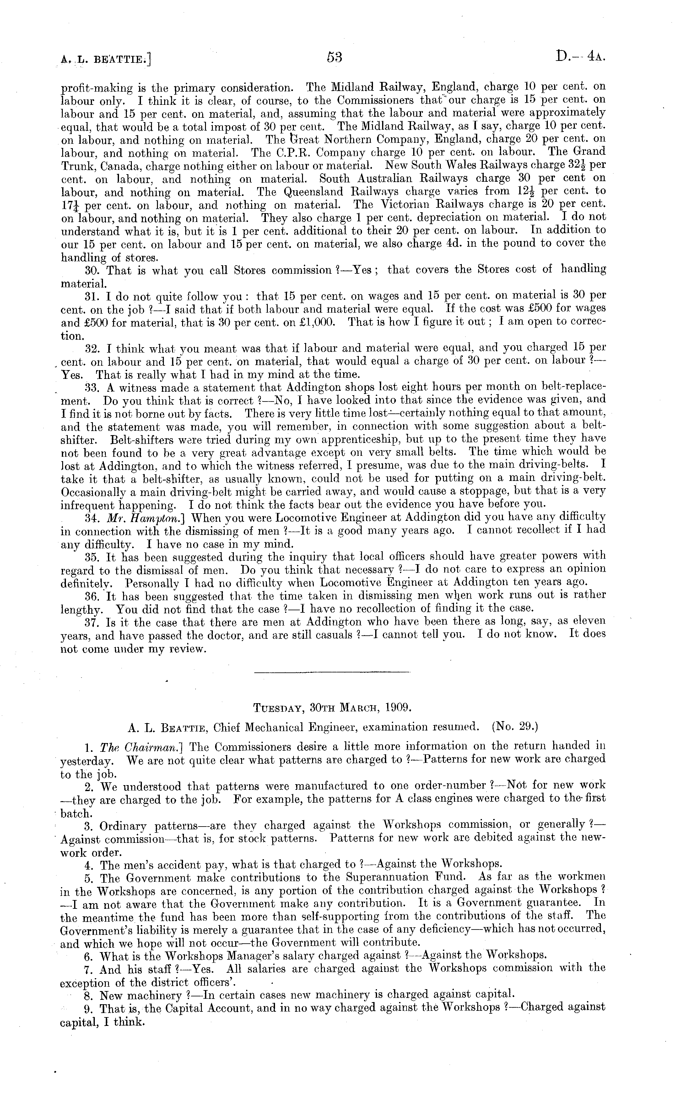 Tuesday, 30th March, 1909. A. L. Beattie, Chief Mechanical Engineer, examination resumed. (No. 29.) 1. The, Chairman.] The Commissioners desire a little more information on the return handed in yesterday. We are not quite clear what patterns are charged to ? —Patterns for new work are charged to the job. 2. We understood that patterns were manufactured to one order-number ? —Not for new work they are charged to the job. For example, the patterns for A class engines were charged to the- first batch. 3. Ordinary patterns —are they charged against the Workshops commission, or generally ?— Against commission—that is, for stock patterns. Patterns for new work are debited against the newwork order. 4. The men's accident pay, what is that charged to I —Against the Workshops. 5. The Government make contributions to the Superannuation Fund. As far as the workmen in the Workshops are concerned, is any portion of the contribution charged against the Workshops ? lam not aware that the Government make any contribution. It is a Government guarantee. In the meantime the fund has been more than self-supporting from the contributions of the staff. The Government's liability is merely a guarantee that in the case of any deficiency —which has not occurred, and which we hope will not occur —the Government will contribute. 6. What is the Workshops Manager's salary charged against ?—Against the Workshops. 7. And his staff ? —Yes. All salaries are charged against the Workshops commission with the exception of the district officers'. 8. New machinery ?—ln certain cases new machinery is charged against capital. 9. That is, the Capital Account, and in no way charged against the Workshops ? —Charged against capital, I think.