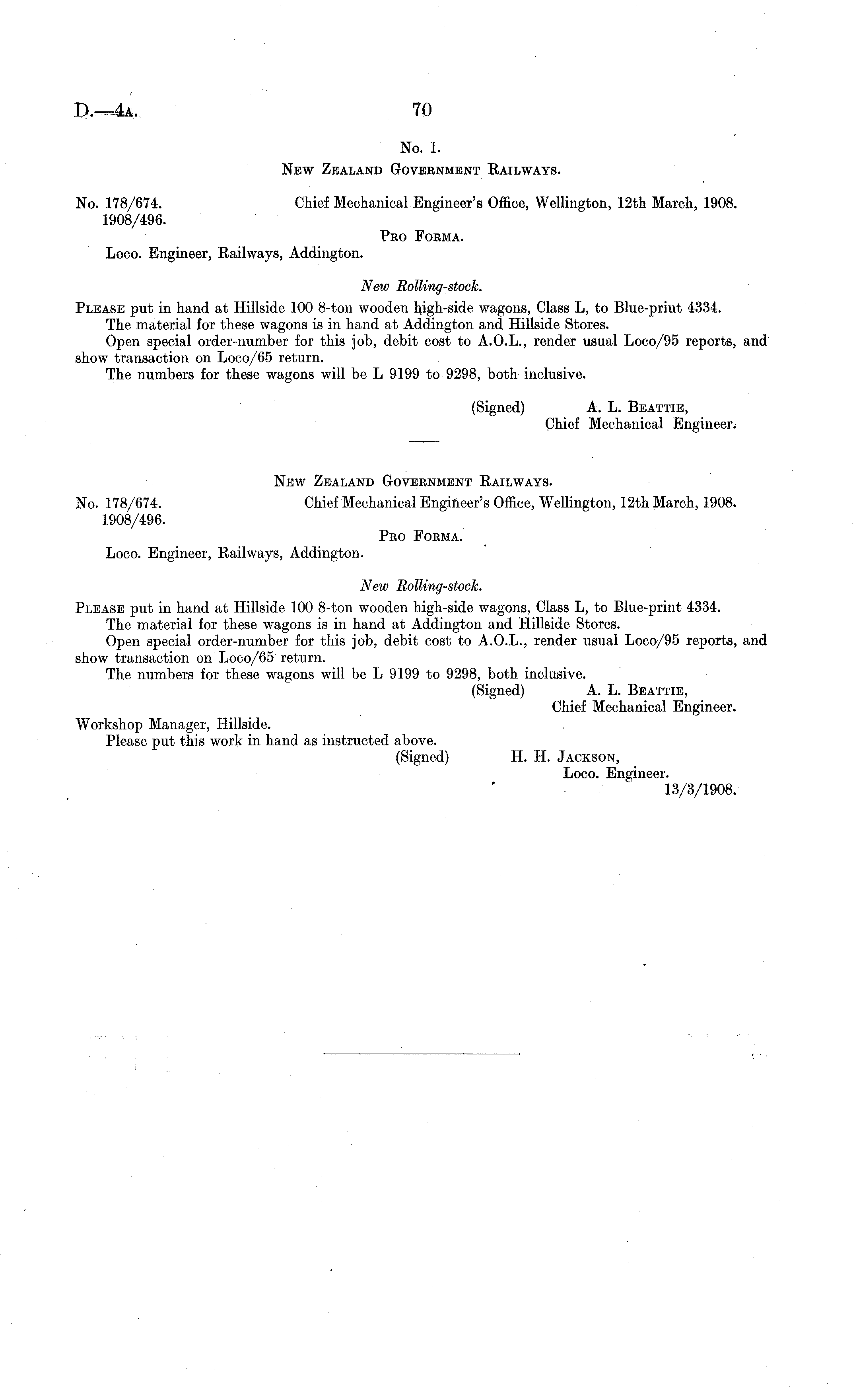 No. 1. New Zealand Government Railways. No. 178/674. Chief Mechanical Engineer's Office, Wellington, 12th March, 1908. 1908/496. Pro Forma. Loco. Engineer, Railways, Addington. New Rolling-stock. Please put in hand at Hillside 100 8-ton wooden high-side wagons, Class L, to Blue-print 4334. The material for these wagons is in hand at Addington and Hillside Stores. Open special order-number for this job, debit cost to A.0.L., render usual Loco/95 reports, and show transaction on Loco/65 return. The numbers for these wagons will be L 9199 to 9298, both inclusive. (Signed) A. L. Beattie, Chief Mechanical Engineer; New Zealand Government Railways. No. 178/674. Chief Mechanical Engineer's Office, Wellington, 12th March, 1908. 1908/496. Pko Forma. Loco. Engineer, Railways, Addington. New Rolling-stock. Please put in hand at Hillside 100 8-ton wooden high-side wagons, Class L, to Blue-print 4334. The material for these wagons is in hand at Addington and Hillside Stores. Open special order-number for this job, debit cost to A.0.L., render usual Loco/95 reports, and show transaction on Loco/65 return. The numbers for these wagons will be L 9199 to 9298, both inclusive. (Signed) A. L. Beattie, Chief Mechanical Engineer. Workshop Manager, Hillside. Please put this work in hand as instructed above. (Signed) H. H. Jackson, Loco. Engineer. 13/3/1908.
