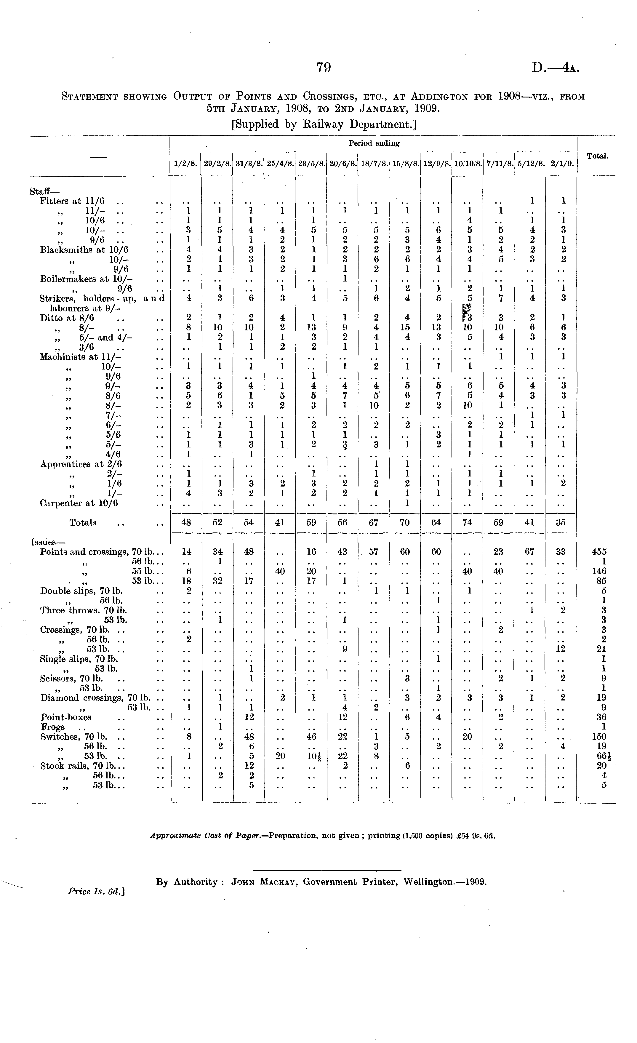 Period ending 1/2/8. 29/2/8. 31/3/8. 25/4/8. 23/6/8. 20/6/8. 18/7/8. 15/8/8. 12/9/8. 10/10/8. 7/11/8. 5/12/8. 2/1/9. Period ending Total. StaffFitters at 11/6 .. IV- •■ 10/6 10/- .. 9/6 .. Blacksmiths at 10/6 10/9/6 Boilermakers at 10/9/6 Strikers, holders - up, and labourers at 9/Ditto at 8/6 „ 8/5/- and 4/3/6 Machinists at 10/9/6 9/8/6 6/5/6 5/4/6 Apprentices at 2/6 2/1/6 VCarpenter at 10/6 1 1 3 1 4 2 1 i 2 8 1 1 1 5 1 4 1 1 i 3 1 10 2 1 1 1 4 1 3 3 1 6 2 10 1 1 1 4 2 2 2 2 i 3 4 2 1 2 i l 5 1 1 1 1 i 4 1 13 3 2 i 5 2 2 3 1 1 5 1 9 2 1 1 5 2 2 6 2 i 6 2 4 4 1 1 5 3 2 6 1 *2 4 4 15 4 1 6 4 2 4 1 1 5 2 13 3 1 4 5 1 3 4 1 2 B 10 5 i 5 2 4 5 i 7 3 10 4 i 1 1 4 2 2 3 i 4 2 6 3 i 1 1 3 1 2 2 i 3 1 6 3 i i i 1 i i 2 1 1 i 3 5 2 3 6 3 4 1 3 l 5 2 1 4 5 3 4 7 1 4 5" 10 5 6 2 5 7 2 6 5 10 5 4 1 "i 3 3 3 1 1 i 1 1 1 1 1 1 1 1 3 1 1 1 1 2 1 2 2 1 3 2 2 3 2 2 1 1 1 2 1 1 3 1 1 1 1 1 4 1 3 3 2 2 1 1 3 2 2 2 1 1 2 1 1 1 2 1 1 1 1 1 1 1 1 1 i 2 Totals 48 52 54 41 59 56 67 70 64 74 59 41 35 Issues — Points and crossings, 70 lb... 561b... 55 lb... . „ 53 1b... Double slips, 70 lb. 56 lb. Three throws, 70 lb. 53 lb. Crossings, 70 lb. .. 561b. .. 531b. .. Single slips, 70 lb. 53 lb. Scissors, 70 lb. 531b. .. Diamond crossings, 70 lb. .. 531b. .. Point-boxes Frogs Switches, 70 lb. .. 561b. .. 531b. .. Stock rails, 70 lb... 56 lb... 53 lb... 14 6 18 2 2 34 1 32 i 48 17 i 1 40 16 20 17 43 1 9 57 1 60 1 60 1 1 1 1 40 1 23 40 2 67 i 33 2 12 455 1 146 85 5 1 3 3 3 2 21 1 1 9 1 19 9 36 1 150 19 66J 20 4 5 3 2 i 2 i 1 2 1 1 4 12 3 1 2 3 3 i 2 i 1 12 2 6 4 2 i 48 6 5 12 2 5 8 2 46 22 1 3 8 "o 20 4 1 2 2 20 ioj 22 2 6 2 Appri Cost of xdmate Paper.—Preparation, not given ; printing (1,500 copies) £54 9s. 6d.