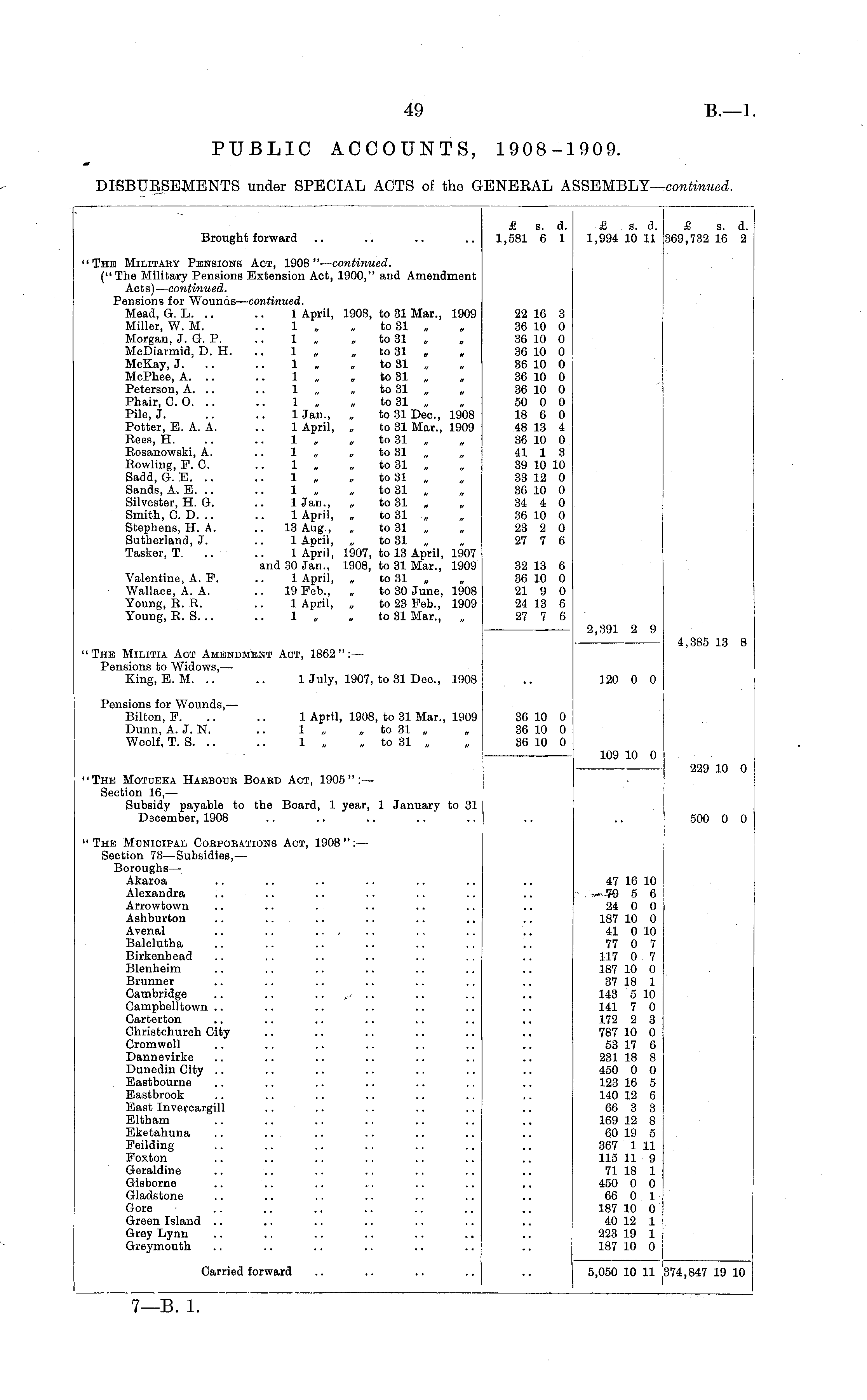 Brought forward £ s. d. 1,581 6 1 £ s. d. 1,994 10 11 £ s. d. 369,732 16 2 'he Military Pensions Act, 1908 " — continued. ("The Military Pensions Extension Act, 1900," and Amendment Acts) — continued. Pensions for Wounds— continued. Mead, G. L. .. .. 1 April, 1908, to 31 Mar., 1909 Miller, W. M. .. 1 „ „ to 31 „ Morgan, J. G. P. .. 1 „ „ to 31 „ McDiarmid, D. H. .. 1 „ „ to 31 „ McKay, J. .. 1 „ „ to 31 „ McPhee, A. .. .. 1 „ „ to 31 „ Peterson, A. .. .. 1 „ „ to 31 „ „ Phair, CO... .. 1 „ „ to 31 „ Pile, J. .. .. Uan., „ to 31 Dec, 1908 Potter, E. A. A. .. 1 April, „ to 31 Mar., 1909 Rees, H. .. .. 1 „ „ to 31 „ Rosanowski, A. .. 1 „ „ to 31 „ „ Rowling, F. C. .. 1 „ „ to 31 „ Sadd, G. E. .. .. 1 „ „ to 31 „ Sands, A. E. .. .. 1 „ „ to 31 „ Silvester, H. G. .. Uan., „ to 31 „ Smith, CD. .. .. 1 April, „ to 31 „ Stephens, H. A. .. 13 Aug., „ to 31 „ Sutherland, J. .. 1 April, „ to 31 „ Tasker, T. .. .. 1 April, 1907, to 13 April, 1907 and 30 Jan., 1908, to 31 Mar., 1909 Valentine, A. F. .. 1 April, „ to 31 „ „ Wallace, A. A. .. 19 Feb., „ to 30 June, 1908 Young, R. B. .. 1 April, „ to 23 Feb., 1909 Young, R. S. .. .. 1 „ . to 31 Mar., „ 22 16 3 36 10 0 36 10 0 36 10 0 36 10 0 36 10 0 36 10 0 50 0 0 18 6 0 48 13 4 36 10 0 41 1 3 39 10 10 33 12 0 36 10 0 34 4 0 36 10 0 23 2 0 27 7 6 32 13 6 36 10 0 21 9 0 24 13 6 27 7 6 2,391 2 9 'he Militia Act Amendment Act, 1862 " :— Pensions to Widows, — King, E. M. .. .. 1 July, 1907, to 31 Dec, 1908 4,385 13 8 Pensions for Wounds, — Bilton, F. .. 1 April, 1908, to 31 Mar., 1909 Dunn, A. J. N. .. 1 , , to 31 „ Woolf, T. S. .. .. 1 „ „ to 31 „ 120 0 0 36 10 0 36 10 0 36 10 0 109 10 0 'he Motueka Harbour Boabd Act, 1905 " :— Section 16, — Subsidy payable to the Board, 1 year, 1 January to 31 December, 1908 229 10 0 500 0 0 'he Municipal Corporations Act, 1908 " :— Section 73 —Subsidies, — Boroughs— Akaroa Alexandra :. Arrowtown Ashburton Avenal .. .. Balolutha Birkenhead Blenheim Brunner Cambridge .. .. .. Campbelltown Carterton Christohurch City Cromwell Dannevirke .. .. .. Dunedin City .. , Eastbourne Eastbrook East Invercargill Eltham Eketahuna Feilding Foxton Geraldine Gisborne Gladstone Gore Green Island Grey Lynn Greymouth 47 16 10 79 5 6 24 0 0 187 10 0 41 0 10 77 0 7 117 0 7 187 10 0 37 18 1 143 5 10 141 7 0 172 2 3 787 10 0 53 17 6 231 18 8 450 0 0 123 16 5 140 12 6 66 3 3 169 12 8 60 19 5 367 1 11 115 11 9 71 18 1 450 0 0 66 0 1 187 10 0 40 12 1 223 19 1 187 10 0 Carried forward 5,050 10 11 374,847 19 10