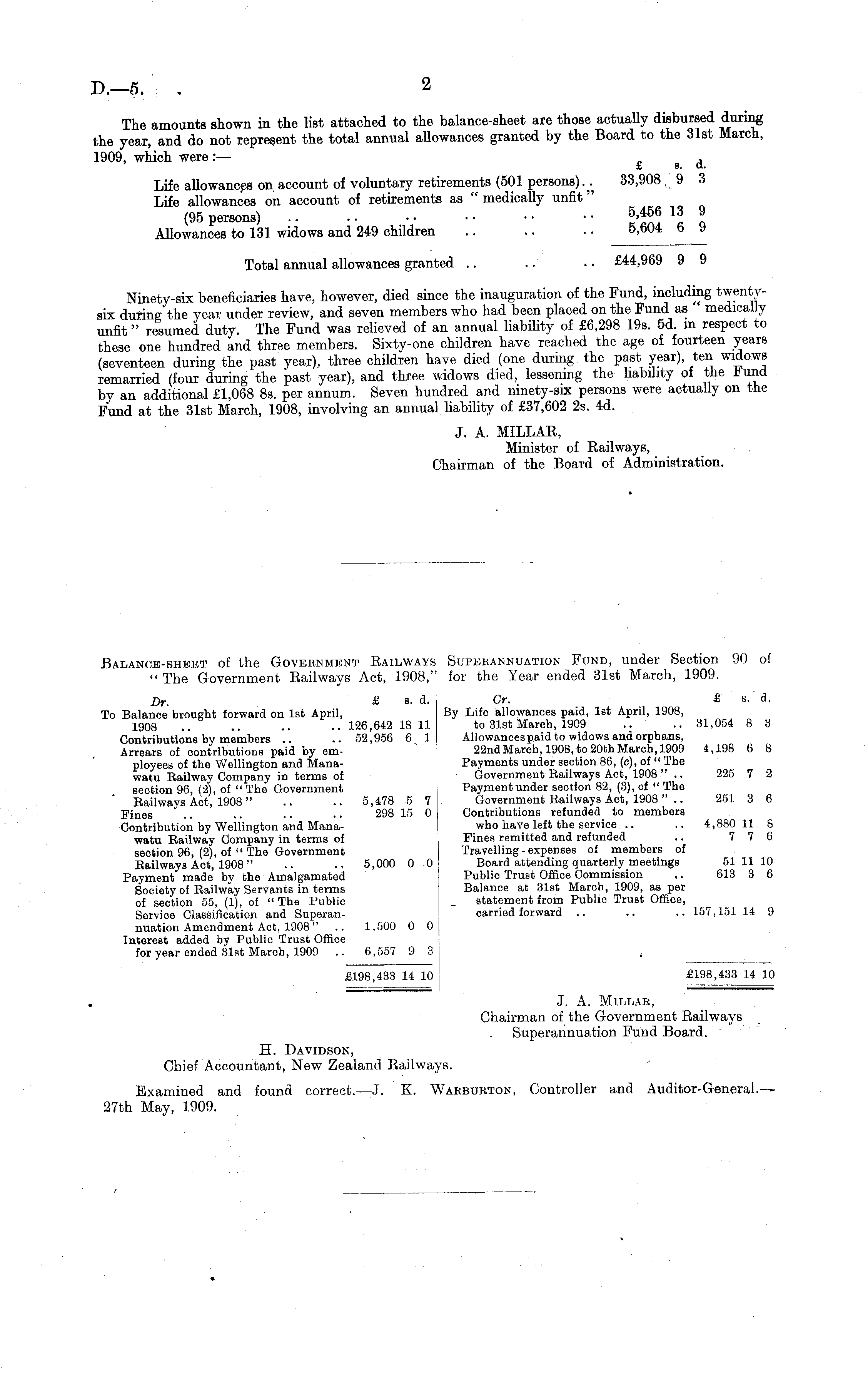 The amounts shown in the list attached to the balance-sheet are those actually disbursed during the year, and do not represent the total annual allowances granted by the Board to the 31st March, 1909, which were : — , X 8. Q. Life allowances on account of voluntary retirements (501 persons).. 33,908, 9 3 Life allowances on account of retirements as " medically unfit" (95persons) M" *j> j| Allowances to 131 widows and 249 children .. .. • • 5,604 6 9 Total annual allowances granted .. .. .. £44,969 9 9 Ninety-six beneficiaries have, however, died since the inauguration of the Fund, including twentysix during the year under review, and seven members who had been placed on the Fund as medically unfit" resumed duty. The Fund was relieved of an annual liability of £6,298 19s. sd. m respect to these one hundred and three members. Sixty-one children have reached the age of fourteen years (seventeen during the past year), three children have died (one during the past year), ten widows remarried (four during the past year), and three widows died, lessening the liability of the *und by an additional £1,068 Bs. per annum. Seven hundred and ninety-six persons were actually on the Fund at the 31st March, 1908, involving an annual liability of £37,602 2s. 4d. J. A. MILLAB, Minister of Eailways, Chairman of the Board of Administration.