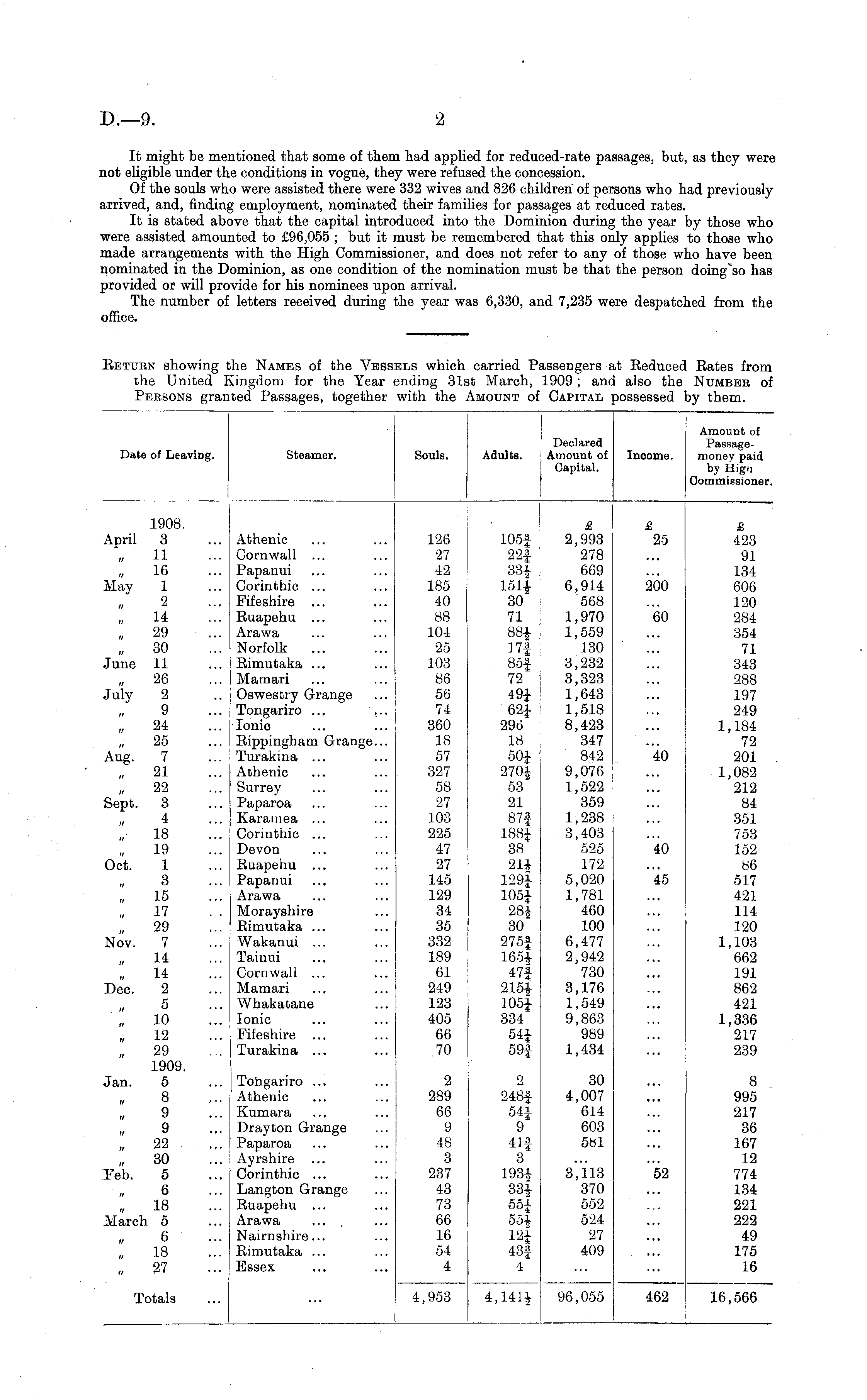 Date of Leaving. Steamer. Souls. Adults. Declared Amount of Capital. Income. Amount of Passagemoney paid by Hign Commissioner. 1908. April 3 . 11 16 May 1 2 „ 14 „ 29 30 June 11 26 July 2 9 . 24 „ 25 Aug. 7 „ 21 . 22 Sept. 3 4 „■ 18 „ 19 Oct. 1 3 ■ 15 17 ■ 29 Nov. 7 . 14 . 14 Dec. 2 5 „ 10 ■ 12 ■ 29 1909. Jan. 5 8 9 9 „ 22 „ 30 Feb. 5 6 „ 18 March 5 6 . 18 . 27 Athenic Cornwall ... Papanui Corinthic ... Fifeshire ... Ruapehu ... Arawa Norfolk Rimutaka ... Mamari j Oswestry Grange i Tongariro ... ... Ionic Rippingham Grange... Turakina ... Athenic Surrey Paparoa Karamea ... Corinthic ... Devon Ruapehu ... Papanui Arawa Morayshire Rimutaka ... Wakanui ... Tainui Cornwall ... Mamari Whakatane Ionic Fifeshire ... Turakina ... i 126 27 42 185 40 88 104 25 103 86 56 74 360 18 57 327 58 27 103 225 47 27 145 129 34 35 332 189 61 249 123 405 66 70 1054 224 331 151* 30 71 88* 174 85| 72 49i 621 29d 18 50i 270* 53 21 874 188i 38 21* 129* 105* 28J 30 2754 165i 474 215* 1051 334 54* 594 „ 2,993 278 669 6,914 '568 1,970 1,559 130 3,232 3,323 1,643 1,518 8,423 347 842 9,076 1,522 359 1,238 3,403 525 172 5,020 1,781 460 100 6,477 2,942 730 3,176 1,549 9,863 989 1,434 _ 25 200 "60 40 "40 "45 _ 423 91 134 606 120 284 354 71 343 288 197 249 1,184 72 201 1,082 212 84 351 753 152 86 517 421 114 120 1,103 662 191 862 421 1,336 217 239 1 Tohgariro ... Athenic Kumara Drayton Grange Paparoa Ayrshire Corinthic ... Langton Grange Ruapehu ... Arawa Nairnshire... Rimutaka ... Essex 2 289 66 9 48 3 237 43 73 66 16 54 4 2 2484 54* 9 414 3 193* 33f 55* 55* 13* 43f 4 30 4,007 614 603 581 3,113 370 552 524 27 409 52 8 995 217 36 167 12 774 134 221 222 49 175 16 Totals 4,953 4,141* 96,055 462 16,566