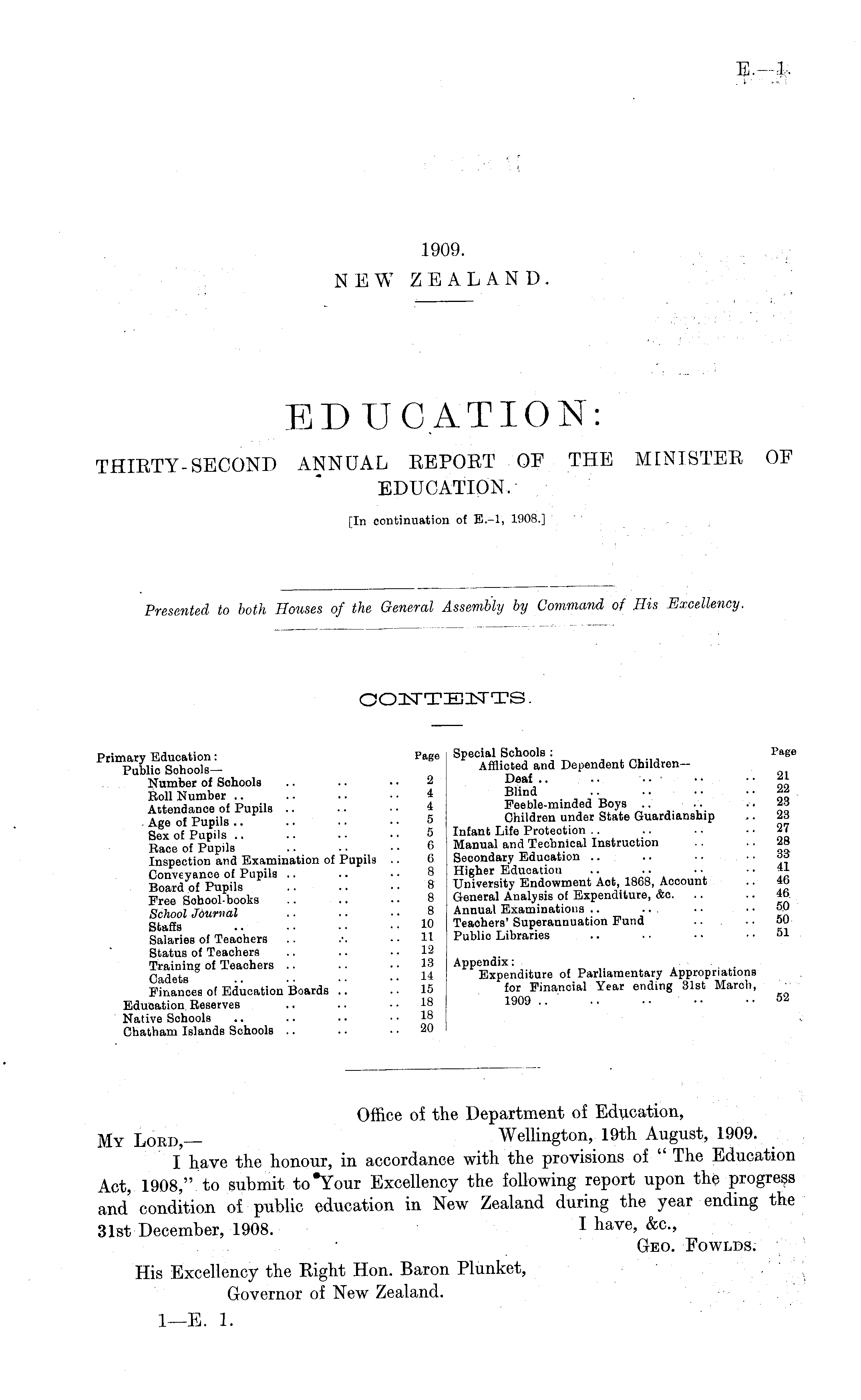 Office of the Department of Education, My Lord — Wellington, 19th August, 1909. I have the honour, in accordance with the provisions of " The Education Act, 1908," to submit Excellency the following report upon the progress and condition of public education in New Zealand during the year ending the 31st December, 1908. l haye > &c -' Geo. Fowlds. His Excellency the Right Hon. Baron Plunket, Governor of New Zealand. I—E. 1.