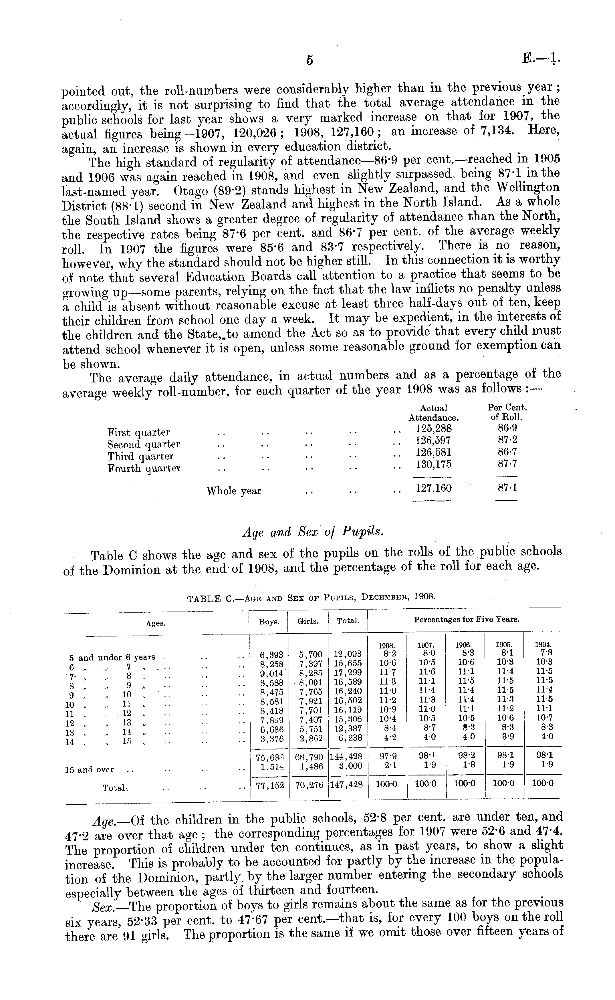 pointed out, the roll-numbers were considerably higher than in the previous year ; accordingly, it is not surprising to find that the total average attendance in the public schools for last year shows a very marked increase on that for 1907, the actual figures being—l9o7, 120,026; 1908,127,160; an increase of 7,134. Here, again, an increase is shown in every education district. The high standard of regularity of attendance—B6*9 per cent.—reached in 1905 and 1906 was again reached in 1908, and even slightly surpassed, being 87-1 in the last-named year. Otago (89-2) stands highest in New Zealand, and the Wellington District (88-1) second in New Zealand and highest in the North Island. As a whole the South Island shows a greater degree of regularity of attendance than the North, the respective rates being 87-6 per cent, and 86-7 per cent, of the average weekly roll. In 1907 the figures were 85-6 and 83-7 respectively. There is no reason, however, why the standard should not be higher still. In this connection it is worthy of note that several Education Boards call attention to a practice that seems to be growing up—some parents, relying on the fact that the law inflicts no penalty unless a child is absent without reasonable excuse at least three half-days out of ten, keep their children from school one day a week. It may be expedient, in the interests of the children and the State,.to amend the Act so as to provide that every child must attend school whenever it is open, unless some reasonable ground for exemption can be shown. The average daily attendance, in actual numbers and as a percentage ol tne average weekly roll-number, for each quarter of the year 1908 was as follows :— Actual Per Cent. Attendance. of Roll. First quarter 125,288 86-9 Second quarter .. . • • • • • • • U0,8»7 8/ I Third quarter 126,581 86-7 Fourth quarter . . .. • • • • • • 1*>,175 87 7 Whole year 127,160 87-1 Age and Sex of Pupils. Table C shows the age and sex of the pupils on the rolls of the public schools of the Dominion at the end of 1908, and the percentage of the roll for each age.