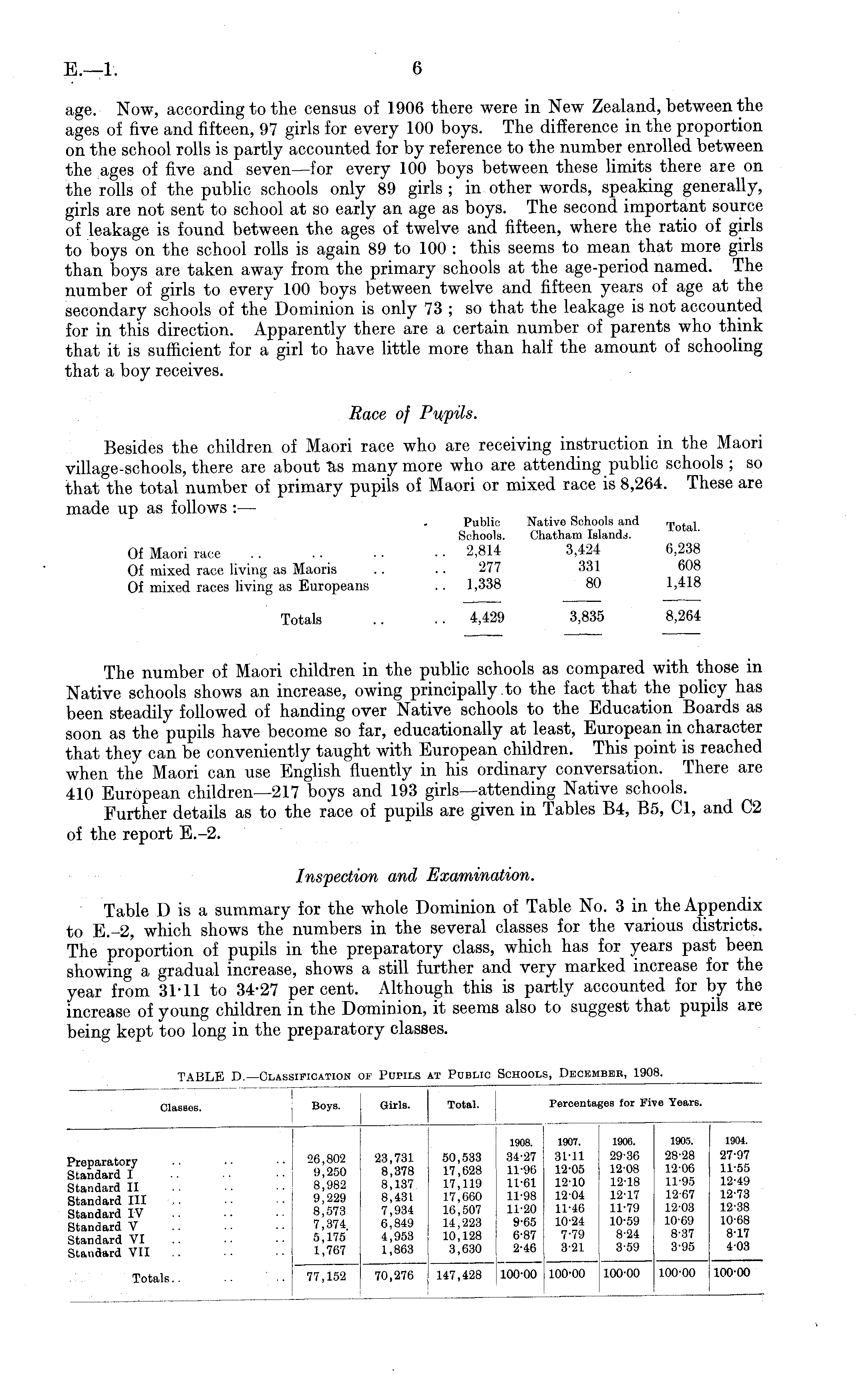 age. Now, according to the census of 1906 there were in New Zealand, between the ages of five and fifteen, 97 girls for every 100 boys. The difference in the proportion on the school rolls is partly accounted for by reference to the number enrolled between the ages of five and seven —for every 100 boys between these limits there are on the rolls of the public schools only 89 girls ; in other words, speaking generally, girls are not sent to school at so early an age as boys. The second important source of leakage is found between the ages of twelve and fifteen, where the ratio of girls to boys on the school rolls is again 89 to 100 : this seems to mean that more girls than boys are taken away from the primary schools at the age-period named. The number of girls to every 100 boys between twelve and fifteen years of age at the secondary schools of the Dominion is only 73 ; so that the leakage is not accounted for in this direction. Apparently there are a certain number of parents who think that it is sufficient for a girl to have little more than half the amount of schooling that a boy receives. Race of Pupils. Besides the children of Maori race who are receiving instruction in the Maori village-schools, there are about Us many more who are attending public schools ; so that the total number of primary pupils of Maori or mixed race is 8,264. These are made up as follows : — Public Native Schools and T o (; a i Schools. Chatham Islandd. Of Maori race 2,814 3,424 6,238 Of mixed race living as Maoris .. .. 277 331 608 Of mixed races living as Europeans .. 1,338 80 1,418 Totals .. .. 4,429 3,835 8,264 The number of Maori children in the public schools as compared with those in Native schools shows an increase, owing principally.to the fact that the policy has been steadily followed of handing over Native schools to the Education Boards as soon as the pupils have become so far, educationally at least, European in character that they can be conveniently taught with European children. This point is reached when the Maori can use English fluently in his ordinary conversation. There are 410 European children—2l7 boys and 193 girls—attending Native schools. Further details as to the race of pupils are given in Tables 84, 85, Cl, and C 2 of the report E.-2. Inspection and Examination. Table D is a summary for the whole Dominion of Table No. 3 in the Appendix to E.-2, which shows the numbers in the several classes for the various districts. The proportion of pupils in the preparatory class, which has for years past been showing a gradual increase, shows a still further and very marked increase for the year from 31-11 to 34-27 percent. Although this is partly accounted for by the increase of young children in the Dominion, it seems also to suggest that pupils are being kept too long in the preparatory classes.