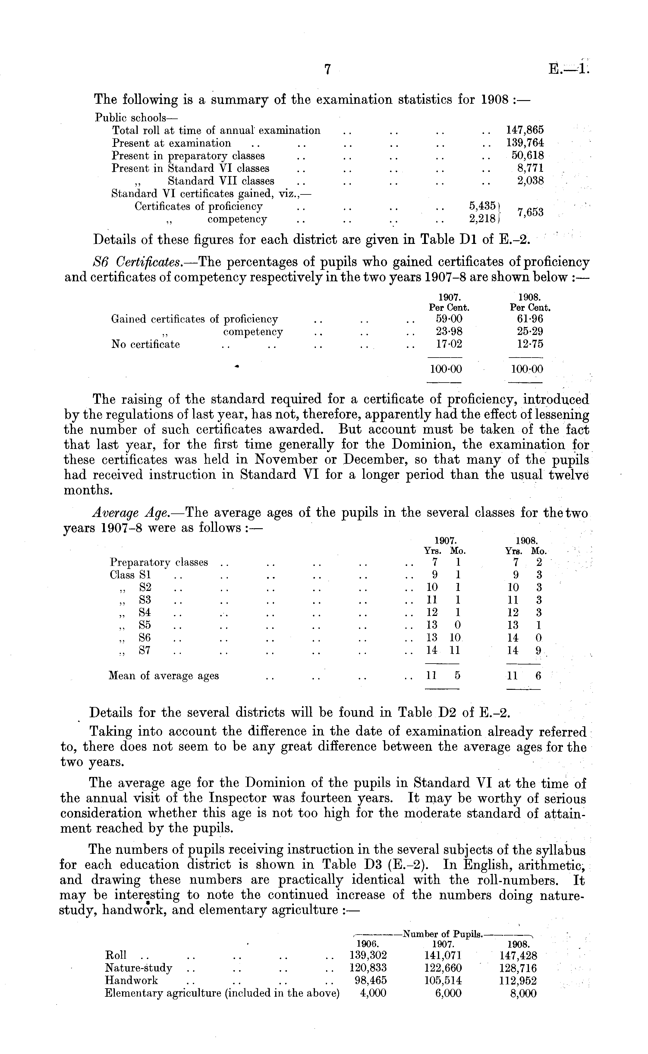 The following is a summary of the examination statistics for 1908 : — Public schools— Total roll at time of annual examination .. .. .. . . 147,865 Present at examination .. .. .. .. .. .. 139,764 Present in preparatory classes .. .. .. .. .. 50,618 Present in Standard VI classes .. .. .. .. .. 8,771 ~ Standard VII classes .. .. .. .. .. 2,038 Standard VI certificates gained, viz.,— Certificates of proficiency .. .. .. .. 5,435) _ „_„ ~ competency .. .. .. .. 2,218 j Details of these figures for each district are given in Table Dl of E.-2. S6 Certificates. —The percentages of pupils who gained certificates of proficiency and certificates of competency respectively in the two years 1907-8 are shown below :— 1907. 1908. Per Cent. Per Cent. Gained certificates of proficiency .. .. .. 59-00 61-96 competency .. .. . . 23-98 25-29 No certificate .. . . .. . . .. 17-02 12-75 100-00 100-00 The raising of the standard required for a certificate of proficiency, introduced by the regulations of last year, has not, therefore, apparently had the effect of lessening the number of such certificates awarded. But account must be taken of the fact that last year, for the first time generally for the Dominion, the examination for these certificates was held in November or December, so that many of the pupils had received instruction in Standard VI for a longer period than the usual twelve months. Average Age. —The average ages of the pupils in the several classes for the two years 1907-8 were as follows :— 1907. 1908. Yrs. Mo. Yrs. Mo. Preparatory classes .. .. .. .. ..71 72 Class 81 .. .. .. .. ..91 93 ~ S2 .. .. .. .. .. 10 1 10 3 „ S3 .. .. .. .. .. .. 11 1 11 3 „ S4 .-. .. .. .. .. 12 1 12 3 „ S5 .. .. .. .. .. .. 13 0 13 1 „ S6 .. .. .. .. .. .. 13 10 14 0 „ S7 .. .. .. .. .. .. 14 11 14 9 . Mean of average ages .. .. .. ..115 116 Details for the several districts will be found in Table D 2 of E.-2. Taking into account the difference in the date of examination already referred to, there does not seem to be any great difference between the average ages for the two years. The average age for the Dominion of the pupils in Standard VI at the time of the annual visit of the Inspector was fourteen years. It may be worthy of serious consideration whether this age is not too high for the moderate standard of attainment reached by the pupils. The numbers of pupils receiving instruction in the several subjects of the syllabus for each education district is shown in Table D 3 (E.-2). In English, arithmetic, and drawing these numbers are practically identical with the roll-numbers. It may be interesting to note the continued increase of the numbers doing naturestudy, handwork, and elementary agriculture : — , Number of Pupils. , 1906. 1907. 1908. Roll .. .. .. .. .. 139,302 141,071 147,428 Nature-study .. .. .. .. 120,833 122,660 128,716 Handwork . . . . .. . . 98,465 105,514 112,952 Elementary agriculture (included in the above) 4,000 6,000 8,000