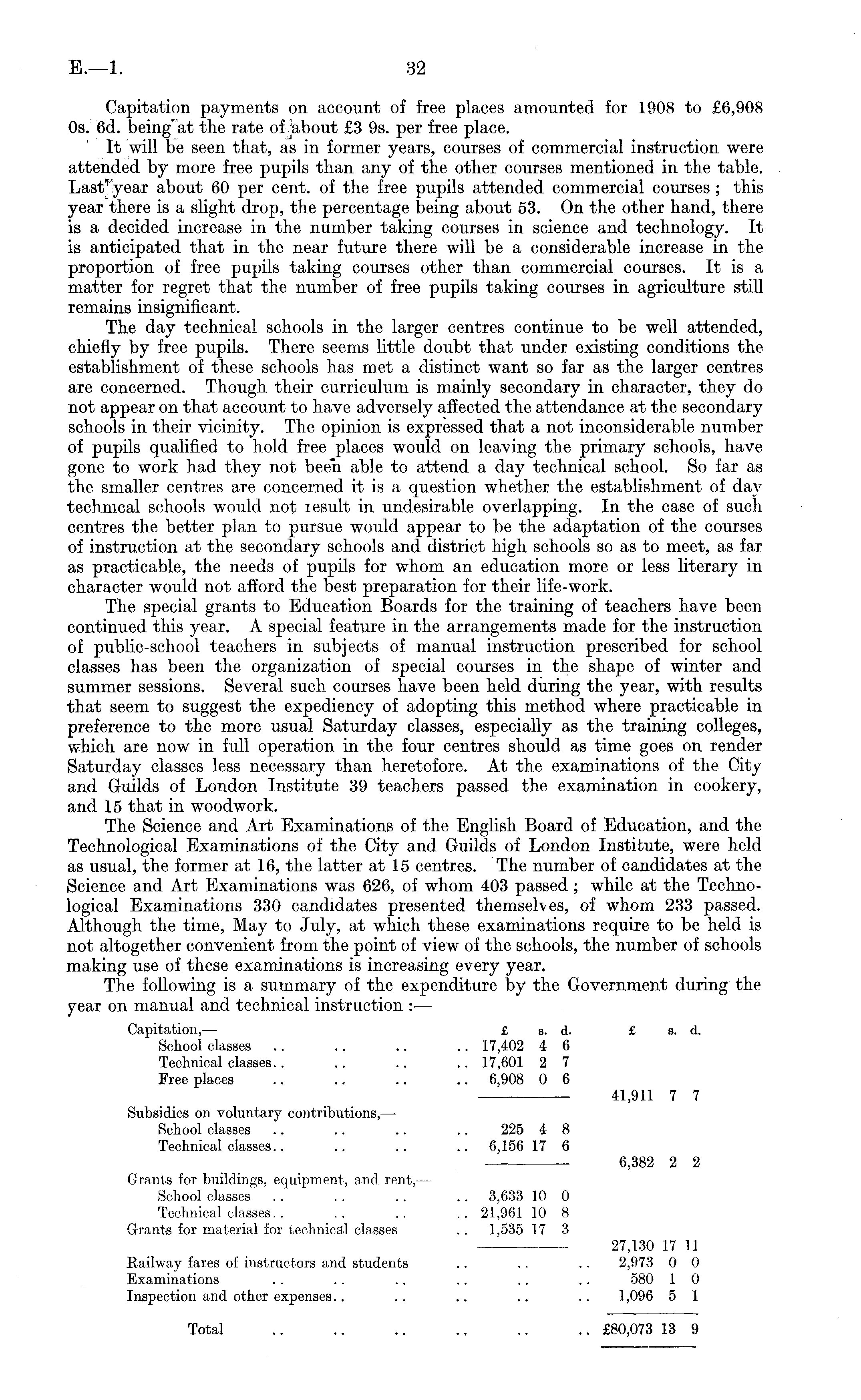 Capitation payments on account of free places amounted for 1908 to £6,908 os. 6d. being'at the rate £3 9s. per free place. It will be seen that, as in former years, courses of commercial instruction were attended by more free pupils than any of the other courses mentioned in the table. Last T year about 60 per cent, of the free pupils attended commercial courses ; this year there is a slight drop, the percentage being about 53. On the other hand, there is a decided increase in the number taking courses in science and technology. It is anticipated that in the near future there will be a considerable increase in the proportion of free pupils taking courses other than commercial courses. It is a matter for regret that the number of free pupils taking courses in agriculture still remains insignificant. The day technical schools in the larger centres continue to be well attended, chiefly by free pupils. There seems little doubt that under existing conditions the establishment of these schools has met a distinct want so far as the larger centres are concerned. Though their curriculum is mainly secondary in character, they do not appear on that account to have adversely affected the attendance at the secondary schools in their vicinity. The opinion is expressed that a not inconsiderable number of pupils qualified to hold free places would on leaving the primary schools, have gone to work had they not been able to attend a day technical school. So far as the smaller centres are concerned it is a question whether the establishment of day technical schools would not result in undesirable overlapping. In the case of such centres the better plan to pursue would appear to be the adaptation of the courses of instruction at the secondary schools and district high schools so as to meet, as far as practicable, the needs of pupils for whom an education more or less literary in character would not afford the best preparation for their life-work. The special grants to Education Boards for the training of teachers have been continued this year. A special feature in the arrangements made for the instruction of public-school teachers in subjects of manual instruction prescribed for school classes has been the organization of special courses in the shape of winter and summer sessions. Several such courses have been held during the year, with results that seem to suggest the expediency of adopting this method where practicable in preference to the more usual Saturday classes, especially as the training colleges, which are now in full operation in the four centres should as time goes on render Saturday classes less necessary than heretofore. At the examinations of the City and Guilds of London Institute 39 teachers passed the examination in cookery, and 15 that in woodwork. The Science and Art Examinations of the English Board of Education, and the Technological Examinations of the City and Guilds of London Institute, were held as usual, the former at 16, the latter at 15 centres. The number of candidates at the Science and Art Examinations was 626, of whom 403 passed ; while at the Technological Examinations 330 candidates presented themselves, of whom 233 passed. Although the time, May to July, at which these examinations require to be held is not altogether convenient from the point of view of the schools, the number of schools making use of these examinations is increasing every year. The following is a summary of the expenditure by the Government during the year on manual and technical instruction : — Capitation,— £ s. d. £ s. d. School classes .. .. .. .. 17,402 4 6 Technical classes.. .. .. .. 17,601 2 7 Free places .. .. .. .. 6,908 0 6 41,911 7 7 Subsidies on voluntary contributions, — School classes .. .. .. .. 225 4 8 Technical classes.. .. .. .. 6,156 17 6 6,382 2 2 Grants for buildings, equipment, and rent, — School classes .. .. .. .. 3,633 10 0 Technical classes.. .. .. .. 21,961 10 8 Grants for material for technical classes .. 1,535 17 3 27,130 17 11 Railway fares of instructors and students .. .. .. 2,973 0 0 Examinations .. .. .. .. .. .. 580 1 0 Inspection and other expenses.. .. .. .. .. 1,096 5 1 Total .. .. .. .. .. .. £80,073 13 9