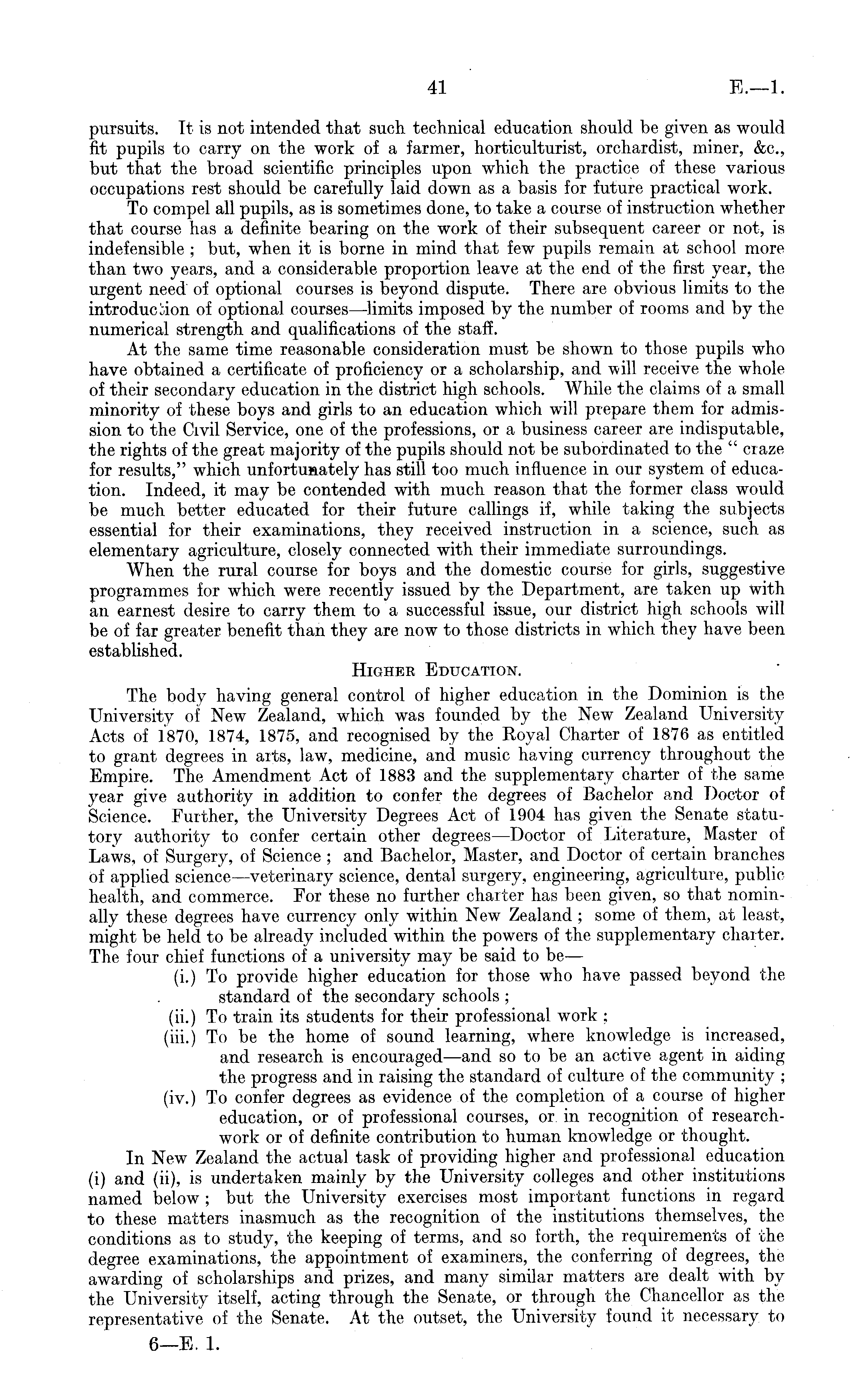 pursuits. Tt is not intended that such technical education should be given as would fit pupils to carry on the work of a farmer, horticulturist, orchardist, miner, &c, but that the broad scientific principles upon which the practice of these various occupations rest should be carefully laid down as a basis for future practical work. To compel all pupils, as is sometimes done, to take a course of instruction whether that course has a definite bearing on the work of their subsequent career or not, is indefensible ; but, when it is borne in mind that few pupils remain at school more than two years, and a considerable proportion leave at the end of the first year, the urgent need of optional courses is beyond dispute. There are obvious limits to the introduction of optional courses—limits imposed by the number of rooms and by the numerical strength and qualifications of the staff. At the same time reasonable consideration must be shown to those pupils who have obtained a certificate of proficiency or a scholarship, and will receive the whole of their secondary education in the district high schools. While the claims of a small minority of these boys and girls to an education which will prepare them for admission to the Civil Service, one of the professions, or a business career are indisputable, the rights of the great majority of the pupils should not be subordinated to the " craze for results," which unfortunately has still too much influence in our system of education. Indeed, it may be contended with much reason that the former class would be much better educated for their future callings if, while taking the subjects essential for their examinations, they received instruction in a science, such as elementary agriculture, closely connected with their immediate surroundings. When the rural course for boys and the domestic course for girls, suggestive programmes for which were recently issued by the Department, are taken up with an earnest desire to carry them to a successful issue, our district high schools will be of far greater benefit than they are now to those districts in which they have been established. Higher Education. The body having general control of higher education in the Dominion is the University of New Zealand, which was founded by the New Zealand University Acts of 1870, 1874, 1875, and recognised by the Royal Charter of 1876 as entitled to grant degrees in arts, law, medicine, and music having currency throughout the Empire. The Amendment Act of 1883 and the supplementary charter of the same year give authority in addition to confer the degrees of Bachelor and Doctor of Science. Further, the University Degrees Act of 1904 has given the Senate statutory authority to confer certain other degrees—Doctor of Literature, Master of Laws, of Surgery, of Science ; and Bachelor, Master, and Doctor of certain branches of applied science—veterinary science, dental surgery, engineering, agriculture, public health, and commerce. For these no further charter has been given, so that nominally these degrees have currency only within New Zealand ; some of them, at least, might be held to be already included within the powers of the supplementary charter. The four chief functions of a university may be said to be— (i.) To provide higher education for those who have passed beyond the standard of the secondary schools ; (ii.) To train its students for their professional work ; (iii.) To be the home of sound learning, where knowledge is increased, and research is encouraged—and so to be an active agent in aiding the progress and in raising the standard of culture of the community ; (iv.) To confer degrees as evidence of the completion of a course of higher education, or of professional courses, or in recognition of researchwork or of definite contribution to human knowledge or thought. In New Zealand the actual task of providing higher and professional education (i) and (ii), is undertaken mainly by the University colleges and other institutions named below ; but the University exercises most important functions in regard to these matters inasmuch as the recognition of the institutions themselves, the conditions as to study, the keeping of terms, and so forth, the requirements of the degree examinations, the appointment of examiners, the conferring of degrees, the awarding of scholarships and prizes, and many similar matters are dealt with by the University itself, acting through the Senate, or through the Chancellor as the representative of the Senate. At the outset, the University found it necessary to 6—E. 1.