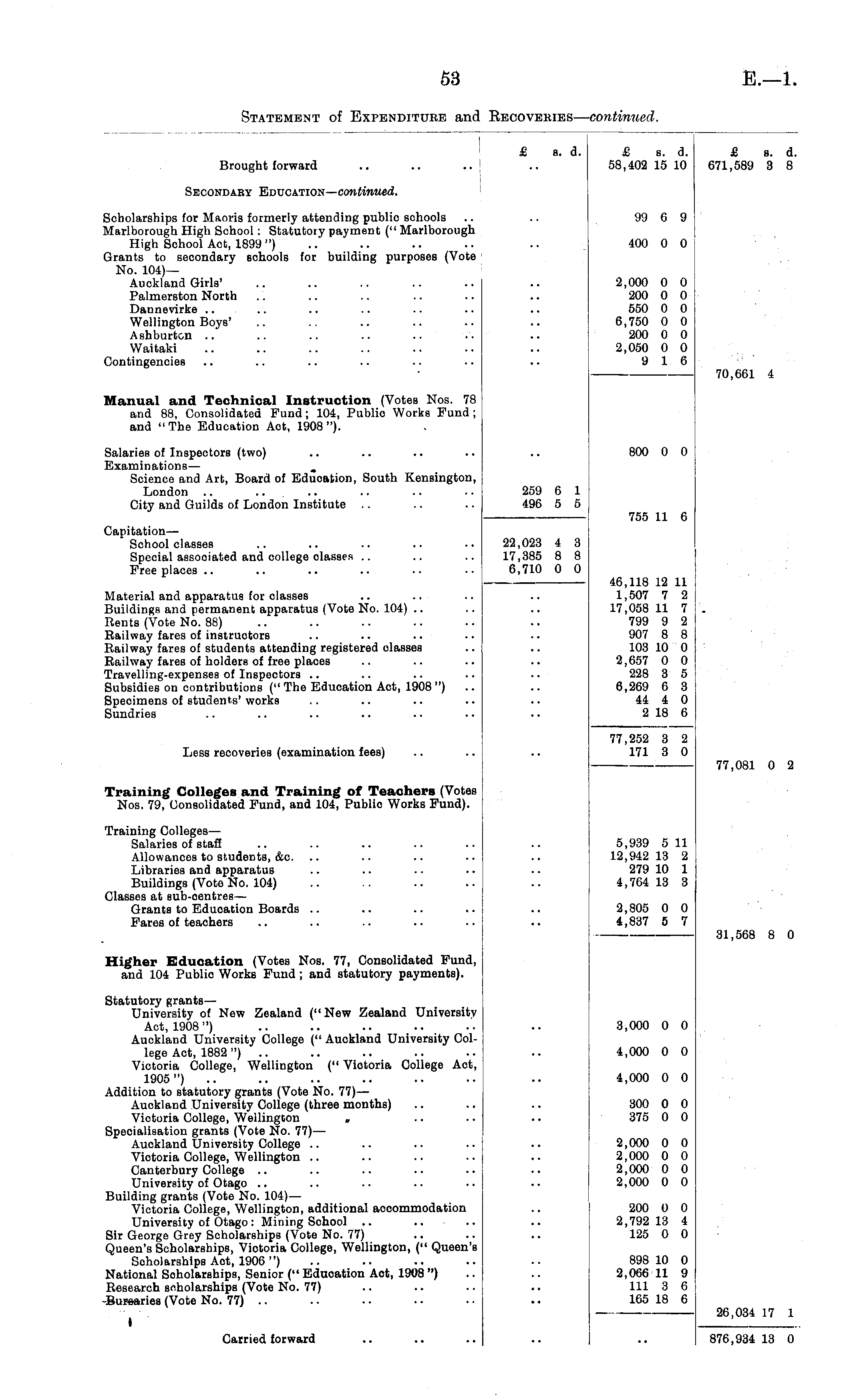 Brought forward S. b. d. £ a. d. 58,402 15 10 £ s. d 671,589 3 8 - Secondary Education— continued. 99 6 9 Scholarships for Maoris formerly attending public schools Marlborough High School : Statutory payment (" Marlborough High School Act, 1899 ") Grants to secondary schools for building purposes (Vote No. 104)— Auckland Girls' Palmerston North Dannevirke Wellington Boys' Ashburt&n .. Waitaki Contingencies 400 0 0 2,000 0 0 200 0 0 550 0 0 6,750 0 0 200 0 0 2,050 0 0 9 16 70,661 4 Manual and Technical Instruction (Votes Nos. 78 and 88, Consolidated Fund; 104, Public Works Fund ; and "The Education Aot, 1908"). 800 0 0 Salaries of Inspectors (two) Examinations — . Science and Art, Board of Education, South Kensington, London .. City and Guilds of London Institute 259 6 1 496 5 5 755 11 6 Capitation— School classes Special associated and college olasses Free places .. 22,023 4 3 17,385 8 8 6,710 0 0 22,023 4 3 17,385 8 8 6,710 0 0 46,118 12 11 1,507 7 2 17,058 11 7 799 9 2 907 8 8 103 10 0 2,657 0 0 228 3 5 6,269 6 3 44 4 0 2 18 6 Material and apparatus for classes Buildings and permanent apparatus (Vote No. 104) Rents (Vote No. 88) Railway fares of instructors Railway fares of students attending registered classes Railway fares of holders of free places Travelling-expenses of Inspectors Subsidies on contributions (" The Education Act, 1908 ") Specimens of students' works Sundries Less recoveries (examination fees) 77,252 3 2 171 3 0 77,081 0 2 Training Colleges and Training of Teachers (Votes Nos. 79, Consolidated Fund, and 104, Publio Works Fund). Training Colleges— Salaries of staff Allowances to students, &c. Libraries and apparatus Buildings (Vote No. 104) Classes at sub-oentres — Grants to Eduoation Boards Fares of teachers 5,939 5 11 12,942 13 2 279 10 1 4,764 13 3 2,805 0 0 4,837 5 7 Higher Education (Votes Nos. 77, Consolidated Fund, and 104 Public Works Fund ; and statutory payments). 31,568 8 0 Statutory grants— University of New Zealand ("New Zealand University Act, 1908") Auckland University College (" Auckland University College Act, 1882 ") .. Victoria College, Wellington (" Victoria College Act, 1905") Addition to statutory grants (Vote No. 77)— Auokland University College (three months) Viotoria College, Wellington „ Specialisation grants (Vote No. 77) — Auckland University College Victoria College, Wellington Canterbury College University of Otago Building grants (Vote No. 104) — Victoria College, Wellington, additional accommodation University of Otago : Mining School Sir George Grey Scholarships (Vote No. 77) Queen's Scholarships, Victoria College, Wellington, (" Queen's Scholarships Act, 1906 ") National Scholarships, Senior (" Education Aot, 1908 ") Research scholarships (Vote No. 77) -Burearies (Vote No. 77) .. 3,000 0 0 4,000 0 0 4,000 0 0 300 0 0 375 0 0 2,000 0 0 2,000 0 0 2,000 0 0 2,000 0 0 200 0 0 2,792 13 4 125 0 0 898 10 0 2,066 11 9 111 3 6 165 18 6 26,034 17 1 I Carried forward 876,934 13 0
