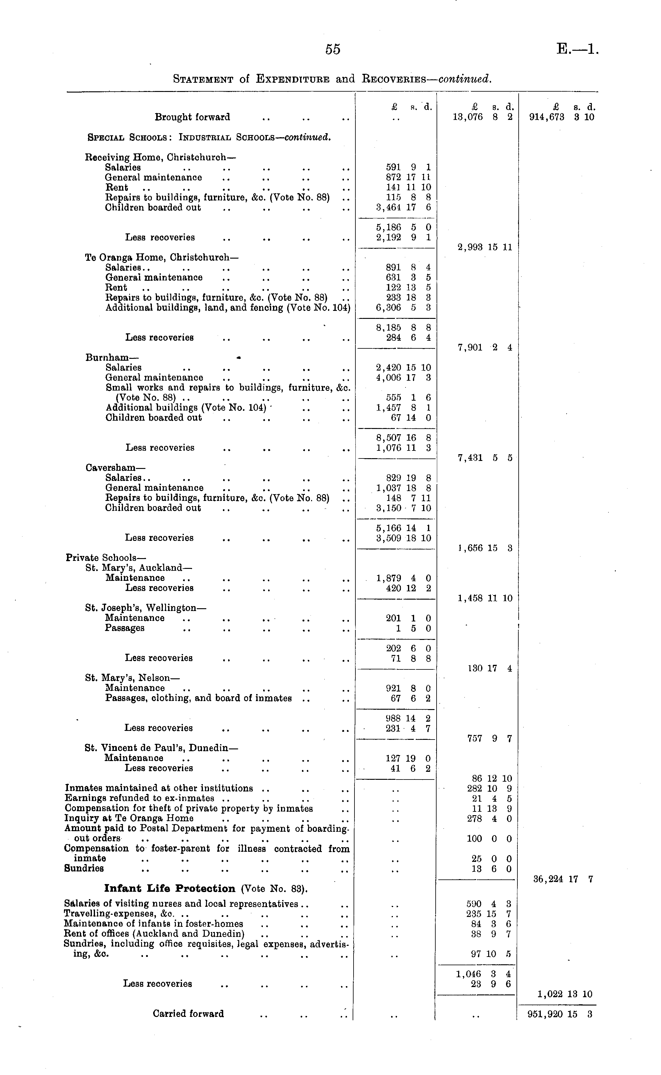 £ s. d. £ s. d. 13,076 8 2 £ s. d. 914,673 3 10 Brought forward Special Schools : Industrial Schools — continued. Receiving Home, Christohuroh — Salaries General maintenance Eent .. Repairs to buildings, furniture, &o. (Vote No. 88) Children boarded out 591 9 1 872 17 11 141 11 10 115 8 8 3,464 17 6 Less recoveries 5,186 5 0 2,192 9 1 Tβ Oranga Home, Christchurch — Salaries.. General maintenance Rent Repairs to buildings, furniture, &o. (Vote No. 88) Additional buildings, land, and fencing (Vote No. 104) 2,993 15 11 891 8 4 631 3 5 122 13 5 233 18 3 6,306 5 3 Less recoveries 8,185 8 8 284 6 4 Burnham — - Salaries General maintenance Small works and repairs to buildings, furniture, &c. (Vote No. 88) .. Additional buildings (Vote No. 104) ■ Children boarded out 7,901 2 4 2,420 15 10 4,006 17 3 555 1 6 1,457 8 1 67 14 0 Less recoveries 8,507 16 8 1,076 11 3 Caversham — Salaries.. General maintenance Repairs to buildings, furniture, &c. (Vote No. 88) Children boarded out 7,431 5 5 829 19 8 1,037 18 8 148 7 11 3,150 7 10 Less recoveries 5,166 14 1 3,509 18 10 Private Schools— St. Mary's, Auckland — Maintenance Less recoveries 1,656 15 3 1,879 4 0 420 12 2 1,458 11 10 St. Joseph's, Wellington— Maintenance .. .. Passages 201 1 0 15 0 Less recoveries 202 6 0 71 8 8 130 17 4 St. Mary's, Nelson— Maintenance Passages, clothing, and board of inmates 921 8 0 67 6 2 Less recoveries 988 14 2 231 4 7 757 9 7 St. Vincent de Paul's, Dunedin— Maintenance Lees recoveries 127 19 0 41 6 2 Inmates maintained at other institutions Earnings refunded to ex-inmates Compensation for theft of private property by inmates Inquiry at Te Oranga Home Amount paid to Postal Department for payment of boardingout orders Compensation to foster-parent for illness contracted from inmate Sundries 86 12 10 282 10 9 21 4 5 11 13 9 278 4 0 100 0 0 25 0 0 13 6 0 Infant Life Protection (Vote No. 83). Salaries of visiting nurses and local representatives .. Travelling-expenses, &o. .. Maintenance of infants in foster-homes Rent of offices (Auckland and Dunedin) Sundries, including office requisites, legal expenses, advertising, &o. 36,224 17 7 590 4 3 235 15 7 84 3 6 38 9 7 97 10 g Lees recoveries 1,046 8 4 23 9 6 1,022 13 10 Carried forward 951,920 15 3