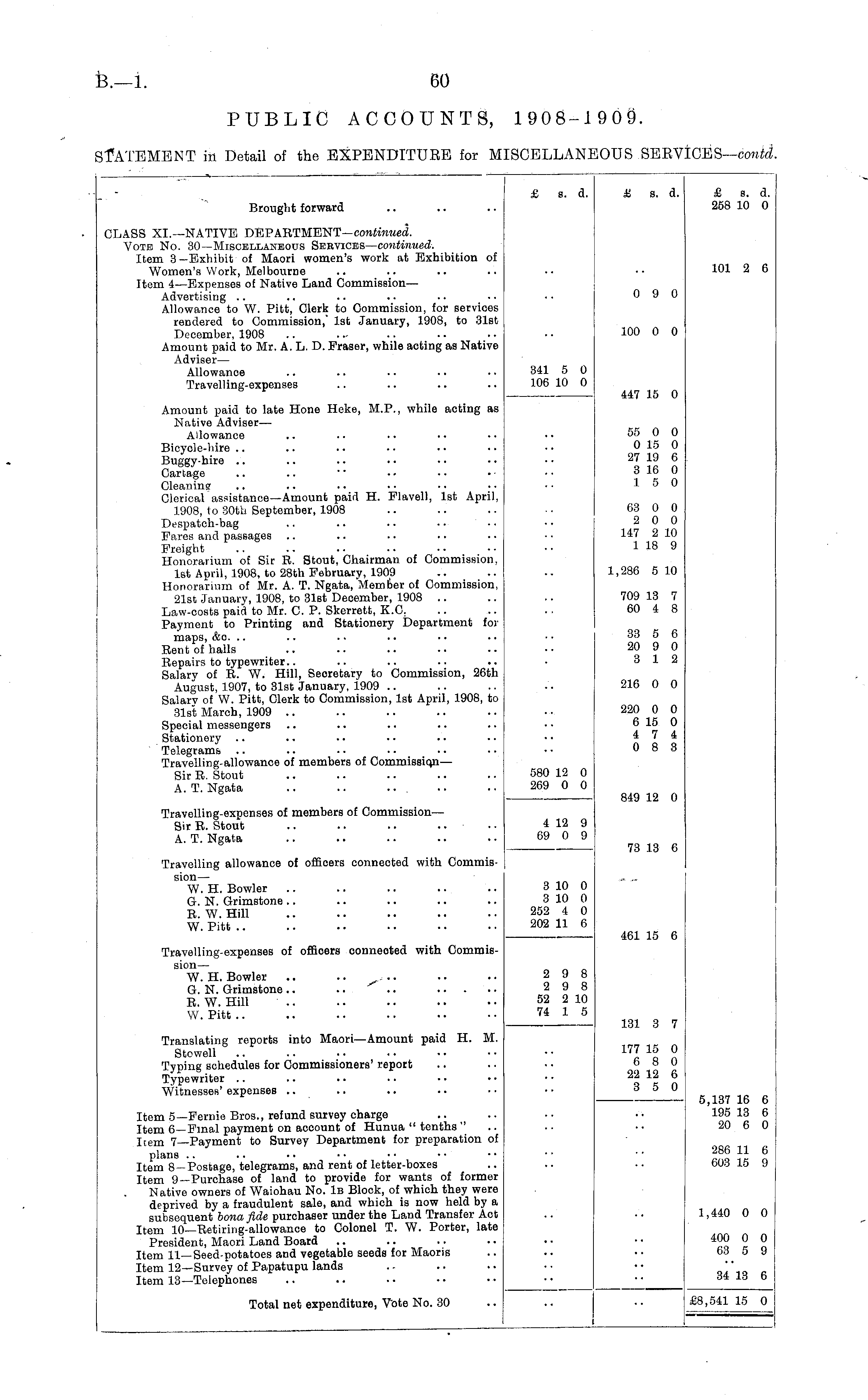 Brought forward £ s. d. £ s. d. £ s. d. 258 10 0 CLASS XL—NATIVE DEPARTMENT— continued. Vote No. 30—Miscellaneous Services— continued. Item 3—Exhibit of Maori women's work at Exhibition of Women's Work, Melbourne Item 4—Expenses of Native Land Commission — Advertising Allowance to W. Pitt, Clerk to Commission, for services rendered to Commission, 1st January, 1908, to 31st December, 1908 Amount paid to Mr. A. L. D. Fraser, while acting as Native Adviser— Allowance Travelling-expenses 0 9 0 101 2 6 100 0 0 341 5 0 106 10 0 447 15 0 Amount paid to late Hone Heke, M.P., while acting as Native Adviser— Allowance Bicycle-hire Buggy-hire .. Cartage Cleaning Clerical assistance—Amount paid H. Flavell, 1st April, 1908, to 30th September, 1908 Despatch-bag Fares and passages Freight Honorarium of Sir R. Stout, Chairman of Commission, 1st April, 1908, to 28th February, 1909 Honorarium of Mr. A. T. Ngata, Member of Commission, 21st January, 1908, to 31st December, 1908 Law-costs paid to Mr. C. P. Skerrett, K.C Payment to Printing and Stationery Department for maps, &c Rent of halls Repairs to typewriter.. Salarv of R. W. Hill, Seoretary to Commission, 26th August, 1907, to 31st January, i909 Salarv of W. Pitt, Clerk to Commission, 1st April, 1908, to 31st March, 1909 Special messengers Stationery Telegrams Travelling-allowance of members of Commission — SirR. Stout A. T. Ngata 55 0 0 0 15 0 27 19 6 3 16 0 15 0 63 0 0 2 0 0 147 2 10 1 18 9 1,286 5 10 709 13 7 60 4 8 33 5 6 20 9 0 3 12 216 0 0 220 0 0 6 15 0 4 7 4 0 8 3 580 12 0 269 0 0 849 12 0 Travelling-expenses of members of Commission — SirR. Stout A. T. Ngata 4 12 9 69 0 9 73 13 6 Travelling allowance of officers connected with Commission— W. H. Bowler G. N. Grimstone B.W.Hill W. Pitt .. 3 10 0 3 10 0 252 4 0 202 11 6 Travelling-expenses of officers conneoted with Commission— W. H. Bowler .. .. .. G. N. Grimstone .. .. .. R. W. Hill W. Pitt 461 15 6 2 9 8 2 9 8 52 2 10 74 1 5 131 3 7 Translating reports into Maori—Amount paid H. M. Stcwell Typing schedules for Commissioners' report Typewriter Witnesses' expenses 177 15 0 6 8 0 22 12 6 3 5 0 Item 5—Fernie Bros., refund survey charge Item 6—Final payment on account of Hunua " tenths " Item 7—Payment to Survey Department for preparation of plans Item 8- Postage, telegrams, and rent of letter-boxes Item 9—Purchase of land to provide for wants of former Native owners of Waiohau No. 1b Block, of which they were deprived by a fraudulent sale, and which is now held by a subsequent bona fide purchaser under the Land Transfer Act Item 10—Retiring-allowance to Colonel T. W. Porter, late President, Maori Land Board Item 11—Seed-potatoes and vegetable seeds for Maoris Item 12—Survey of Papatupu lands Item 13—Telephones 5,137 16 6 195 13 6 20 6 0 286 11 6 603 15 9 1,440 0 0 400 0 0 63 5 9 34 13 6 Total net expenditure, Vote No. 30 £8,541 15 0