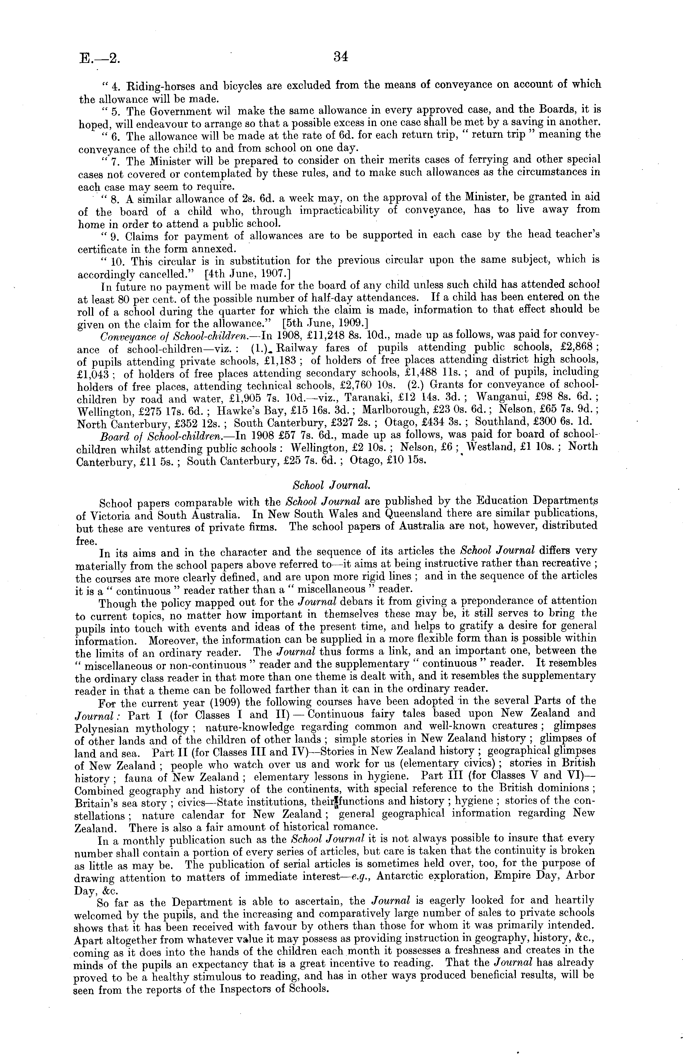 " 4. Riding-horses and bicycles are excluded from the means of conveyance on account of which the allowance will be made. " 5. The Government wil make the same allowance in every approved case, and the Boards, it is hoped, will endeavour to arrange so that a possible excess in one case shall be met by a saving in another. " 6. The allowance will be made at the rate of 6d. for each return trip, " return trip " meaning the conveyance of the child to and from school on one day. " 7. The Minister will be prepared to consider on their merits cases of ferrying and other special cases not covered or contemplated by these rules, and to make such allowances as the circumstances in each case may seem to require. "8. A similar allowance of 2s. 6d. a week may, on the approval of the Minister, be granted in aid of the board of a child who, through impracticability of conveyance, has to live away from home in order to attend a public school. " 9. Claims for payment of allowances are to be supported in each case by the head teacher's certificate in the form annexed. " 10. This circular is in substitution for the previous circular upon the same subject, which is accordingly cancelled." [4th June, 1907.] 1 n future no payment will be made for the board of any child unless such child has attended school at least 80 per cent, of the possible number of half-day attendances. If a child has been entered on the roll of a school during the quarter for which the claim is made, information to that effect should be given on the claim for the allowance." [sth June, 1909.] Conveyance, of School-children. —In 1908, £11,248 Bs. 10d., made up as follows, was paid for conveyance of school-children —viz. : (1.). Railway fares of pupils attending public schools, £2,868 ; of pupils attending private schools, £1,183 ; of holders of free places attending district high schools, £1,043 ; of holders of free places attending secondary schools, £1,488 11s. ; and of pupils, including holders of free places, attending technical schools, £2,760 10s. (2.) Grants for conveyance of schoolchildren by road and water, £1,905 7s. 10d.—viz., Taranaki, £12 14s. 3d. ; Wanganui, £98 Bs. 6d. ; Wellington, £275 17s. 6d. ; Hawke's Bay, £15 16s. 3d.; Marlborough, £23 os. 6d.; Nelson, £65 7s. 9d.; North Canterbury, £352 12s. ; South Canterbury, £327 2s. ; Otago, £434 3s. ; Southland, £300 6s. Id. Board of School-chiUrm.— ln 1908 £57 7s. 6d., made up as follows, was paid for board of schoolchildren whilst attending public schools : Wellington, £2 10s. ; Nelson, £6 ; _ Westland, £1 10s. ; North Canterbury, £11 ss. ; South Canterbury, £25 7s. 6d. ; Otago, £10 15s. School Journal. School papers comparable with the School Journal are published by the Education Departments of Victoria and South Australia. In New South Wales and Queensland there are similar publications, but these are ventures of private firms. The school papers of Australia are not, however, distributed free. In its aims and in the character and the sequence of its articles the School Journal differs very materially from the school papers above referred to —it aims at being instructive rather than recreative ; the courses are more clearly denned, and are upon more rigid lines ; and in the sequence of the articles it is a " continuous " reader rather than a " miscellaneous " reader. Though the policy mapped out for the Journal debars it from giving a preponderance of attention to current topics, no matter how important in themselves these may be, it still serves to bring the pupils into touch with events and ideas of the present time, and helps to gratify a desire for general information. Moreover, the information can be supplied in a more flexible form than is possible within the limits of an ordinary reader. The Journal thus forms a link, and an important one, between the " miscellaneous or non-continuous " reader and the supplementary " continuous " reader. It resembles the ordinary class reader in that more than one theme is dealt with, and it resembles the supplementary reader in that a theme can be followed farther than it can in the ordinary reader. For the current year (1909) the following courses have been adopted in the several Parts of the Journal: Part I (for Classes I and II) — Continuous fairy tales based upon New Zealand and Polynesian mythology ; nature-knowledge regarding common and well-known creatures ; glimpses of other lands and of the children of other lands ; simple stories in New Zealand history ; glimpses of land and sea. Part II (for Classes 111 and IV)—Stories in New Zealand history ; geographical glimpses of New Zealand ; people who watch over us and work for us (elementary civics) ; stories in British history ; fauna of New Zealand ; elementary lessons in hygiene. Part 111 (for Classes V and Vl)— Combined geography and history of the continents, with special reference to the British dominions ; Britain's sea story ; civics—State institutions, their|functions and history ; hygiene ; stories of the constellations ; nature calendar for New Zealand ; genera.] geographical information regarding New Zealand. There is also a fair amount of historical romance. In a monthly publication such as the School Journal it is not always possible to insure that every number shall contain a portion of every series of articles, but care is taken that the continuity is broken as little as may be. The publication of serial articles is sometimes held over, too, for the purpose of drawing attention to matters of immediate interest — e.g., Antarctic exploration, Empire Day, Arbor Day, &c. So far as the Department is able to ascertain, the Journal is eagerly looked for and heartily welcomed by the pupils, and the increasing and comparatively large number of sales to private schools shows that it has been received with favour by others than those for whom it was primarily intended. Apart altogether from whatever value it may possess as providi