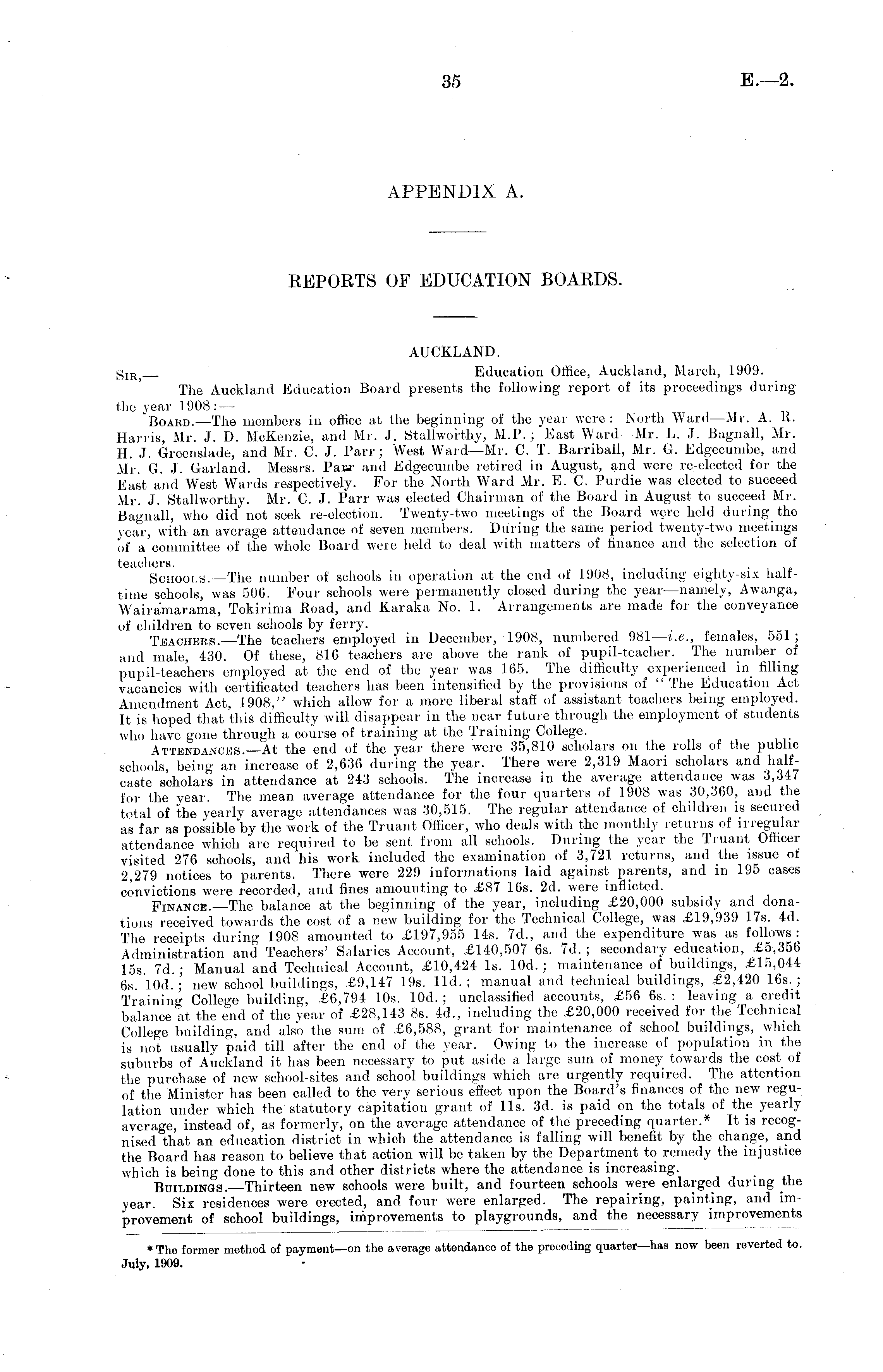 AUCKLAND. Ui Education OHice, Auckland, March, 1909. The Auckland Education Board presents the following report of its proceedings during the year 1908: — Boahd. —The members in office at the beginning of the year were: North Ward Mr. A. K. Harris, Mr. J. D. McKonzie., and Mr. ,1. Ktallwoithy, M.1 , .; East Ward—Mr. L. J. Bagnall, Mr. H. J. (ireenslade, and Mr. C. J. Pan'; West Ward—Mr. €. T. Barriball, Mr. G. Edgecumbe, and Mi. G. .1. Garland. Messrs. Paw and Edgecumbe retired in August, and were re-elected for the East and West Wards respectively. For the North Ward Mr. E. C. Purdie was elected to succeed Mr. J. Stallworthy. Mr. C. J. Parr was elected Chairman of (lie Board in August to succeed Mr. Bagnall, who did not seek re-election. Twenty-two meetings of the Hoard were held during the year, with an average attendance of seven members. During the same period twenty-two inert ings of a committee of the whole Board were held to deal with matters of finance and the selection of teaohere. Schools.—The number of schools in operation at the end of 1908, including eighty-six halftime schools, was 506. Four schools were permanently closed during the year — namely, Awanga, Wairamarama, Tokirima Itoad, and Karaka No. 1. Arrangements are made for the conveyance of children to seven schools by ferry. Teachers. —The teachers employed in December, 19G8, numbered 981— i.e., females, 551; and male, 430. Of these, 816 teachers are above the rank of pupil-teacher. The number of pupil-teachers employed at the end of the year was 105. The difficulty experienced in filling vacancies with certificated teachers lias been intensified by the provisions of " The Education Act Amendment Act, 1908," which allow for a more liberal stall of assistant teachers being employed. It is hoped that this difficulty will disappear in the near future through the employment of students who have gone through a course of training at the Training College. Attendances. At the end of the year there were 35,810 scholars on the rolls of the public schools, being an increase of 2,036 during the year. There were 2,.'519 Maori scholars ami halfcaste scholars in attendance at 243 schools. The increase in the average attendance was 3,347 for the year. The mean average attendance for the four quarters of 1908 was 30,360, and Hie total of the yearly average attendances was 30,515. The regular attendance of children is secured as far as possible'by the work of the Truant Officer, who deals with the monthly returns of irregular attendance which are required to be sent from all schools. During the year the Truant Officer visited 276 schools, and his work included the examination of 3,721 returns, and the issue of 2,279 notices to parents. There were 229 informations laid against parents, and in 195 cases convictions were recorded, and lines amounting to £87 16s. 2d. were inflicted. Finance. The balance at the beginning of the year, including £20,000 subsidy and donations received towards the cost of a new building for the Technical College, was £19,939 17s. 4d. The receipts during 1908 amounted to £197,955 14s. 7d., and the expenditure was as follows: Administration and Teachers' Salaries Account, £140,507 6s. 7d. ; secondary education, C 5,356 15s. 7d.; Manual and Technical Account, £10,424 Is. 10d. ; maintenance of buildings, £15,044 (is IOd.; new school buildings, 1:9,147 19s. lid.; manual and technical buildings, £2,420 165.; Training College building £6,794 10s. 10d. ; unclassified accounts, £56 6s. : leaving a credit balance at the end of the year of £28,143 Bs. 4d., including the £20,000 received for the Technical College building, and also the sum of £6,588, grant for maintenance of school buildings, which is not usually paid till after the end of the year. Owing to the increase of population in the suburbs of Auckland it has been necessary to put aside a large sum of money towards the cost of the purchase of new school-sites and school buildings which are urgently required. The attention of the Minister has been called to the very serious effect upon the Board's finances of the new regulation under which the statutory capitation grant of Us. 3d. is paid on the totals of the yearly average, instead of, as formerly, on the average attendance of the preceding quarter.* It is recognised that an education district in which the attendance is falling will benefit by the change, and the Board has reason to believe that action will be taken by the Department to remedy the injustice which is being done to this and other districts where the attendance is increasing. Buildings. Thirteen new schools were built, and fourteen schools were enlarged during the year. Six residences were erected, and four were enlarged. The repairing, painting, and improvement of school buildings, improvements to playgrounds, and the necessary improvements