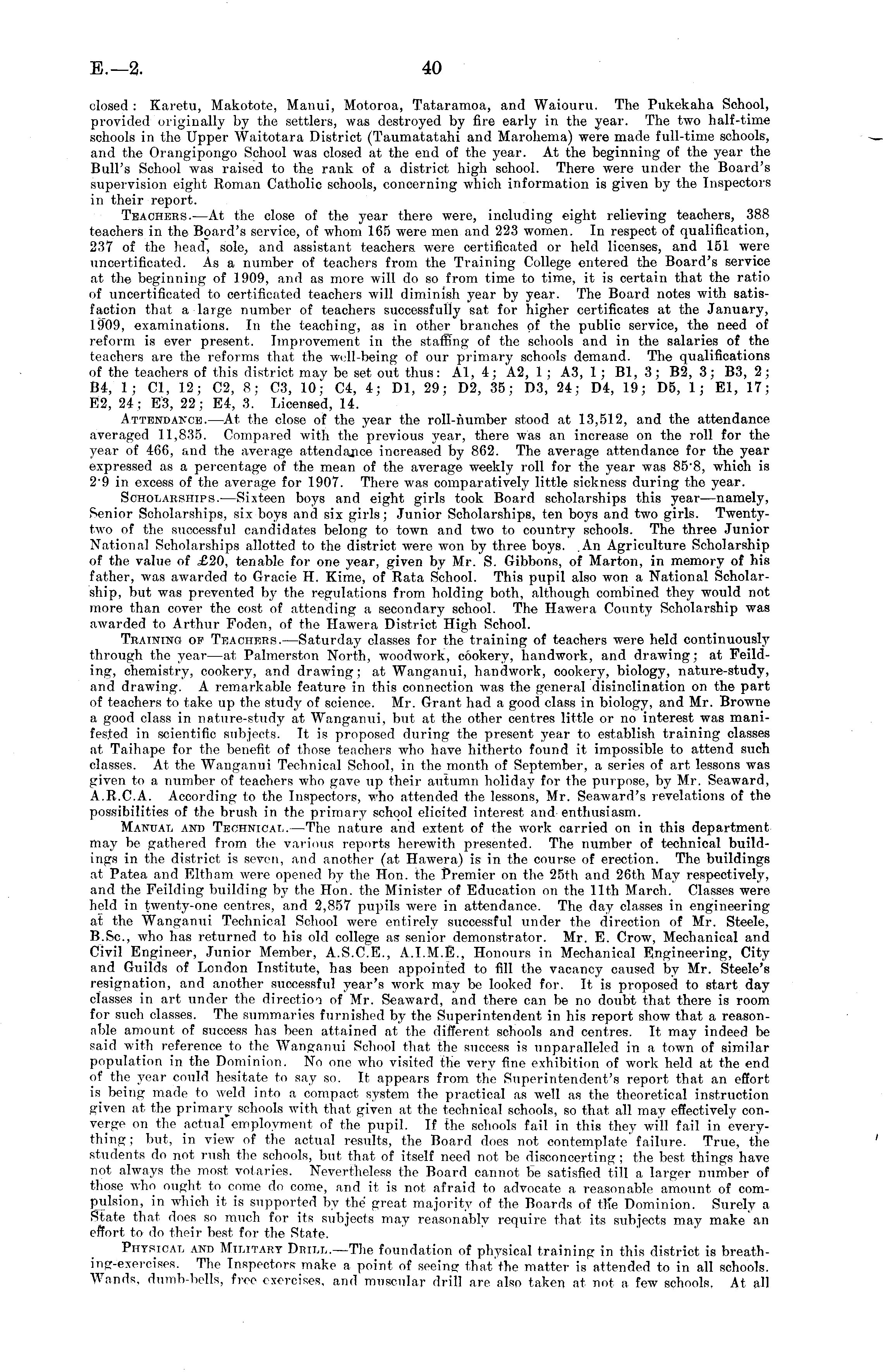 closed : Karetu, Makotote, Manui, Motoroa, Tataramoa, and Waiouru. The Pukekaha School, provided originally by the settlers, was destroyed by fire early in the year. The two half-time schools in the Upper Waitotara District (Taumatatahi and Marohema) were made full-time schools, and the Orangipongo School was closed at the end of the year. At the beginning of the year the Bull's School was raised to the rank of a district high school. There were under the Board's supervision eight Roman Catholic schools, concerning which information is given by the Inspectors in their report. Thacheks.—At the close of the year there were, including eight relieving teachers, 388 teachers in the Board's service, of whom 165 were men and 223 women. In respect of qualification, 237 of the head, sole, and assistant teachers were certificated or held licenses, and 151 were uncertificated. As a number of teachers from the Training College entered the Board's service at the beginning of 1909, and as more will do so from time to time, it is certain that the ratio of uncertificated to certificated teachers will diminish year by year. The Board notes with satisfaction that a large number of teachers successfully sat for higher certificates at the January, 1909, examinations. In the teaching, as in other branches of the public service, the need of reform is ever present. Improvement in the staffing of the schools and in the salaries of the teachers are the reforms that the well-being of our primary schools demand. The qualifications of the teachers of this district may be set out thus: Al, 4; A 2, 1 ; A3, 1 ; 81, 3; 82, 3; 83, 2 ; 84, 1; CI, 12; C 2, 8: C 3, 10; C 4, 4; Dl, 29; D 2, 35; D 3, 24; D 4, 19; D 5, 1; El, 17; K2, 24; E3, 22; E4, 3. Licensed, 14. Attendance.—At the close of the year the roll-number stood at 13,512, and the attendance averaged 11,835. Compared with the previous j'ear, there was an increase on the roll for the year of 466, and the average attendance increased by 862. The average attendance for the year expressed as a percentage of the mean of the average weekly roll for the year was 85"8, which is 29 in excess of the average for 1907. There was comparatively little sickness during the year. Scholarships.—Sixteen boys and eight girls took Board scholarships this year—namely, Senior Scholarships, six boys and six girls; Junior Scholarships, ten boys and two girls. Twentytwo of the successful candidates belong to town and two to country schools. The three Junior National Scholarships allotted to the district were won by three boys. An Agriculture Scholarship of the value of .£2O, tenable for one year, given by Mr. S. Gibbons, of Marton, in memory of his father, was awarded to Gracie H. Kime, of Rata School. This pupil also won a National Scholarship, but was prevented by the regulations from holding both, although combined they would not more than cover the cost of attending a secondary school. The Hawera County Scholarship was awarded to Arthur Foden, of the Hawera District High School. Training op Teachers.—Saturday classes for the training of teachers were held continuously through the year —at Palmerston North, woodwork, cookery, handwork, and drawing; at Feilding, chemistry, cookery, and drawing; at Wanganui, handwork, cookery, biology, nature-study, and drawing. A remarkable feature in this connection was the general disinclination on the part of teachers to take up the study of science. Mr. Grant had a good class in biology, and Mr. Browne a good class in nature-study at Wanganui, but at the other centres little or no interest was manifested in scientific subjects. It is proposed during the present year to establish training classes at Taihape for the benefit of those teachers who have hitherto found it impossible to attend such classes. At the Wanganui Technical School, in the month of September, a series of art lessons was given to a number of teachers who gave up their autumn holiday for the purpose, by Mr. Seaward, A.R.C.A. According to the Inspectors, who attended the lessons, Mr. Seawards revelations of the possibilities of the brush in the primary school elicited interest and-enthusiasm. Manual and Technical.— The nature and extent of the work carried on in this department may be gathered from the various reports herewith presented. The number of technical buildings in the district is seven, and another (at Hawera) is in the course of erection. The buildings at Patea and Eltham were opened I>\- tin l Hon. the Premier on the 25th and 26th May respectively, and the Feilding building by the Hon. the Minister of Education on the 11th March. Classes were held in twenty-one centres, and 2,857 pupils were in attendance. The day classes in engineering at the Wanganui Technical School were entirely successful under the direction of Mr. Steele, B.Sc, who has returned to his old college as senior demonstrator. Mr. E. Crow, Mechanical and Civil Engineer, Junior Member, A.S.C.E., A.1.M.E., Honours in Mechanical Engineering, City and Guilds of London Institute, has been appointed to fill the vacancy caused by Mr. Steele's resignation, and another successful year's work may be looked for. It is proposed to start day classes in art under the direction of Mr. Seaward, and there can be no doubt that there is room for such classes. The summaries furnished by the Superintendent in his report show that a reasonable amount of success has been attained at the different schools and centres. It may indeed be said with reference to the Wanganui School that the success is unparalleled in a town of similar population in the Dominion. No one who visited the very fine exhibition of work held at the end of the year could hesitate to say so. It appears from the Superintendent's report that an effort is being made to weld into a compact system the practical as well as the theoretical instruction given at the primary schools with that given at the technical schools, so that all may effectively conve
