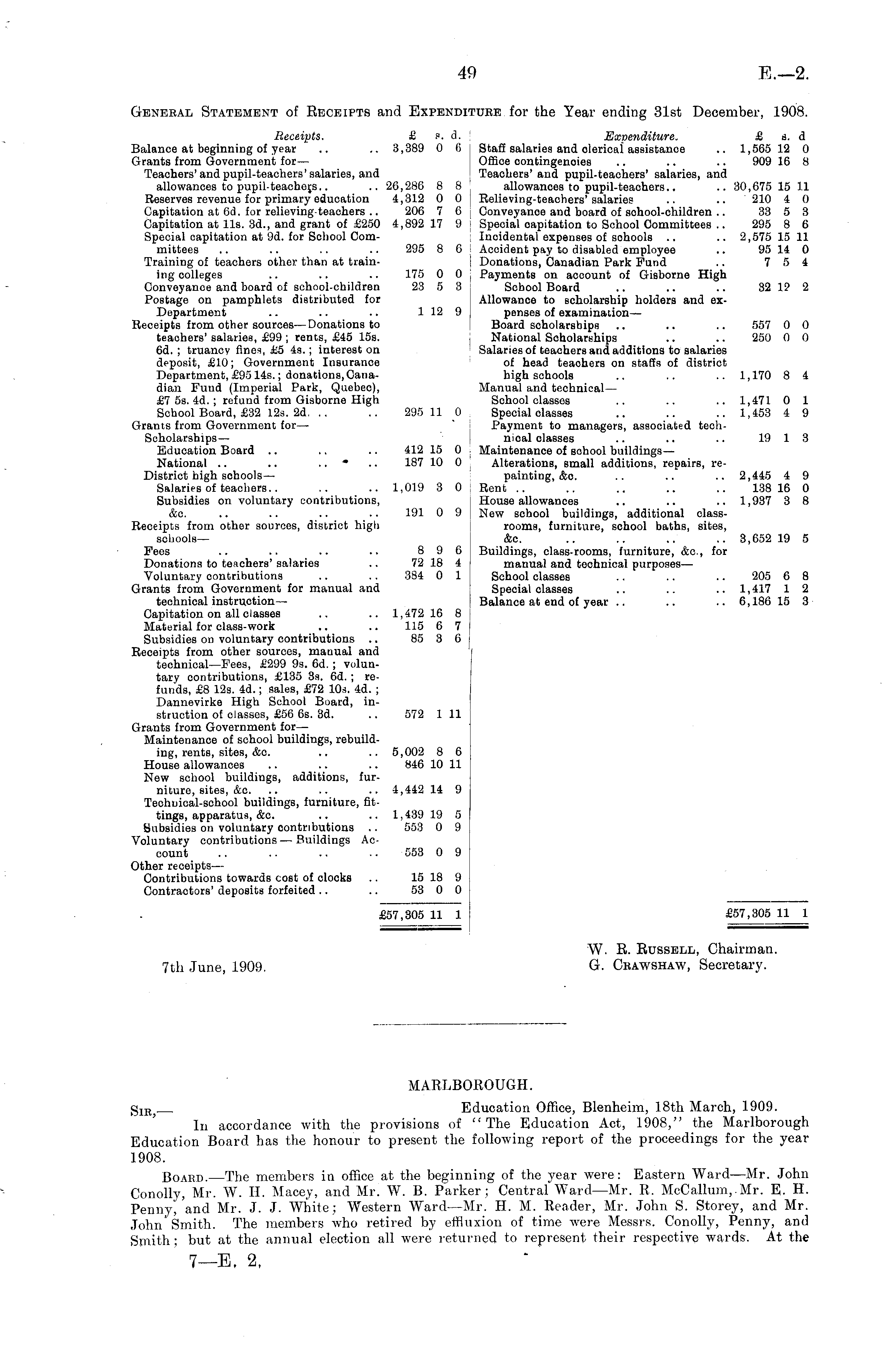 MARYBOROUGH. g IR) Education Office, Blenheim, 18th March, 1909. In accordance with the provisions of "The Education Act, 1908," the Marlborough Education Board has the honour to present the following report of the proceedings for the year 1908. Board. —The members in office at the beginning of the year were: Eastern Ward —Mr. John Conolly, Mr. W. H. Macey, and Mr. W. B. Parker; Central Ward —Mr. R. McCallum,.Mr. E. H. Penny,'and Mr. J. J. White; Western Ward —Mr. H. M. Reader, Mr. John S. Storey, and Mr. John Smith. The members who retired by effluxion of time were Messrs. Conolly, Penny, and Smith ; but at the annual election all were returned to represent their respective wards. At the 7—E. 2,