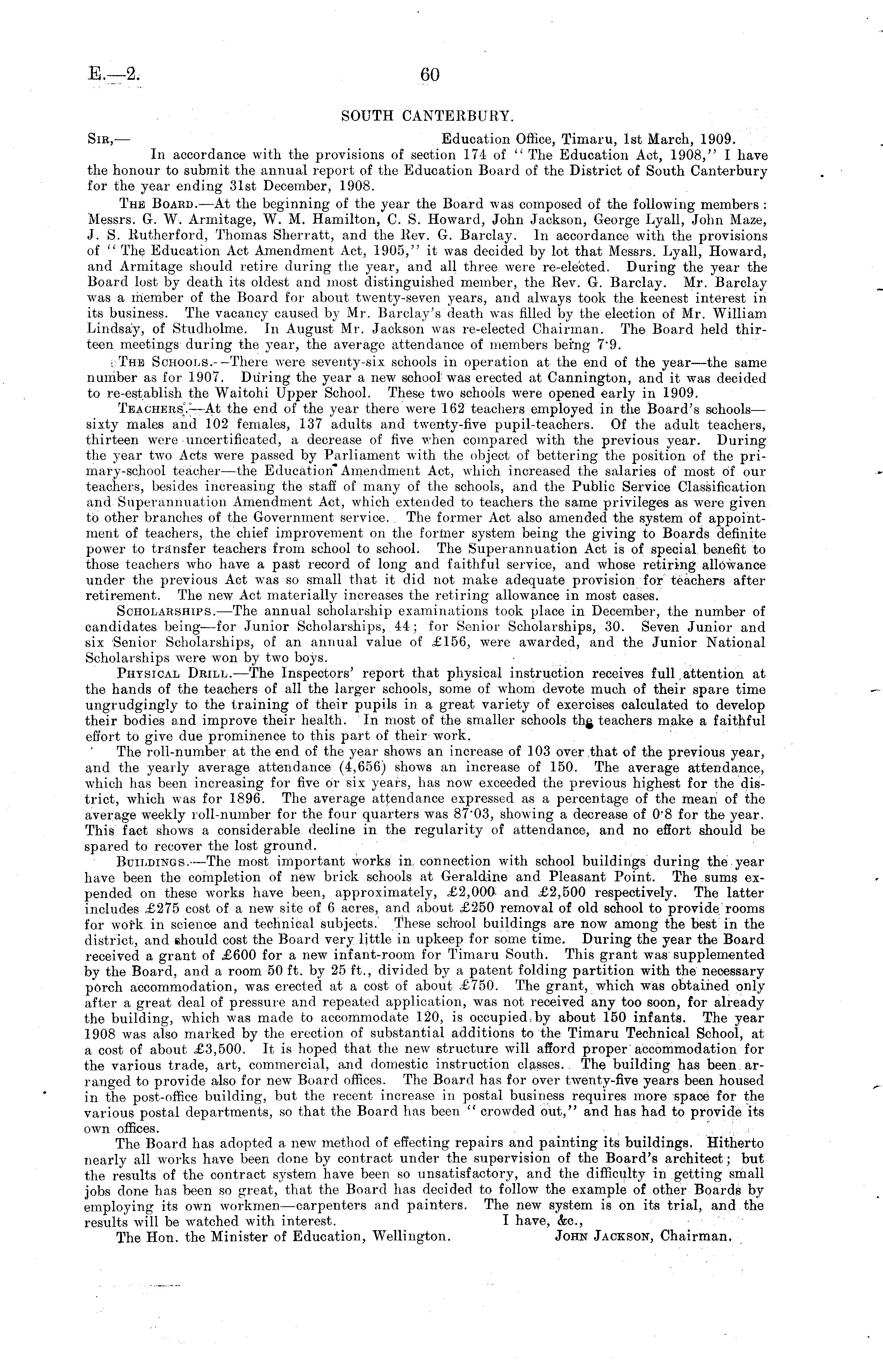 SOUTH CANTERBURY. Sic, — Education Office, Timaru, Ist March, 1909. In accordance with the provisions of section 174 of " The Education Act, 1908," I have the honour to submit the annual report of the Education Board of the District of South Canterbury for the year ending 31st December, 1908. The Board. —At the beginning of the year the Board was composed of the following members : Messrs. G. W. Armitage, W. M. Hamilton, C. S. Howard, John Jackson, George Lyall, John Maze, J. S. Rutherford, Thomas Sherratt, and the Rev. G. Barclay. In accordance with the provisions of " The Education Act Amendment Act, 1905," it was decided by lot that Messrs. Lyall, Howard, and Armitage should retire during the year, and all three were re-elected. During the year the Board lost by death its oldest and most distinguished member, the Rev. G. Barclay. Mr. Barclay was a member of the Board For about twenty-seven years, and always took the keenest interest in its business. The vacancy caused by Mr. Barclay's death was filled by the election of Mr. William Lindsay, of Studholme. In August Mr. Jackson was re-elected Chairman. The Board held thirteen meetings during the year, the average attendance of members being 79. Tbsb Schools.-—There were seventy-six schools in operation at the end of the year—the same number as for 1907. During the year a new school was erected at Cannington, and it was decided to re-establish the Waitohi Upper School. These two schools were opened early in 1909. Teachers. —At the end of the year there were 162 teachers employed in the Board's schools — sixty males and 102 females, 137 adults and twenty-five pupil-teachers. Of the adult teachers, thirteen were imcertificated, a decrease of five when compared with the previous year. During the year two Acts were passed by Parliament with the object of bettering the position of the pri-mary-school teacher—the Education" Amendment Act, which increased the salaries of most of our teachers, besides increasing the staff of many of the schools, and the Public Service Classification and Superannuation Amendment Act, which extended to teachers the same privileges as were given to other branches of the Government service. . The former Act also amended the system of appointment of teachers, the chief improvement on the fornier system being the giving to Boards definite power to transfer teachers from school to school. The Superannuation Act is of special benefit to those teachers who have a past record of long and faithful service, and whose retiring allowance under the previous Act was so small that it did not make adequate provision for teachers after retirement. The new Act materially increases the retiring allowance in most cases. Scholarships.—The annual scholarship examinations took place in December, the number of candidates being —for Junior Scholarships, 44; for Senior Scholarships, 30. Seven Junior and six Senior Scholarships, of an annual value of £156, were awarded, and the Junior National Scholarships were won by two boys. Physical Drill. —The Inspectors' report that physical instruction receives full attention at the hands of the teachers of all the larger schools, some of whom devote much of their spare time ungrudgingly to the training of their pupils in a great variety of exercises calculated to develop their bodies and improve their health. In most of the smaller schools thg teachers make a faithful effort to give due prominence to this part of their work. The roll-number at the end of the year shows an increase of 103 over that of the previous year, and the yearly average attendance (4,656) shows an increase of 150. The average attendance, which has been increasing for five or six years, has now exceeded the previous highest for the district, which was for 1896. The average attendance expressed as a percentage of the mean of the average weekly roll-number for the four quarters was 8703, showing a decrease of oB for the year. This fact shows a considerable decline in the regularity of attendance, and no effort should be spared to recover the lost ground. Buildings.—The most important works in, connection with school buildings during the year have been the completion of new brick schools at Geraldine and Pleasant Point. The sums expended on these works have been, approximately, £2,000 and £2,500 respectively. The latter includes £275 cost of a new site of 6 acres, and about £250 removal of old school to provide rooms for work in science and technical subjects. These school buildings are now among the best in the district, and should cost the Board very little in upkeep for some time. During the year the Board received a grant of £600 for a new infant-room for Timaru South. This grant was supplemented by the Board, and a room 50 ft. by 25 ft., divided by a patent folding partition with the necessary porch accommodation, was erected at a cost of about £750. The grant, which was obtained only after a great deal of pressure and repeated application, was not received any too soon, for already the building, which was made to accommodate 120, is occupied by about 150 infants. The year 1908 was also marked by the erection of substantial additions to the Timaru Technical School, at a cost of about £3,500. It is hoped that the new structure will afford proper accommodation for the various trade, art, commercial, and domestic instruction classes. The building has been arranged to provide also for new Board offices. The Board has for over twenty-five years been housed in the post-office building, but the recent increase in postal business requires more space for the various postal departments, so that the Board has been " crowded out," and has had to provide its own offices. The Board has adopted a new method of effecting repairs and painting its buildings. Hitherto nearly all works have been done by contract under the supervision of the Board's architect; but the results of the contract system have been so unsati