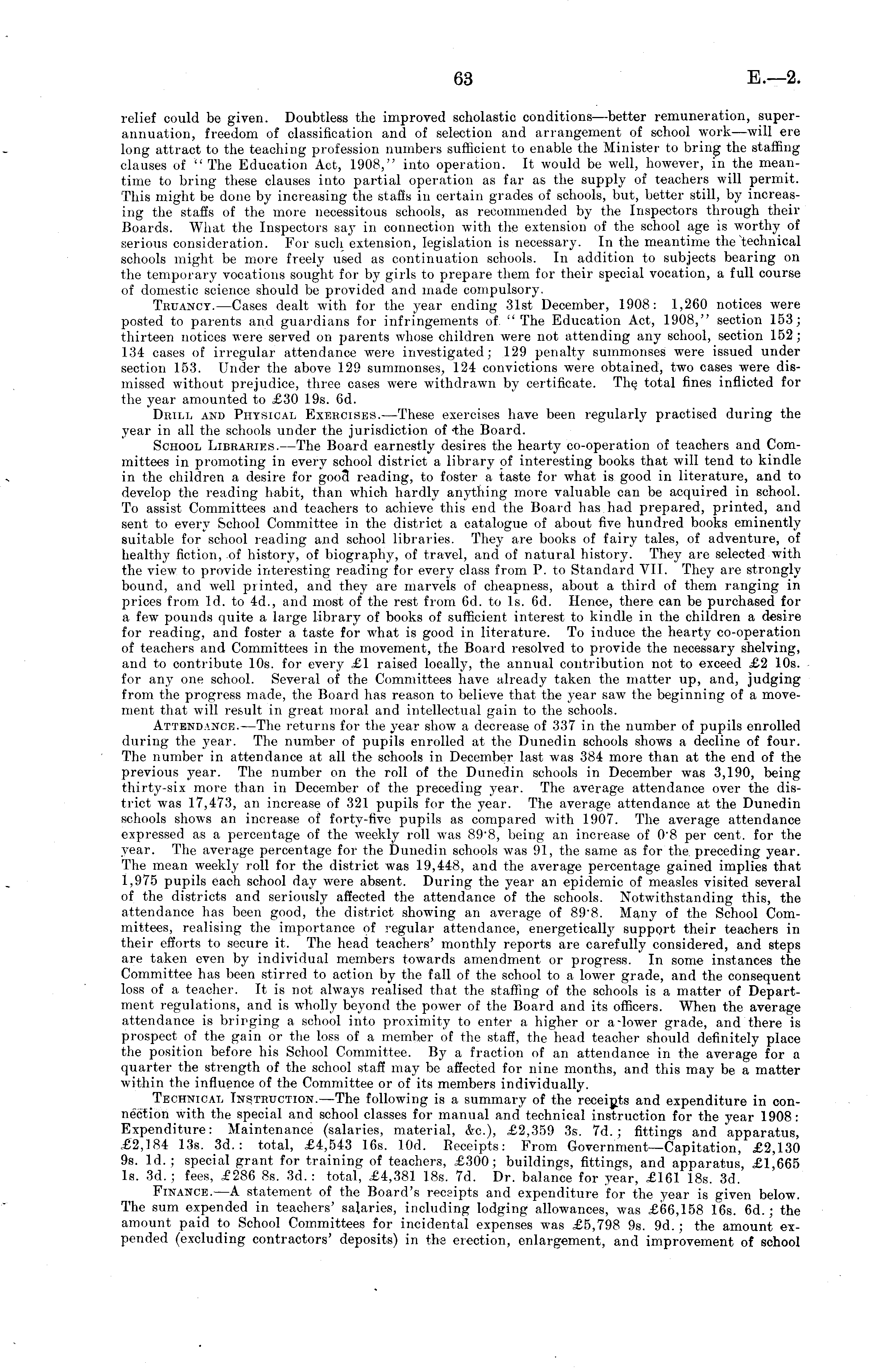 relief could be given. Doubtless the improved scholastic conditions —better remuneration, superannuation, freedom of classification and of selection and arrangement of school work— will ere long attract to the teaching profession numbers sufficient to enable the Minister to bring the staffingclauses of "The Education Act, 1908," into operation. It would be well, however, in the meantime to bring these clauses into partial operation as far as the supply of teachers will permit. This might be done by increasing the staffs in certain grades of schools, but, better still, by increasing the staffs of the more necessitous schools, as recommended by the Inspectors through their Boards. What the Inspectors say in connection with the extension of the school age is worthy of serious consideration. For such extension, legislation is necessary. In the meantime the'technical schools might be more freely used as continuation schools. In addition to subjects bearing on the temporary vocations sought for by girls to prepare them for their special vocation, a full course of domestic science should be provided and made compulsory. Truancy.—Cases dealt with for the year ending 31st December, 1908: 1,260 notices were posted to parents and guardians for infringements of "The Education Act, 1908," section 153; thirteen notices were served on parents whose children were not attending any school, section 152; 134 cases of irregular attendance were investigated; 129 penalty summonses were issued under section 153. Under the above 129 summonses, 124 convictions were obtained, two cases were dismissed without prejudice, three cases were withdrawn by certificate. The total fines inflicted for the year amounted to £30 1.95. 6d. Drill and Physical Exercises.—These exercises have been regularly practised during the year in all the schools under the jurisdiction of -the Board. School Libraries.—The Board earnestly desires the hearty co-operation of teachers and Committees in promoting in every school district a library of interesting books that will tend to kindle in the children a desire for goo 3 reading, to foster a taste for what is good in literature, and to develop the reading habit, than which hardly anything more valuable can be acquired in school. To assist Committees and teachers to achieve this end the Board has had prepared, printed, and sent to every School Committee in the district a catalogue of about five hundred books eminently suitable for school reading and school libraries. The}r are books of fairy tales, of adventure, of healthy fiction, of history, of biography, of travel, and of natural history. They are selected with the view, to provide interesting reading for every class from P. to Standard VII. They are strongly bound, and well printed, and they are marvels of cheapness, about a third of them ranging in prices from Id. to 4d., and most of the rest from 6d. to Is. 6d. Hence, there can be purchased for a few pounds quite a large library of books of sufficient interest to kindle in the children a desire for reading, and foster a taste for what is good in literature. To induce the hearty co-operation of teachers and Committees in the movement, the Board resolved to provide the necessary shelving, and to contribute 10s. for every £1 raised locally, the annual contribution not to exceed £2 10s. for any one school. Several of the Committees have already taken the matter up, and, judging from the progress made, the Board has reason to believe that the year saw the beginning of a movement that will result in great moral and intellectual gain to the schools. Attendance.—The returns for the year show a decrease of 337 in the number of pupils enrolled during the year. The number of pupils enrolled at the Dunedin schools shows a decline of four. The number in attendance at all the schools in December last was 384 more than at the end of the previous year. The number on the roll of the Dunedin schools in December was 3,190, being thirty-six more than in December of the preceding The average attendance over the district was 17,473, an increase of 321 pupils for the year. The average attendance at the Dunedin schools shows an increase of forty-five pupils as compared with 1907. The average attendance expressed as a percentage of the weekly roll was 898, being an increase of oB per cent, for the year. The average percentage for the Dunedin schools was 91, the same as for the preceding year. The mean weekly roll for the district was 19,448, and the average percentage gained implies that 1,975 pupils each school day were absent. During the year an epidemic of measles visited several of the districts and seriously affected the attendance of the schools. Notwithstanding this, the attendance has been good, the district showing an average of 898. Many of the School Committees, realising the importance of regular attendance, energetically support their teachers in their efforts to secure it. The head teachers' monthly reports are carefully considered, and steps are taken even by individual members towards amendment or progress. In some instances the Committee has been stirred to action by the fall of the school to a lower grade, and the consequent loss of a teacher. It is not always realised that the staffing of the schools is a matter of Department regulations, and is wholly beyond the power of the Board and its officers. When the average attendance is bringing a school into proximity to enter a higher or a-lower grade, and there is prospect of the gain or the loss of a member of the staff, the head teacher should definitely place the position before his School Committee. By a fraction of an attendance in the average for a quarter the strength of the school staff may be affected for nine months, and this may be a matter within the influence of the Committee or of its members individually. Technical Instruction.—The following is a summary of the receipts and expenditure in connection with the specia