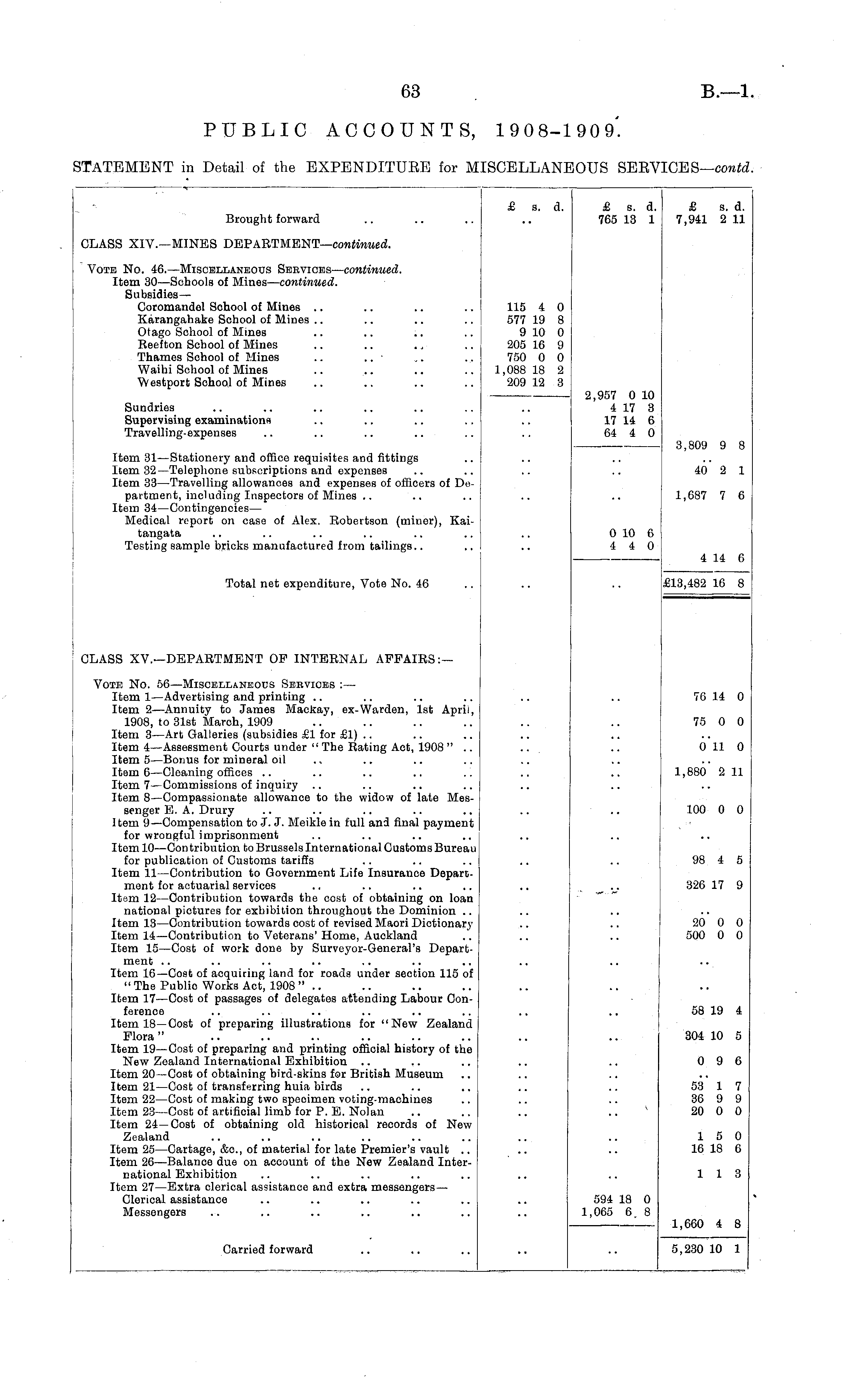 £ s. d. £ s. d. 765 13 1 £ s. d. 7,941 2 11 Brought forward CLASS XIV.—MINES DEPARTMENT— continued. Vote No. 46. —Miscellaneous Services — continued. Item 30—Schools of Mines — continued. Subsidies— Coromandel School of Mines Karangahake School of Mines Otago School of Mines Reefton School of Mines Thames School of Mines .. Waihi School of Mines Westport School of Mines 115 4 0 577 19 8 9 10 0 205 16 9 750 0 0 1,088 18 2 209 12 3 Sundries Supervising examinations Travelling-expenses 2,957 0 10 4 17 3 17 14 6 64 4 0 Item 31 —Stationery and office requisites and fittings Item 32 —Telephone subscriptions and expenses Item 33—Travelling allowances and expenses of officers of Department, including Inspectors of Mines .. Item 34—Contingencies— Medical report on case of Alex. Robertson (miner), Kaitangata Testing sample bricks manufactured from tailings.. 3,809 9 8 40' 2 1 1,687 7 6 0 10 6 4 4 0 4 14 6 Total net expenditure, Vote No. 46 £13,482 16 8 CLASS XV.—DEPARTMENT OF INTERNAL AFFAIRS:— Vote No. 56 —Miscellaneous Services :— Item 1—Advertising and printing Item 2—Annuity to James MacKay, ex-Warden, 1st April, 1908, to 31st March, 1909 Item 3 —Art Galleries (subsidies £1 for £1) Item 4—Assessment Courts under " The Rating Act, 1908 " .. Item 5—Bonus for mineral oil Item 6 —Cleaning offices Item 7 —Commissions of inquiry Item 8—Compassionate allowance to the widow of late Messenger E. A. Drury Item 9—Compensation to J. J. Meikle in full and final payment for wrongful imprisonment Item 10—Contribution to Brussels International Customs Bureau for publication of Customs tariffs Item 11—Contribution to Government Life Insurance Department for actuarial services Item 12 —Contribution towards the cost of obtaining on loan national pictures for exhibition throughout the Dominion .. Item 13—Contribution towards cost of revised Maori Dictionary Item 14—Contribution to Veterans' Home, Auckland Item 15—Cost of work done by Surveyor-General's Department Item 16—Cost of acquiring land for roads under section 115 of " The Publio Works Act, 1908 ".. Item 17 —Cost of passages of delegates attending Labour Conference Item 18—Cost of preparing illustrations for "New Zealand Flora" Item 19—Cost of preparing and printing official history of the New Zealand International Exhibition Item 20—Cost of obtaining bird-skins for British Museum Item 21—Cost of transferring huia birds Item 22—Cost of making two specimen voting-machines Item 23 —Cost of artificial limb for P. E. Nolan Item 24—Cost of obtaining old historical records of New Zealand Item 25—Cartage, &c, of material for late Premier's vault .. Item 26—Balanoe due on account of the New Zealand International Exhibition Item 27—Extra clerical assistance and extra messengers— Clerical assistance Messengers 76 14 0 75 0 0 6 11 0 1,880' 2 11 100 0 0 98 4 5 326 17 9 26' 0 0 500 0 0 58 19 4 304 10 5 0 9 6 53 1 7 36 9 9 20 0 0 15 0 16 18 6 113 594 18 0 1,065 6. 8 1,660 4 8 Carried forward 5,230 10 1