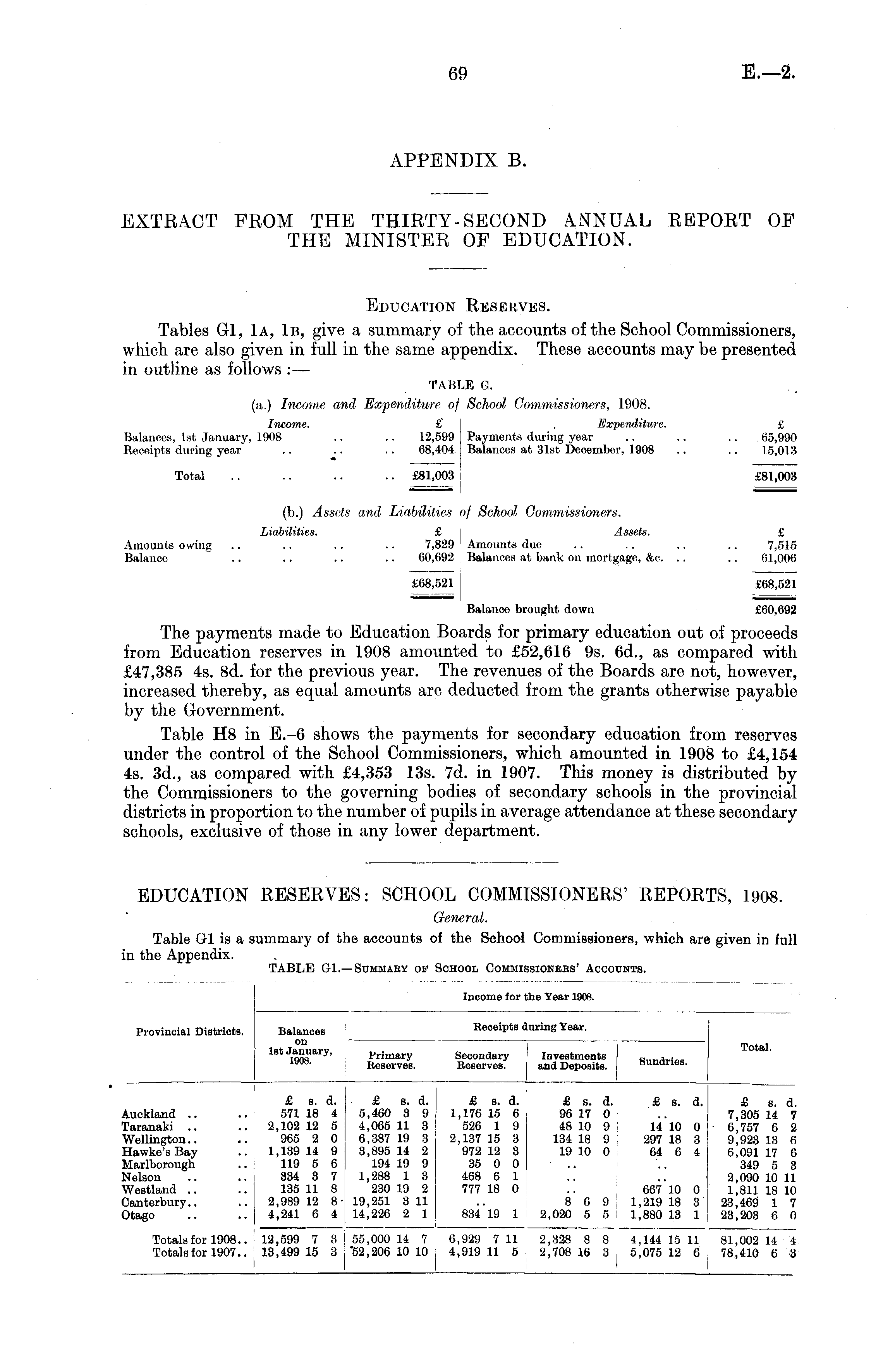 APPENDIX B. EXTKACT FROM THE THIRTY-SECOND ANNUAL BKPOBT OF THE MINISTER OF EDUCATION. Education Reserves. Tables G-l, lα, Iβ, give a summary of the accounts of the School Commissioners, which are also given in full in the same appendix. These accounts may be presented in outline as follows : — TABLE G. (a.) Income and Expenditure of School Commissioners, 1908. Income. £ . Expenditure. £ Balances, Ist January, 1908 .. .. 12,599 Payments during year .. .. .. 65,990 Receipts during year .. .. .. 68,404 Balances at 31st December, 1908 .. .. 15,013 Total .. .. .. .. £81,003 £81,003 (b.) Assets and Liabilities of School Commissioners. Liabilities. £ Assets. £ Amounts owing .. .. .. .. 7,829 Amounts due .. .. .. .. 7,515 Balance .. .. .. .. 60,692 Balances at bank ou mortgage, &c. .. .. 01,006 £68,521 £68,521 Balance brought down £60,692 The payments made to Education Boards for primary education out of proceeds from Education reserves in 1908 amounted to £52,616 9s. 6d., as compared with £47,385 4s. Bd. for the previous year. The revenues of the Boards are not, however, increased thereby, as equal amounts are deducted from the grants otherwise payable by the Government. Table H8 in E.-6 shows the payments for secondary education from reserves under the control of the School Commissioners, which amounted in 1908 to £4,154 4s. 3d., as compared with £4,353 13s. 7d. in 1907. This money is distributed by the Commissioners to the governing bodies of secondary schools in the provincial districts in proportion to the number of pupils in average attendance at these secondary schools, exclusive of those in any lower department.