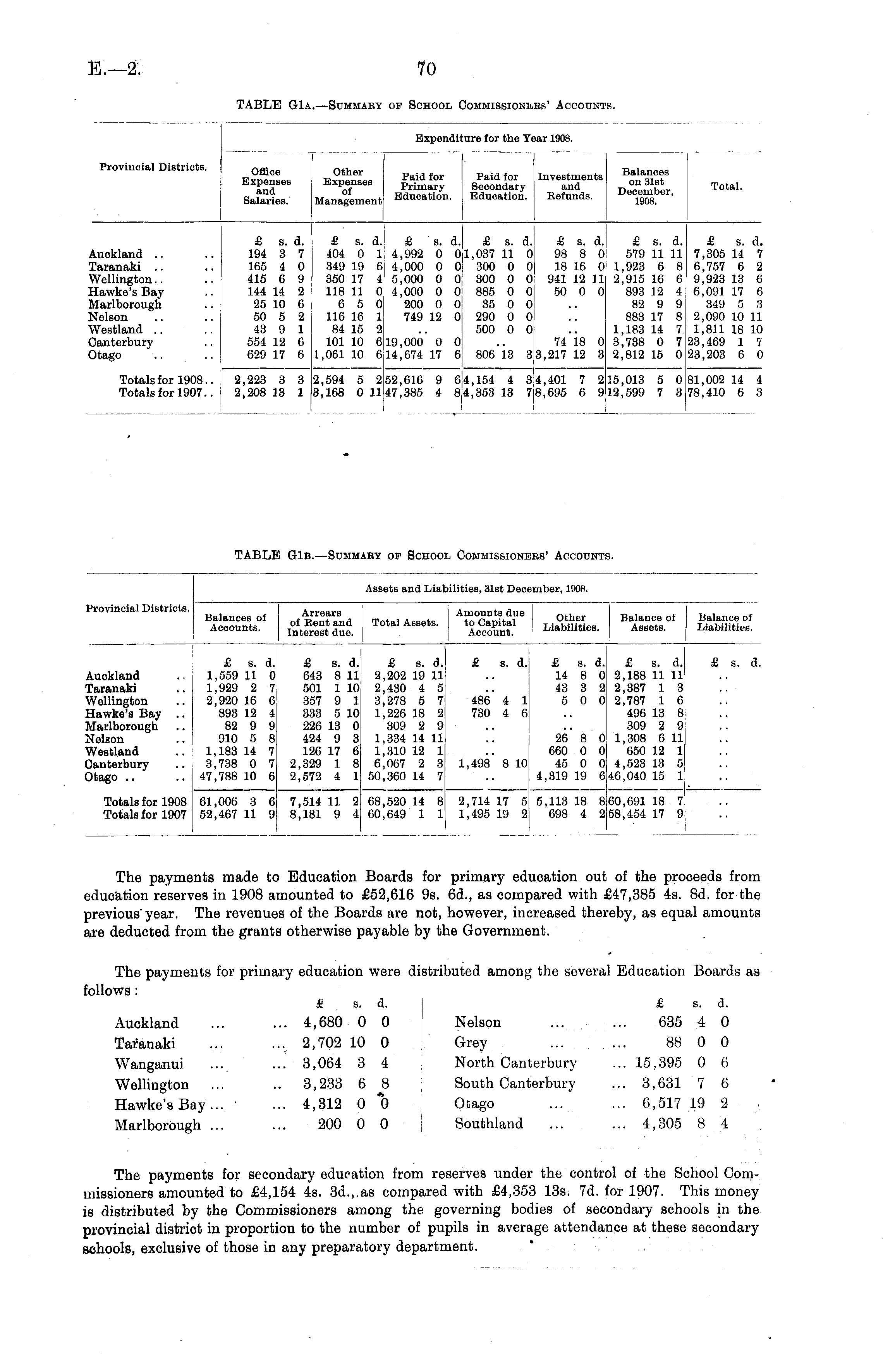 The payments made to Education Boards for primary education out of the proceeds from education reserves in 1908 amounted to £52,616 9s. 6d., as compared with £47,385 4s. Bd. for the previous" year. The revenues of the Boards are not, however, increased thereby, as equal amounts are deducted from the grants otherwise payable by the Government. The payments for primary education were distributed among the several Education Boards as follows: £ s. d. £ s. d. Auckland ... ... 4,680 0 0 Nelson ... ... 635 4 0 Taranaki 2,702 10 0 Grey 88 0 0 Wanganui ... ... 3,064 3 4 North Canterbury ... 15,395 0 6 Wellington ... .. 3,233 6 8 South Canterbury ... 3,631 7 6 Hawke's Bay... ■ ... 4,312 0 *0 Otago ... ... 6,517 19 2 Marlborough ... ... 200 0 0 Southland ... ... 4,305 8 4 The payments for secondary education from reserves under the control of the School Commissioners amounted to £4,154 4s. 3d.,.as compared with £4,353 13s. 7d. for 1907. This money is distributed by the Commissioners among the governing bodies of secondary schools in the provincial district in proportion to the number of pupils in average attendance at these secondary schools, exclusive of those in any preparatory department.