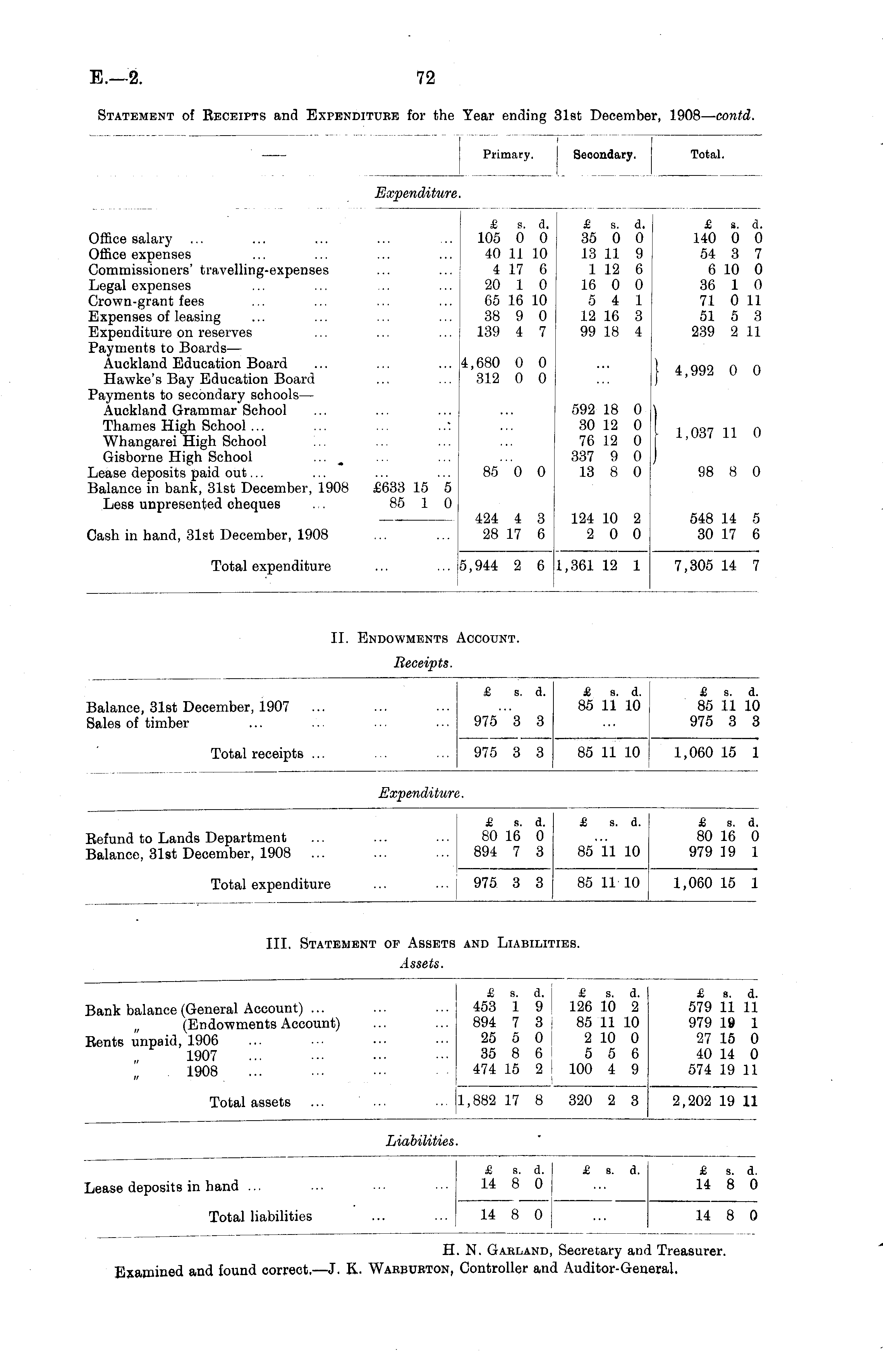 Primary. Seoondary. Total. Expenditure Office salary Office expenses Commissioners' travelling-expenses Legal expenses Crown-grant fees Expenses of leasing Expenditure on reserves Payments to Boards— Auckland Education Board Hawke's Bay Education Board Payments to secondary schools — Auckland Grammar School Thames High School ... Whangarei High School Gisborne High School Lease deposits paid out... Balance in bank, 31st December, 1908 Less unpresented cheques £633 15 5 85 1 0 £ a. d. 105 0 0 40 11 10 4 17 6 20 1 0 65 16 10 38 9 0 139 4 7 & s. 35 0 13 11 1 12 16 0 5 4 12 16 99 18 d. 0 9 6 0 1 3 4 £ s. d. 140 0 0 54 3 7 6 10 0 36 1 0 71 0 11 51 5 3 239 2 11 4,680 0 0 312 0 0 ) 4,992 0 0 592 18 30 12 76 12 337 9 13 8 0 0 0 0 0 ! 1,037 11 0 85 0 0 98 8 0 424 4 3 28 17 6 124 10 2 0 2 0 548 14 5 30 17 6 Cash in hand, 31st December, 1908 Total expenditure ... i 5,944 2 6 1,361 12 1 7,305 14 7 II. Endowments Account. Receipts. Balance, 31st December, 1907 Sales of timber £ s. 975 3 d. 3 £ s. d. 85 11 10 £ s. d. 85 11 10 975 3 3 Total receipts ... 975 3 8 85 11 10 1,060 15 1 Expenditun ,efund to Lands Department ialance, 31st December, 1908 ... £ s. 80 16 894 7 d. 0 3 £ s. d. 85 11 10 £ s. d. 80 16 0 979 19 1 Total expenditure 975 3 3 85 11 10 1,060 15 1 III. Statement of Assets and Liabilities. Assets. lank balance (General Account) ... (Endowments Account) lents unpaid, 1906 1907 1908 Total assets £ s. ... 453 1 ... 894 7 25 5 35 8 . . 474 15 ... 1,882 17 d. 9 3 0 6 2 8 £ s. d. 126 10 2 85 11 10 2 10 0 5 5 6 100 4 9 320 2 3 £ a. d. 579 11 11 979 19 1 27 15 0 40 14 0 574 19 11 2,202 19 11 Liabilities. lease deposits in hand ... £ 14 14 s. d. 8 0 8 0 \ £ s. d. £ 14 s. d. 8 0 Total liabilities 14 8 0 H. N. Gabland, Secretary and Treasurer. Examined and found correct, — J. K. Warbubton, Controller and Auditor-General.