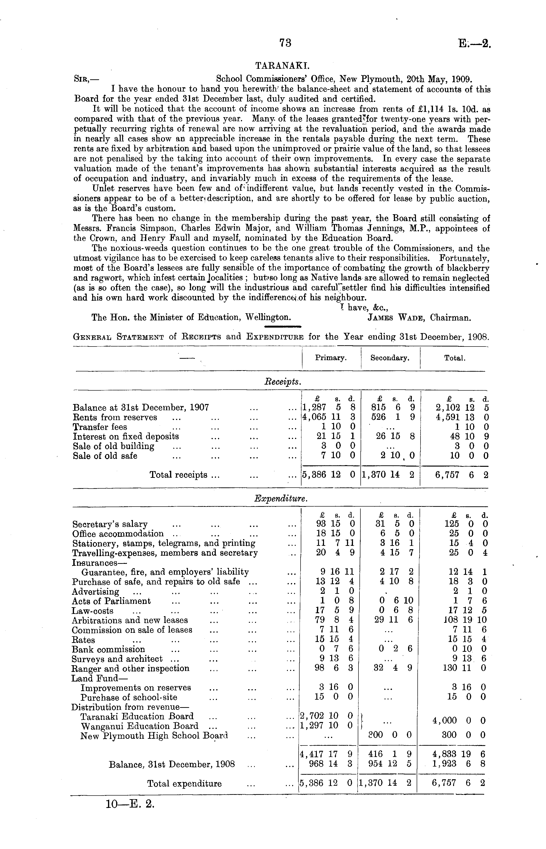 TARANAKI. Sir,— School Commissioners' Office, New Plymouth, 20th May, 1909. I have the honour to hand you herewith' the balance-sheet and statement of accounts of this Board for the year ended 31st December last, duly audited and certified. It will be noticed that the account of income shows an increase from rents of £1,114 Is. 10d. as compared with that of the previous year. Many, of the leases granted'for twenty-one years with perpetually recurring rights of renewal are now arriving at the revaluation period, and the awards made in nearly all cases show an appreciable increase in the rentals payable during the next term. These rents are fixed by arbitration and based upon the unimproved or prairie value of the land, so that lessees are not penalised by the taking into account of their own improvements. In every case the separate valuation made of the tenant's improvements has shown substantial interests acquired as the result of occupation and industry, and invariably much in excess of the requirements of the lease. Unlet reserves have been few and of' indifferent value, but lands recently vested in the Commissioners appear to be of a betteri description, and are shortly to be offered for lease by public auction, as is the Board's custom. There has been no change in the membership during the past year, the Board still consisting of Messrs. Francis Simpson, Charles Edwin Major, and William Thomas Jennings, M.P., appointees of the Crown, and Henry Faull and myself, nominated by the Education Board. The noxious-weeds question continues to be the one great trouble of the Commissioners, and the utmost vigilance has to be exercised to keep careless tenants alive to their responsibilities. Fortunately, most of the Board's lessees are fully sensible of the importance of combating the growth of blackberry and ragwort, which infest certain ; but'so long as Native lands are allowed to remain neglected (as is so often the case), so long will the industrious and careful'settler find his difficulties intensified and his own hard work discounted by the indifferences of his neighbour. T have, &c, The Hon. the Minister of Education, Wellington. James Wade, Chairman.