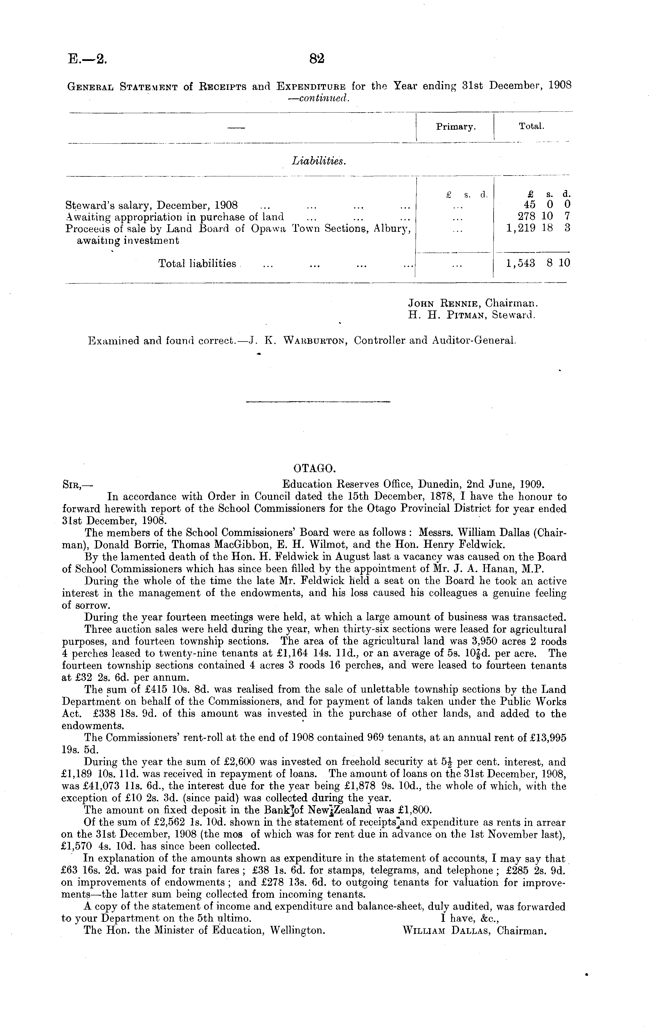OTAGO. Sir, — Education Reserves Office, Dunedin, 2nd June, 1909. In accordance with Order in Council dated the 15th December, 1878, I have the honour to forward herewith report of the School Commissioners for the Otago Provincial District for year ended 31st December, 1908. The members of the School Commissioners' Board were as follows : Messrs. William Dallas (Chairman), Donald Borrie, Thomas Mac Gibbon, E. H. Wilmot, and the Hon. Henry Feldwick. By the lamented death of the Hon. H. Feldwick in August last a vacancy was caused on the Board of School Commissioners which has since been filled by the appointment of Mr. J. A. Hanan, M.P. During the whole of the time the late Mr. Feldwick held a seat on the Board he took an active interest in the management of the endowments, and his loss caused his colleagues a genuine feeling of sorrow. During the year fourteen meetings were held, at which a large amount of business was transacted. Three auction sales were held during the year, when thirty-six sections were leased for agricultural purposes, and fourteen township sections. The area of the agricultural land was 3,950 acres 2 roods 4 perches leased to twenty-nine tenants at £1,164 14s. lid., or an average of ss. IOJd. per acre. The fourteen township sections contained 4 acres 3 roods 16 perches, and were leased to fourteen tenants at £32 2s. 6d. per annum. The sum of £415 10s. Bd. was realised from the sale of unlettable township sections by the Land Department on behalf of the Commissioners, and for payment of lands taken under the Public Works Act. £338 18s. 9d. of this amount was invested in the purchase of other lands, and added to the endowments. The Commissioners' rent-roll at the end of 1908 contained 969 tenants, at an annual rent of £13,995 19s. sd. During the year the sum of £2,600 was invested on freehold security at 5£ per cent, interest, and £1,189 10s. lid. was received in repayment of loans. The amount of loans on the 31st December, 1908, was £41,073 11s. 6d., the interest due for the year being £1,878 9s. 10d., the whole of which, with the exception of £10 2s. 3d. (since paid) was collected during the year. The amount on fixed deposit in the Bankjof was £1,800. Of the sum of £2,562 Is. 10d. shown in the statement of expenditure as rents in arrear on the 31st December, 1908 (the mos of which was for rent due in advance on the Ist November last), £1,570 4s. 10d. has since been collected. In explanation of the amounts shown as expenditure in the statement of accounts, I may say that £63 16s. 2d. was paid for train fares ; £38 Is. 6d. for stamps, telegrams, and telephone ; £285 2s. 9d. on improvements of endowments ; and £278 13s. 6d. to outgoing tenants for valuation for improvements —the latter sum being collected from incoming tenants. A copy of the statement of income and expenditure and balance-sheet, duly audited, was forwarded to your Department on the sth ultimo. I have, &c, The Hon. the Minister of Education, Wellington. William Dallas, Chairman.