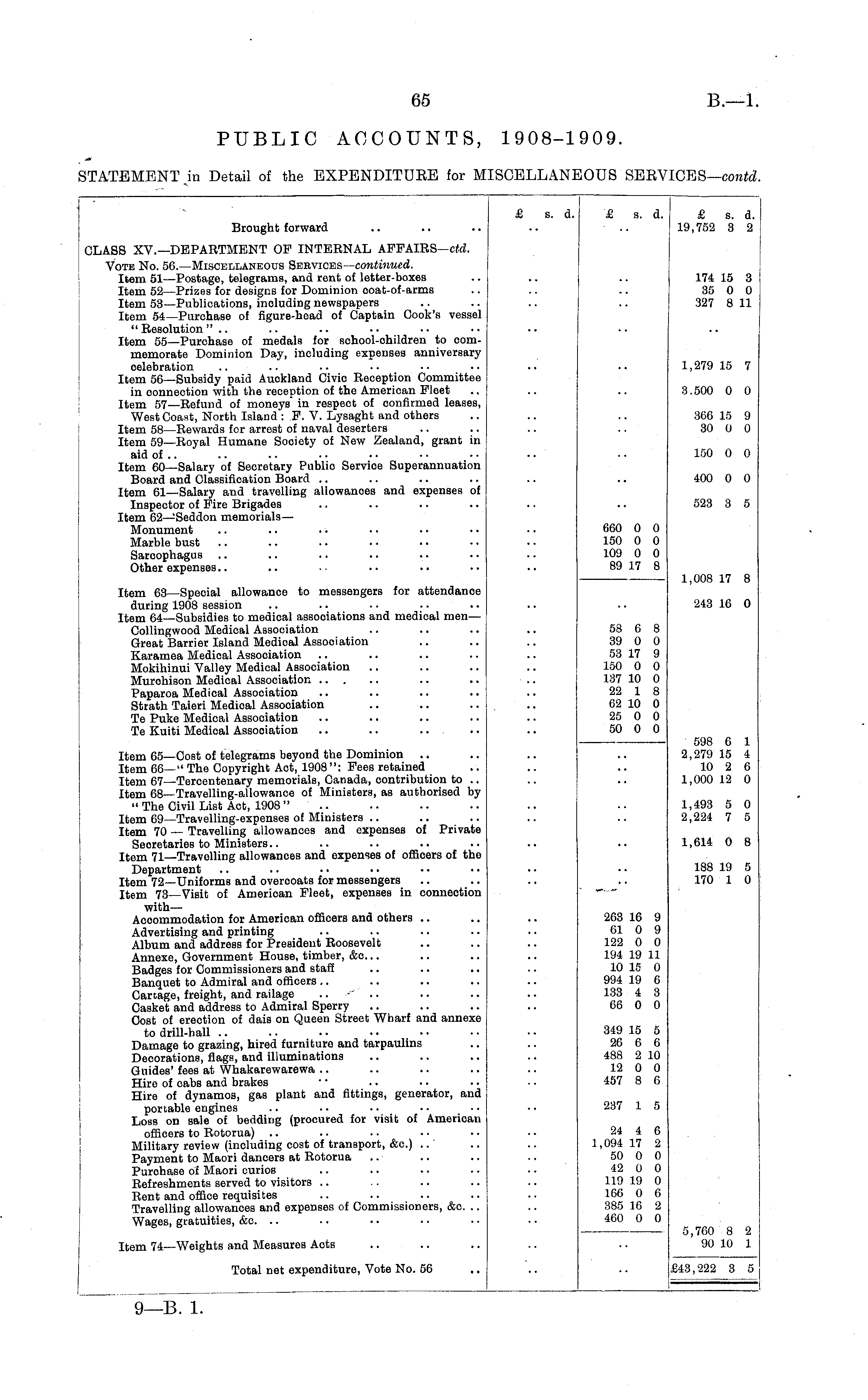 £ s. £ s. d. £ s. d. 19,752 3 2 Brought forward CLASS XV.—DEPARTMENT OF INTERNAL AFFAIRS— ctd. Vote No. 56.—Miscellaneous Services — continued. Item 51—Postage, telegrams, and rent of letter-boxes Item 52—Prizes for designs for Dominion coat-of-arms Item 53—Publications, including newspapers Item 54 —Purchase of figure-head of Captain Cook's vessel " Resolution " .. Item 55—Purchase of medals for school-children to commemorate Dominion Day, including expenses anniversary celebration Item 56—Subsidy paid Auokland Civio Reception Committee in connection with the reception of the American Fleet Item 57—Refund of moneys in respect of oonfirmed leases, West Coast, North Island : F. V. Lysaght and others Item 58—Rewards for arrest of naval deserters Item 59—Royal Humane Sooiety of New Zealand, grant in aid of .. Item 60 —Salary of Secretary Publio Servioe Superannuation Board and Classification Board Item 61—Salary and travelling allowances and expenses of Inspector of Fire Brigades Item 62—Seddon memorialsMonument Marble bust Saroophagus Other expenses.. 174 15 3 35 0 0 327 8 11 1,279 15 7 3.500 0 0 366 15 9 30 0 0 150 0 0 400 0 0 660 0 0 150 0 0 109 0 0 89 17 8 523 3 5 1,008 17 8 Item 63—Special allowance to messengers for attendance during 1908 session Item 64—Subsidies to medical associations and medical men— Collingwood Medical Association Great Barrier Island Medioal Association Karamea Medical Association Mokihinui Valley Medioal Association Murohison Medical Association Paparoa Medical Association Strath Taieri Medioal Association Te Puke Medical Association Te Kuiti Medioal Association .. .. ... 58 6 8 39 0 0 53 17 9 150 0 0 137 10 0 22 1 8 62 10 0 25 0 0 50 0 0 243 16 0 598 6 1 2,279 15 4 10 2 6 1,000 12 0 Item 65—Cost of telegrams beyond the Dominion Item 66—"The Copyright Aot, 1908": Fees retained Item 67 —Tercentenary memorials, Canada, contribution to .. Item 68—Travelling-allowance of Ministers, as authorised by " The Civil List Act, 1908 " Item 69—Travelling-expenses of Ministers Item 70 — Travelling allowances and expenses of Private Secretaries to Ministers Item 71 —Travelling allowances and expenses of officers of the Department Item 72—Uniforms and overooats for messengers Item 73—Visit of Amerioan Fleet, expenses in connection with — Accommodation for American officers and others Advertising and printing Album and address for President Roosevelt Annexe, Government House, timber, &o... Badges for Commissioners and staff Banquet to Admiral and officers Cartage, freight, and railage Casket and address to Admiral Sperry Cost of erection of dais on Queen Street Wharf and annexe to drill-hall Damage to grazing, hired furniture and tarpaulins Decorations, flags, and illuminations Guides' fees at Whakarewarewa Hire of cabs and brakes Hire of dynamos, gas plant and fittings, generator, and portable engines Loss on sale of bedding (procured for visit of American officers to Rotorua) Military review (including cost of transport, &c) Payment to Maori dancers at Rotorua Purchase of Maori curios Refreshments served to visitors Rent and office requisites Travelling allowances and expenses of Commissioners, &o. .. Wages, gratuities, &c. 263 16 9 61 0 9 122 0 0 194 19 11 10 15 0 994 19 6 133 4 3 66 0 0 1,493 5 0 2,224 7 5 1,614 0 8 188 19 5 170 1 0 349 15 5 26 6 6 488 2 10 12 0 0 457 8 6 237 1 5 24 4 6 1,094 17 2 50 0 0 42 0 0 119 19 0 166 0 6 385 16 2 460 0 0 5,760 8 2 90 10 1 Item 74—Weights and Measures Acts Total net expenditure, Vote No. 56 £43,222 3 5
