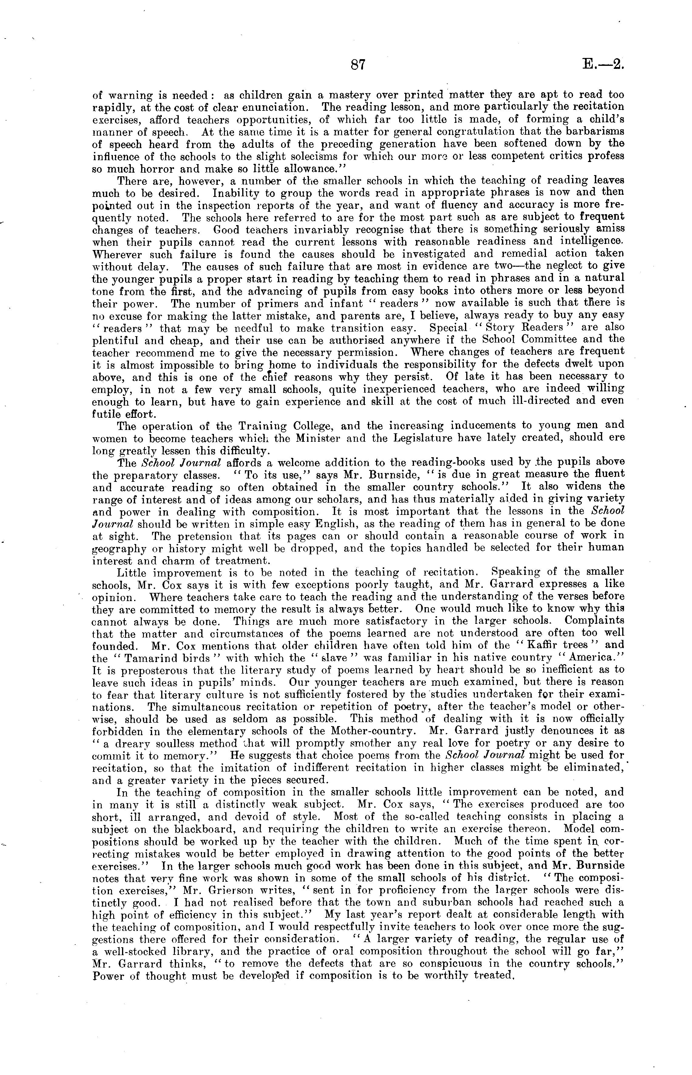 of warning is needed : as children gain a mastery over printed matter they are apt to read too rapidly, at the cost of clear enunciation. The reading lesson, and more particularly the recitation exercises, afford teachers opportunities, of which far too little is made, of forming a child's manner of speech. At the same time it is a matter for general congratulation that the barbarisms of speech heard from the adults of the preceding generation have been softened down by the influence of the schools to the slight solecisms for which our more or less competent critics profess so much horror and make so little allowance." There are, however, a number of the smaller schools in which the teaching of reading leaves much to be desired. Inability to group the words read in appropriate phrases is now and then pointed out in the inspection reports of the year, and want of fluency and accuracy is more frequently noted. The schools here referred to are for the most part such as are subject to frequent changes of teachers. Good teachers invariably recognise that there is something seriously amiss when their pupils cannot read the current lessons with reasonable readiness and intelligence. Wherever such failure is found the causes should be investigated and remedial action taken without delay. The causes of such failure that are most in evidence are two —the neglect to give the younger pupils a proper start in reading by teaching them to read in phrases and in a natural tone from the first, and the advancing of pupils from easy books into others more or less beyond their power. The number of primers and infant " readers" now available is such that tßere is no excuse for making the latter mistake, and parents are, I believe, always ready to buy any easy "readers" that may be needful to make transition easy. Special "Story Readers" are also plentiful and cheap, and their use can be authorised anywhere if the School Committee and the teacher recommend me to give the necessary permission. Where changes of teachers are frequent it is almost impossible to bring home to individuals the responsibility for the defects dwelt upon above, and this is one of the cfiief reasons why they persist. Of late it has been necessary to employ, in not a few very small schools, quite inexperienced teachers, who are indeed willing enough to learn, but have to gain experience and skill at the cost of much ill-directed and even futile effort. The operation of the Training College, and the increasing inducements to young men and women to become teachers which the Minister and the Legislature have lately created, should ere long greatly lessen this difficulty. The School Journal affords a welcome addition to the reading-books used by .the pupils above the preparatory classes. "To its use," says Mr. Burnside, "is due in great measure the fluent and accurate reading so often obtained in the smaller country schools." It also widens the range of interest and of ideas among our scholars, and has thus materially aided in giving variety and power in dealing with composition. It is most important that the lessons in the School Journal should be written in simple easy English, as the reading of them has in general to be done at sight. The pretension that its pages can or should contain a reasonable course of work in geography or history might well be dropped, and the topics handled be selected for their human interest and charm of treatment. Little improvement is to be noted in the teaching of recitation. Speaking of the smaller schools, Mr. Cox says it is with few exceptions poorly taught, and Mr. Garrard expresses a like opinion. Where teachers take euro to teach the reading and the understanding of the verses before they are committed to memory the result is always better. One would much like to know why this cannot always be done. Tilings are much more satisfactory in the larger schools. Complaints that the matter and circumstances of the poems learned are not understood are often too well founded. Mr. Cox mentions that older children have often told him of the " Kaffir trees " and the "Tamarind birds" with which the "slave" was familiar in his native country "America." It is preposterous that the literary study of poems learned by heart should be so inefficient as to leave such ideas in pupils' minds. Our younger teachers are much examined, but there is reason to fear that literary culture is not sufficiently fostered by the studies undertaken for their examinations. The simultaneous recitation or repetition of poetry, after the teacher's model or otherwise, should be used as seldom as possible. This method of dealing with it is now officially forbidden in the elementary schools of the Mother-country. Mr. Garrard justly denounces it as " a dreary soulless method that will promptly smother any real love for poetry or any desire to commit it to memory." He suggests that choice poems from the School Journal might be used for recitation, so that the imitation of indifferent recitation in higher classes might be eliminated, and a greater variety in the pieces secured. In the teaching of composition in the smaller schools little improvement can be noted, and in many it is still a distinctly weak subject. Mr. Cox says, " The exercises produced are too short, ill arranged, and devoid of style. Most of the so-called teaching consists in placing a subject on the blackboard, and requiring the children to write an exercise thereon. Model compositions should be worked up by the teacher with the children. Much of the time spent in correcting mistakes would be better employed in drawing attention to the good points of the better exercises." In the larger schools much gor.d work has been done in this subject, and Mr. Burnside notes that very fine work was shown in some of the small schools of his district. " The composition exercises," Mr. Grierson writes, " sent in for proficiency from the larger schools were distinctly good. I had not realised 
