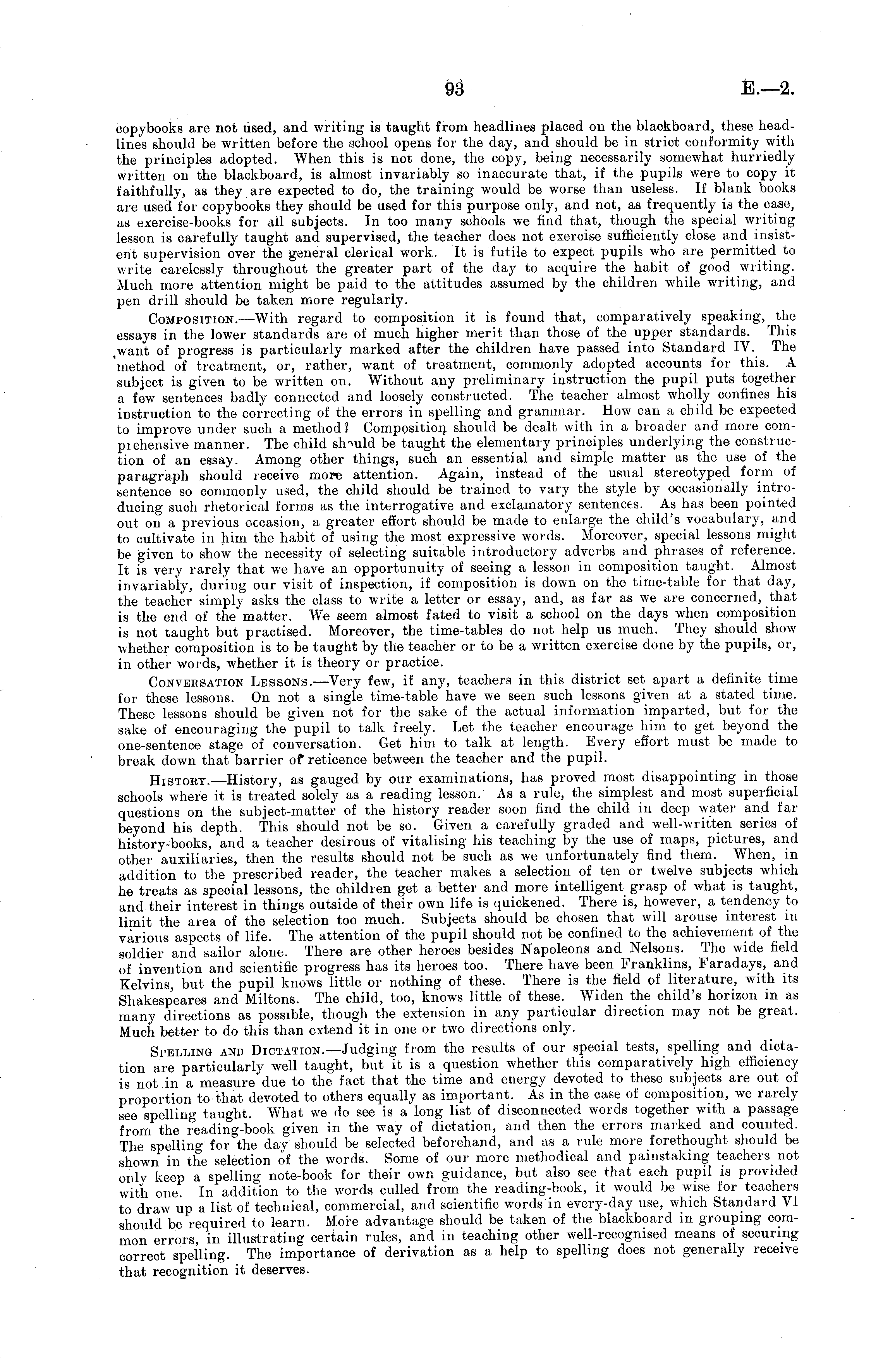 copybooks are not used, and writing is taught from headlines placed on the blackboard, these headlines should be written before the school opens for the day, and should be in strict conformity with the principles adopted. When this is not done, the copy, being necessarily somewhat hurriedly written on the blackboard, is almost invariably so inaccurate that, if the pupils were to copy it faithfully, as they are expected to do, the training would be worse than useless. If blank books are used for copybooks they should be used for this purpose only, and not, as frequently is the case, as exercise-books for ail subjects. In too many schools we find that, though the special writing lesson is carefully taught and supervised, the teacher does not exercise sufficiently close and insistent supervision over the general clerical work. It is futile to expect pupils who are permitted to write carelessly throughout the greater part of the day to acquire the habit of good writing. Much more attention might be paid to the attitudes assumed by the children while writing, and pen drill should be taken more regularly. Composition.—With regard to composition it is found that, comparatively speaking, the essays in the lower standards are of much higher merit than those of the upper standards. This want of progress is particularly marked after the children have passed into Standard IV. The method of treatment, or, rather, want of treatment, commonly adopted accounts for this. A subject is given to be written on. Without any preliminary instruction the pupil puts together a few sentences badly connected and loosely constructed. The teacher almost wholly confines his instruction to the correcting of the errors in spelling and grammar. How can a child be expected to improve under such a method? Composition should be dealt with in a broader and more compiehensive manner. The child should be taught the elementary principles underlying the construction of an essay. Among other things, such an essential and simple matter as the use of the paragraph should receive more attention. Again, instead of the usual stereotyped form of sentence so commonly used, the child should be trained to vary the style by occasionally introducing such rhetorical forms as the interrogative and exclamatory sentences. As has been pointed out on a previous occasion, a greater effort should be made to enlarge the child's vocabulary, and to cultivate in him the habit of using the most expressive words. Moreover, special lessons might be given to show the necessity of selecting suitable introductory adverbs and phrases of reference. It is very rarely that we have an opportunuity of seeing a lesson in composition taught. Almost invariably, during our visit of inspection, if composition is down on the time-table for that day, the teacher simply asks the class to write a letter or essay, and, as far as we are concerned, that is the end of the matter. We seem almost fated to visit a school on the days when composition is not taught but practised. Moreover, the time-tables do not help us much. They should show whether composition is to be taught by the teacher or to be a written exercise done by the pupils, or, in other words, whether it is theory or practice. Conversation Lessons. —Very few, if any, teachers in this district set apart a definite time for these lessons. On not a single time-table have we seen such lessons given at a stated time. These lessons should be given not for the sake of the actual information imparted, but for the sake of encouraging the pupil to talk freely. Let the teacher encourage him to get beyond the one-sentence stage of conversation. Get him to talk at length. Every effort must be made to break down that barrier of reticence between the teacher and the pupil. Histoky. History, as gauged by our examinations, has proved most disappointing in those schools where it is treated solely as a reading lesson. As a rule, the simplest and most superficial questions on the subject-matter of the history reader soon find the child in deep water and far beyond his depth. This should not be so. Given a carefully graded and well-written series of history-books, and a teacher desirous of vitalising his teaching by the use of maps, pictures, and other auxiliaries, then the results should not be such as we unfortunately find them. When, in addition to the prescribed reader, the teacher makes a selection of ten or twelve subjects which he treats as special lessons, the children get a better and more intelligent grasp of what is taught, and their interest in things outside of their own life is quickened. There is, however, a tendency to limit the area of the selection too much. Subjects should be chosen that will arouse interest m various aspects of life. The attention of the pupil should not be confined to the achievement of the soldier and sailor alone. There are other heroes besides Napoleons and Nelsons. The wide field of invention and scientific progress has its heroes too. There have been Franklins, Faradays, and Kelvins, but the pupil knows little or nothing of these. There is the field of literature, with its Shakesp'eares and Miltons. The child, too, knows little of these. Widen the child's horizon in as many directions as possible, though the extension in any particular direction may not be great. Much better to do this than extend it in one or two directions only. SrELLiNG and Dictation.—Judging from the results of our special tests, spelling and dictation are particularly well taught, but it is a question whether this comparatively high efficiency is not in a measure due to the fact that the time and energy devoted to these subjects are out of proportion to that devoted to others equally as important. As in the case of composition, we rarely see spelling taught. What we do see is a long list of disconnected words together with a passage from the reading-book given in the way of dictation, and then the errors marked and c