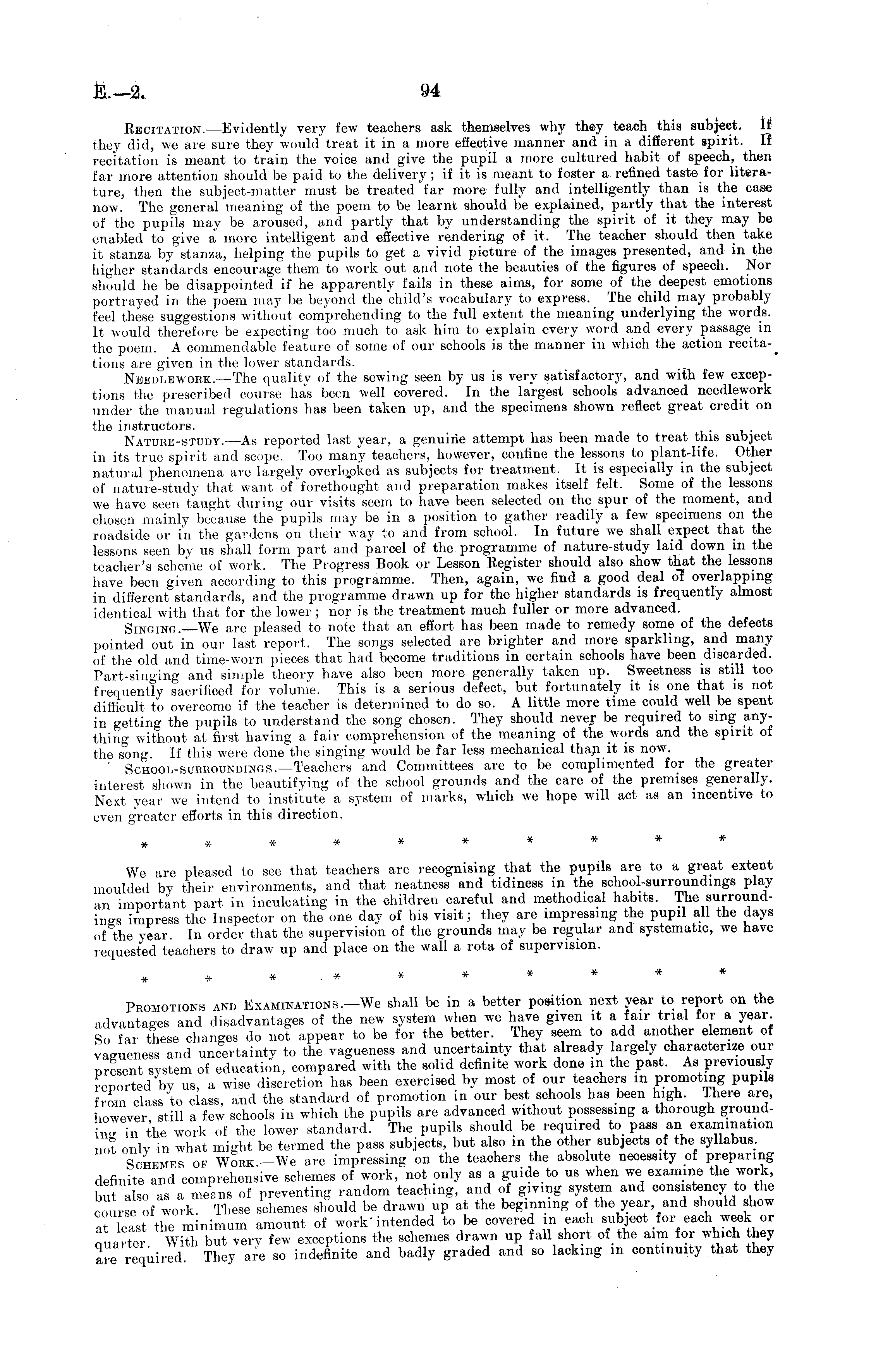 Recitation. —Evidently very few teachers ask themselves why they teach this subject. If they did, we are sure they would treat it in a more effective manner and in a different spirit. If recitation is meant to train the voice and give the pupil a more cultured habit of speech, then far more attention should be paid to the delivery; if it is meant to foster a refined taste for literature, then the subject-matter must be treated far more fully and intelligently than is the case now. The general meaning of the poem to be learnt should be explained, partly that the interest of the pupils may be aroused, and partly that by understanding the spirit of it they may be enabled to give a more intelligent and effective rendering of it. The teacher should then take it stanza by stanza, helping the pupils to get a vivid picture of the images presented, and in the higher standards encourage them to work out and note the beauties of the figures of speech. Nor should he be disappointed if he apparently fails in these aims, for some of the deepest emotions portrayed in the poem may be beyond the child's vocabulary to express. The child may probably feel these suggestions without comprehending to the full extent the meaning underlying the words. It would therefore be expecting too much to ask him to explain every word and every passage in the poem. A oommendable feature of some of our schools is the manner in which the action recita-_ tions are given in the lower standards. Needlework. —The quality of the sewing seen by us is very satisfactory, and with few exceptions the prescribed course lias been well covered. In the largest schools advanced needlework under the manual regulations lias been taken up, and the specimens shown reflect great credit on the instructors. Nature-study. —As reported last year, a genuine attempt has been made to treat this subject in its true spirit and scope. Too many teachers, however, confine the lessons to plant-life. Other natural phenomena are largely overlooked as subjects for treatment. It is especially in the subject of nature-study that want of "forethought and preparation makes itself felt. Some of the lessons we have seen taught during our visits seem to have been selected on the spur of the moment, and chosen mainly because the pupils may be in a position to gather readily a few specimens on the roadside or in the gardens on their way to and from school. In future we shall expect that the lessons seen by us shall form part and parcel of the programme of nature-study laid down in the teacher's scheme of work. The Progress Book or Lesson Register should also show that the lessons have been given according to this programme. Then, again, we find a good deal of overlapping in different standards, and the programme drawn up for the higher standards is frequently almost identical with that for the lower ; nor is the treatment much fuller or more advanced. Singing. We are pleased to note that an effort has been made to remedy some of the defects pointed out in our last report. The songs selected are brighter and more sparkling, and many of the old and time-worn pieces that had become traditions in certain schools have been discarded. Part-singing and simple theory have also been more generally taken up. Sweetness is still too frequently sacrificed for volume. This is a serious defect, but fortunately it is one that is not difficult to overcome if the teacher is determined to do so. A little more time could well be spent in getting the pupils to understand the song chosen. They should never be required to sing anything without at first having a fair comprehension of the meaning of the words and the spirit of the song If this were done the singing would be far less mechanical than it is now. School-suhhoundinos.—Teachers and Committees are to be complimented for the greater interest shown in the beautifying of the school grounds and the care of the premises generally. Next year we intend to institute a system of marks, which we hope will act as an incentive to even greater efforts in this direction. ********** We are pleased to see that teachers are recognising that the pupils are to a great extent moulded by their environments, and that neatness and tidiness in the school-surroundings play an important part in inculcating in the children careful and methodical habits. The surroundings impress the Inspector on the one day of his visit; they are impressing the pupil all the days of the year. In order that the supervision of the grounds may be regular and systematic, we have requested teachers to draw up and place on the wall a rota of supervision. ***.** * * * * * Promotions and Examinations.—We shall be in a better position next year to report on the u<[vantages and disadvantages of the new system when we have given it a fair trial for a year. So far these changes do not appear to be for the better. They seem to add another element ot vagueness and uncertainty to the vagueness and uncertainty that already largely characterize our present system of education, compared with the solid definite work done m the past. As previously reported by us, a wise discretion has been exercised by most of our teachers in Promoting pupils from class to class, and the standard of promotion in our best schools has been high. There are, however still a few schools in which the pupils are advanced without possessing a thorough groundin- in the work of the lower standard. The pupils should be required to pass an examination not only in what might be termed the pass subjects, but also in the other subjects of the syllabus. Schemes of Work —We are impressing on the teachers the absolute necessity of preparing definite and comprehensive schemes of work, not only as a guide to us when we examine the work, but also as a means of preventing random teaching, and of giving system and consistency to the course of work These schemes should be drawn up at the beginning of the year, and should sho