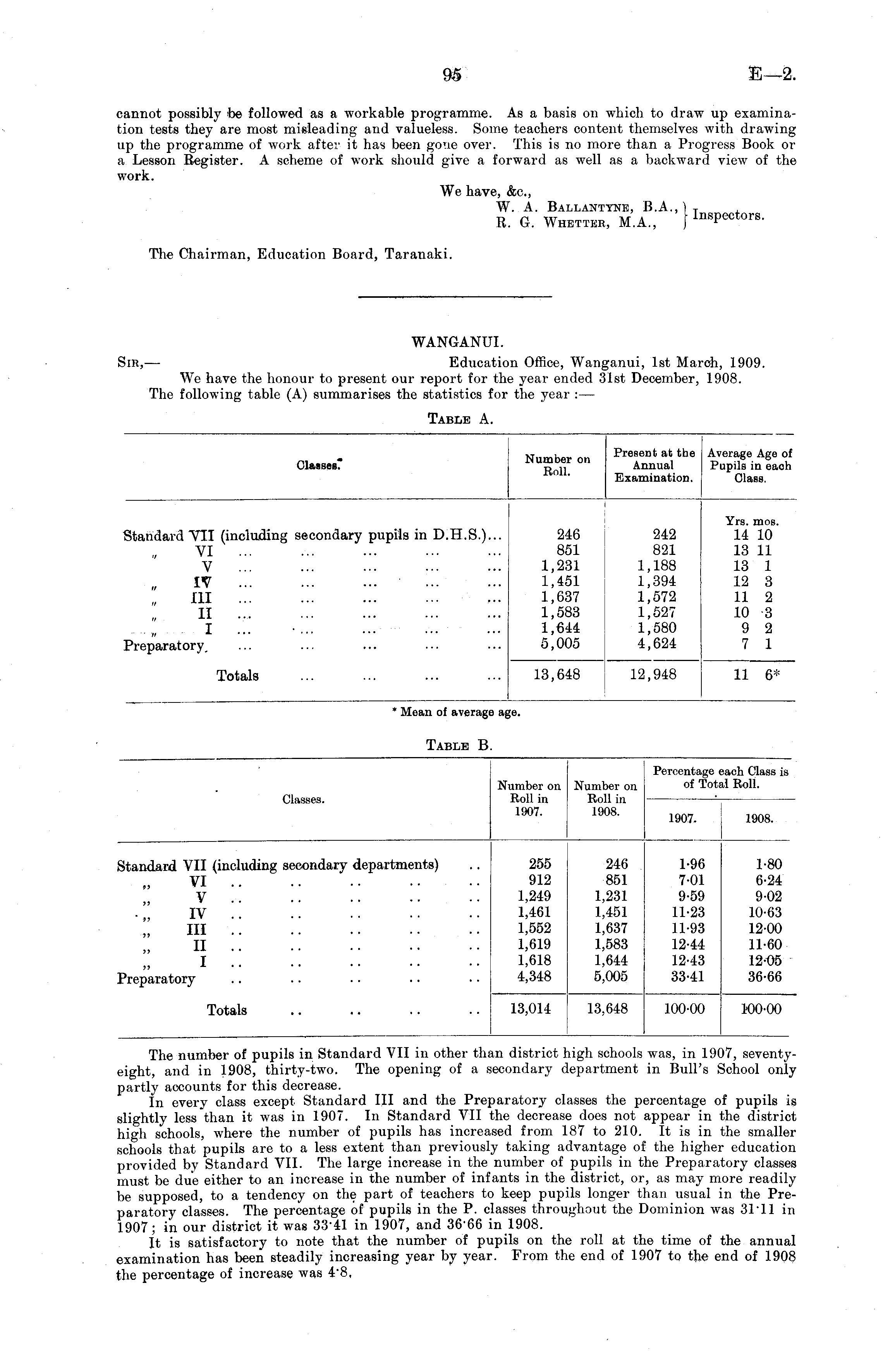 WANGANUI. Sir, — Education Office, Wanganui, Ist March, 1909. We have the honour to present our report for the year ended 31st December, 1908. The following table (A) summarises the statistics for the year : —