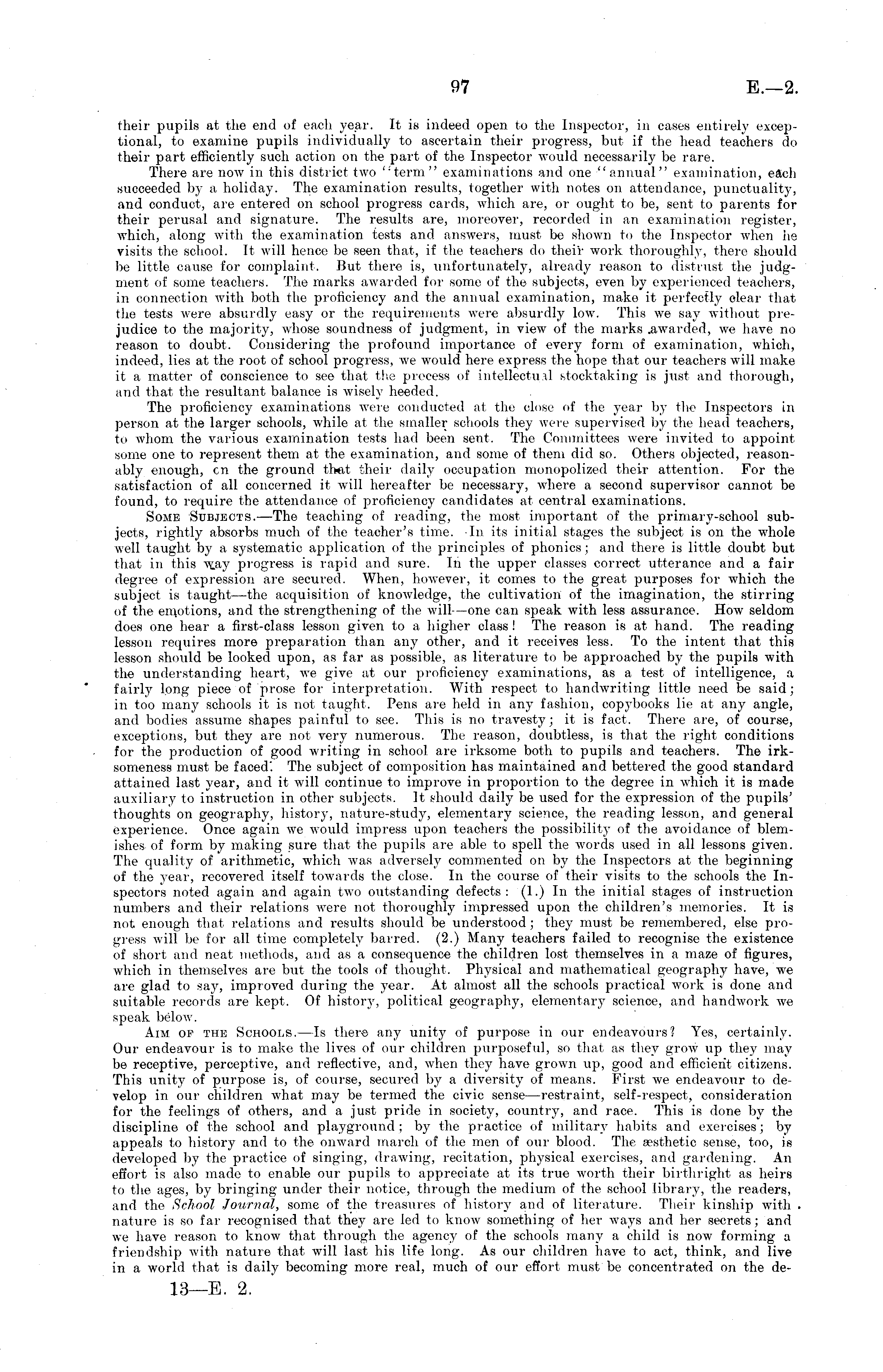 their pupils at the end of each year. It is indeed open to the Inspector, in cases entirely exceptional, to examine pupils individually to ascertain their progress, but if the head teachers do their part efficiently such action on the part of the Inspector would necessarily be rare. There are now in this district two '''term" examinations and one "annual" examination, each succeeded by n holiday. The examination results, together with notes on attendance, punctuality, and conduct, are entered on school progress cards, which are, or ought to be, sent to parents for their perusal and signature. The results are, moreover, recorded in an examination register, which, along with the examination tests and answers, must be shown to the Inspector when he visits the school. It will hence be seen that, if the teachers do their work thoroughly, there should be little cause for complaint. But there is, unfortunately, already reason to distrust the judgment of some teachers. The marks awarded for some of the subjects, even by experienced teachers, in connection with both the proficiency and the annual examination, make it perfectly clear that the tests were absurdly easy or the requirements were absurdly low. This we say without prejudice to the majority, whose soundness of judgment, in view of the marks .awarded, we have no reason to doubt. Considering the profound importance of every form of examination, which, indeed, lies at the root of school progress, we would here express the hope that our teachers will make it a matter of conscience to see that the process of intellectual stocktaking is just and thorough, and that the resultant balance is wisely heeded. The proficiency examinations were conducted at the close of the year by the Inspectors in person at the larger schools, while at the smaller schools they were supervised by the head teachers, to whom the various examination tests had been sent. The Committees were invited to appoint some one to represent them at the examination, and some of them did so. Others objected, reasonably enough, en the ground that their daily occupation monopolized their attention. For the satisfaction of all concerned it will hereafter be necessary, where a second supervisor cannot be found, to require the attendance of proficienc} , candidates at central examinations. Some Subjects.—The teaching of reading, the most important of the primary-school subjects, rightly absorbs much of the teacher's time. In its initial stages the subject is on the whole well taught by a systematic application of the principles of phonics; and there is little doubt but that in this w_ay progress is rapid and sure. In the upper classes correct utterance and a fair degree of expression are secured. When, however, it comes to the great purposes for which the subject is taught—the acquisition of knowledge, the cultivation of the imagination, the stirring of the emotions, and the strengthening of the will—one can speak with less assurance. How seldom does one hear a first-class lesson given to a higher class! The reason is at hand. The reading lesson requires more preparation than any other, and it receives less. To the intent that this lesson should be looked upon, as far as possible, as literature to be approached by the pupils with the understanding heart, we give at our proficiency examinations, as a test of intelligence, a fairly long piece of prose for interpretation. With respect to handwriting little need be said; in too many schools it is not taught. Pens are held in any fashion, copybooks lie at any angle, and bodies assume shapes painful to see. This is no travesty; it is fact. There are, of course, exceptions, but they are not very numerous. The reason, doubtless, is that the right conditions for the production of good writing in school are irksome both to pupils and teachers. The irksomeness must be faced. The subject of composition has maintained and bettered the good standard attained last year, and it will continue to improve in proportion to the degree in which it is made auxiliary to instruction in other subjects. It should daily be used for the expression of the pupils' thoughts on geography, history, nature-study, elementary science, the reading lesson, and general experience. Once again we would impress upon teachers the possibility of the avoidance of blemishes of form by making sure that the pupils are able to spell the words used in all lessons given. The quality of arithmetic, which was adversely commented on by the Inspectors at the beginning of the year, recovered itself towards the close. In the course of their visits to the schools the Inspectors noted again and again two outstanding defects: (1.) In the initial stages of instruction numbers and their relations were not thoroughly impressed upon the children's memories. It is not enough that relations and results should be understood; they must be remembered, else progress will be for all time completely barred. (2.) Many teachers failed to recognise the existence of short and neat methods, and as a consequence the children lost themselves in a maze of figures, which in themselves are but the tools of thought. Physical and mathematical geography have, we are glad to say, improved during the year. At almost all the schools practical work is done and suitable records are kept. Of histoiT, political geography, elementary science, and handwork we speak below. Aim of the Schools. —Is there any unity of purpose in our endeavours? Yes, certainly. Our endeavour is to make the lives of our children purposeful, so that as they grow up they may be receptive, perceptive, and reflective, and, when they have grown up, good and efficient citizens. This unity of purpose is, of course, secured by a diversity of means. First we endeavour to develop in our children what may be termed the civic sense—restraint, self-respect, consideration for the feelings of others, and a just pride in society, country, and race. This is do