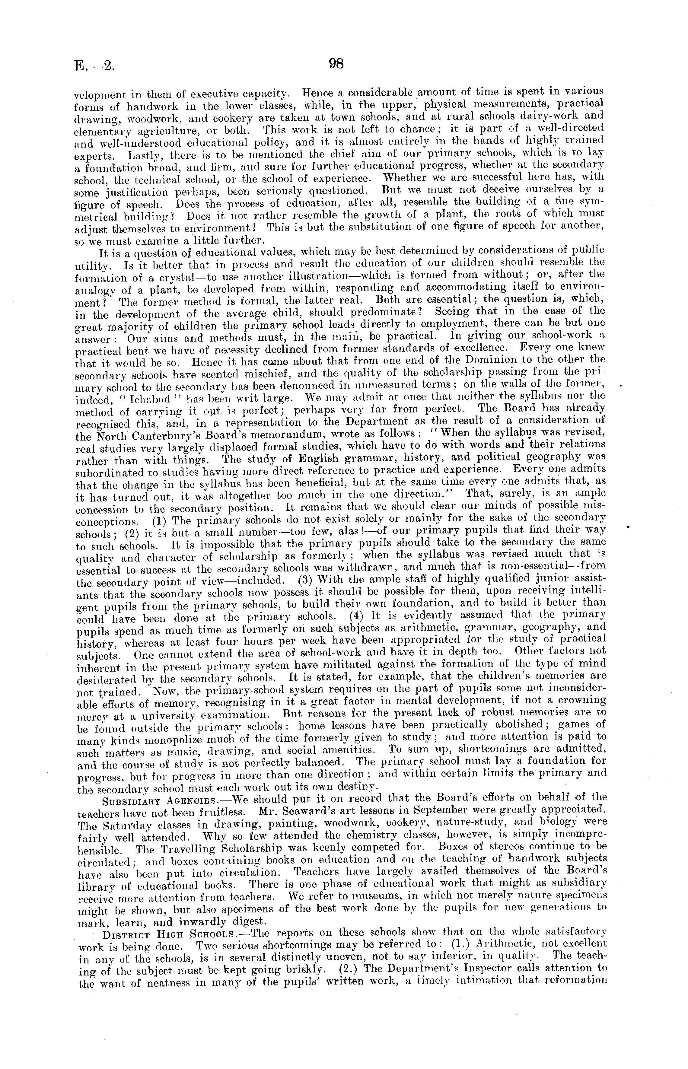 velopnient in them of executive capacity. Hence a considerable amount of time is spent in various forms of handwork in the lower classes, while, in the upper, physical measurements, practical drawing, woodwork, and cookery are taken at town schools, and at rural schools dairy-work and elementary agriculture, or both. This work is not left to chance; it is part of a well-directed and well-understood educational policy, and it is almost entirely in the hands of highly framed experts. Lastly, there is to be mentioned the chief aim of our primary schools, which is to lay a foundation broad, and firm, and sure for further educational progress, whether at the secondary school, the technical school, or the school of experience. Whether we are successful here has, with some justification perhaps, been seriously questioned. But we must not deceive ourselves by a figure of speech. Does the process of education, after all, resemble the building of a fine symmetrical building? Does it not rather resemble the growth of a plant, the roots of which must adjust themselves to environment? This is but the substitution of one figure of speech for another, so we must examine a little further. It is a question of educational values, which may be best determined by considerations of publicutility. Is it better that in process and result the education of our children should resemble the formation of a crystal—to use another illustration—which is formed from without; after the analogy of a plant, bo developed from within, responding and accommodating itself to environment? ' The former method is formal, the latter real. Both are essential; the question is, which, in the development of the average child, should predominate? Seeing that in the case of the great majority of children the primary school leads directly to employment, there can be but one answer : Our aims and methods must, in the mairi, be practical. In giving our school-work a practical bent we have of necessity declined from former standards of excellence. Every one knew that it would be so. Hence it has came about that from one end of the Dominion to the other the secondary schools have scented mischief, and the quality of the scholarship passing from the primary school to the secondary has been denounced in unmeasured terms; on the walls of the former, indeed, " [chabod " has been writ large. We may admit at once that neither the syllabus nor the method of carrying it out is perfect; perhaps very far from perfect. The Board has already recognised this, and, in a, representation to the Department as the result of a consideration of the North Canterbury's Board's memorandum, wrote as follows: "When the syllabus was revised, real studies very largely displaced formal studies, which have to do with words and their relations rather than with things. The study of English grammar, history, and political geography was subordinated to studies having more direct reference to practice and experience. Every one admits that the change in the syllabus has been beneficial, but at the same time every one admits that, as it has turned out, it was altogether too much in the one direction." That, surely, is an ample concession to the secondary position. It remains that we should clear our minds of possible misconceptions. (1) The primary schools do not exist solely or mainly for the sake of the secondary schools; (2) it is but a small number—too few, alas !—of our primary pupils that find their way to such'schools It is impossible that the primary pupils should take to the secondary the same quality and character of scholarship as formerly; when the syllabus was revised much that is essential to success at the secondary schools was withdrawn, and much that is non-essential—from the secondary point of view—included. (3) With the ample staff of highly qualified junior assistants that the secondary schools now possess it should be possible for them, upon receiving intelligent pupils fiom the primary schools, to build their own foundation, and to build it better than could have been done at the primary schools. (4) It is evidently assumed that the primary pupils spend as much time as formerly on such subjects as arithmetic, grammar, geography, and history whereas at least four bonis per week have been appropriated for the study of practical subjects One cannot extend the area of school-work and have it in depth too. Other factors not inherent, in the present primary system have militated against the formation of the type of mind desiderated by the secondary schools. It is stated, for example, that the children's memories are not trained. 'Now, the primary-school system requires on the part of pupils some not inconsiderable efforts of memory, recognising in it a great factor in mental development, if not a crowning mercy at a university examination. But reasons for the present lack of robust memories are to be found outside the primary schools: home lessons have been practically abolished: games of many kinds monopolize much'of the time formerly given to study; and more attention is paid to such'matters as music, drawing, and social amenities. To sum up, shortcomings are admitted, and the course of study is not perfectly balanced. The primary school must lay a foundation for progress, but for progress in more than one direction ; and within certain limits the primary and the secondary school must each work out its own destiny. SuiiisiiiiAiiY Agencies.—We should put it on record that the Board's efforts on behalf of the teachers have not been fruitless. Mr. Seawards art lessons in September were greatly appreciated. The Saturday classes in drawing, painting, woodwork, cookery, nature-study, and biology were fairly well attended. Why so few attended the chemistry classes, however, is simply incomprehensible. The Travelling Scholarship was keenly competed for. Boxes of stereos continue to be circulated.: and boxes containing books on education and on the teac