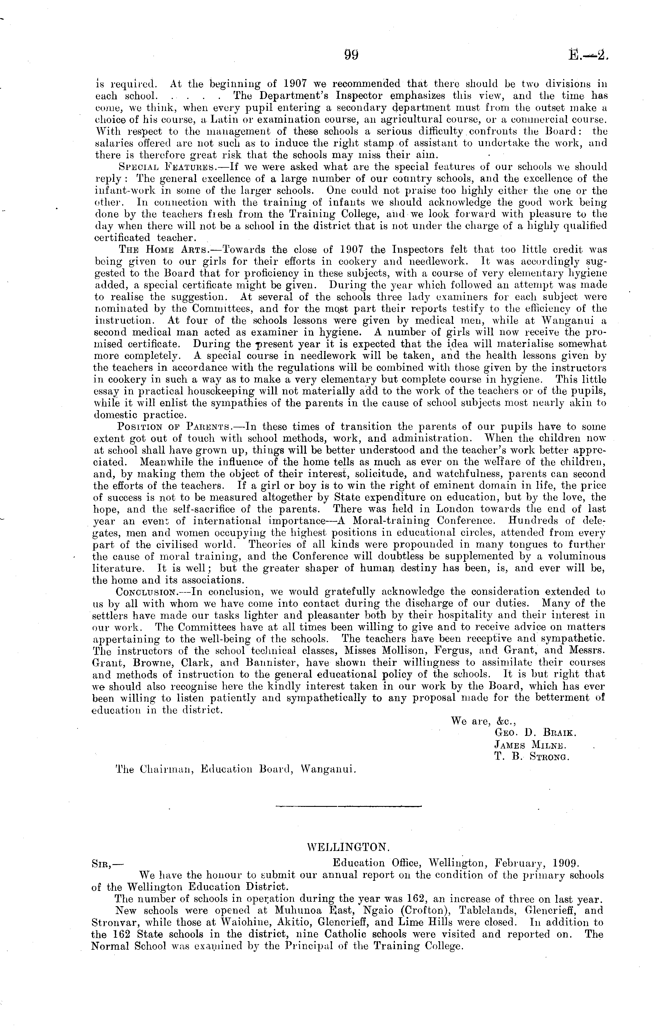 is required. At the beginning of 1907 we recommended that there should be two divisions in each school The Department's Inspector emphasizes this view, and the time has come, we think, when every pupil entering a secondary department must from the outset make a choice of his course, a Latin or examination course, an agricultural course, or a commercial course. With respect to the management of these schools a serious difficulty confronts the Board: the salaries offered are not such as to induce the right stamp of assistant to undertake the work, and there is therefore great risk that the schools may miss their aim. Special Features.—lf we were asked what are the special features of our schools we should reply : The general excellence of a large number of our country schools, and the excellence of the infant-work in some of the larger schools. One could not praise too highly either the one or the other. In connection with the training of infants we should acknowledge the good work being done by the teachers fiesh from the Training College, and we look forward with pleasure to the day when there will not be a school in the district that is not under the charge of a highly qualified certificated teacher. The Home Abts. —Towards the close of 1907 the Inspectors felt that too little credit was being given to our girls for their efforts in cookerj' and needlework. It was accordingly suggested to the Board that for proficiency in these subjects, with a course of very elementary hygiene added, a special certificate might be given. During the year which followed an attempt was made to realise the suggestion. At several of the schools three lady examiners for each subject were nominated by the Committees, and for the mo.st part their reports testify to the efficiency of the instruction. At four of the schools lessons were given by medical men, while at Wanganui a second medical man acted as examiner in hygiene. A number of girls will now receive the promised certificate. During the present year it is expected that the idea will materialise somewhat more completely. A special course in needlework will be taken, and the health lessons given by the teachers in accordance with the regulations will be combined with, those given by the instructors in cookery in such a way as to make a very elementary but complete course in hygiene. This little essay in practical housekeeping will not materially add to the work of the teachers or of the pupils, while it will enlist the sympathies of the parents in the cause of school subjects most nearly akin to domestic practice. Position of Parents. —In these times of transition the parents of our pupils have to some extent got out of touch with school methods, work, and administration. When the children now at school shall have grown tip, things will be better understood and the teacher's work better appreciated. Meanwhile the influence of the home tells as much as ever on the welfare of the children, and, by making them the object of their interest, solicitude, and watchfulness, parents can second the efforts of the teachers. If a girl or boy is to win the right of eminent domain in life, the price of success is not to be measured altogether by State expenditure on education, but by the love, the hope, and the self-sacrifice of the parents. There was held in London towards the end of last year an even'; of international importance —A Moral-training Conference. Hundreds of delegates, men and women occupying the highest positions in educational circles, attended from every part of the civilised world. Theories of all kinds were propounded in many tongues to further the cause of moral training, and the Conference will doubtless be supplemented by a voluminous literature. It is well; but the greater shaper of human destiny has been, is, and ever will be, the home and its associations. Conclttsion. —In conclusion, we would gratefully acknowledge the consideration extended to us by all with whom we have come into contact during the discharge of our duties. Many of the settlers have made our tasks lighter and pleasanter both by their hospitality and their interest in our work. The Committees have at all times been willing to give and to receive advice on matters appertaining to the well-being of the schools. The teachers have been receptive and sympathetic. The instructors of the school technical classes, Misses Mollison, Fergus, and Grant, and Messrs. Grant, Browne, Clark, and Bannister, have shown their willingness to assimilate their courses and methods of instruction to the general educational policy of the schools. It is but right that we should also recognise here the kindly interest taken in our work by the Board, which has ever been willing to listen patiently and sympathetically to any proposal made for the betterment of education in the district. We arc, &c, Geo. D. Braik. James Milne. T. B. Strong. The Chairman, Education Board, Wanganui.