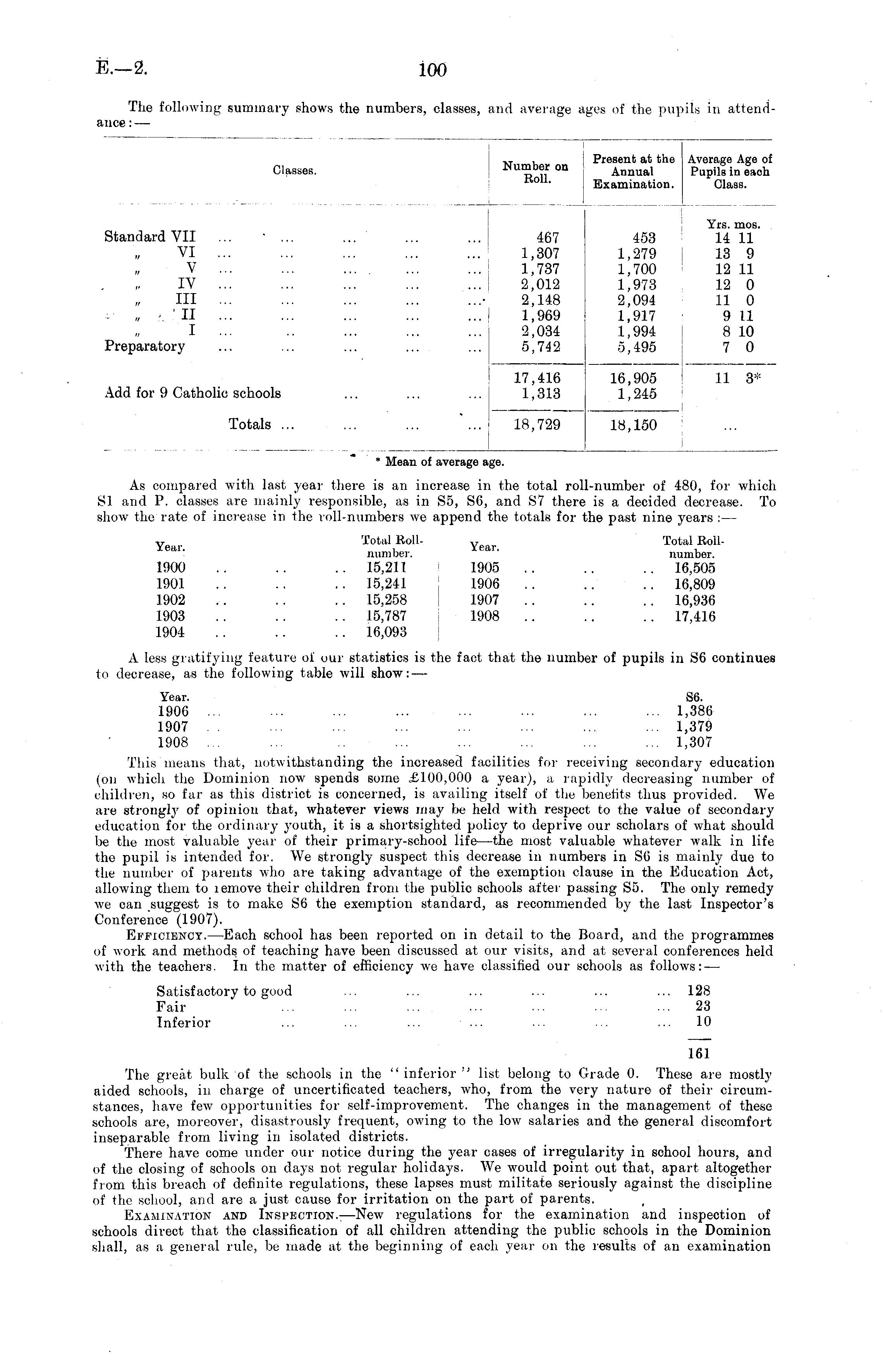 As compared with last year there is an increase in the total roll-number of 480, for which SI and P. classes are mainly responsible, as in S5, S6, and S7 there is a decided decrease. To show the rate of increase in the roll-numbers we append the totals for the past nine years :— v Total Roll- v Total Roll- • number. '"■ number. 1900 .. .. .. 15,211 1905 .. .. .. 16,505 1901 .. .. .. 15,241 1906 .. .. .. 16,809 1902 .. .. .. 15,258 1907 .. .. .. 16,936 1903 .. .. .. 15,787 1908 .. .. .. 17,416 1904 .. .. .. 16,093 A less gratifying feature of our statistics is the fact that the number of pupils in S6 continues to decrease, as the following table will show: — Year. 86. 1906 ... ... ... ... ... ... ... ... 1,386 1907 . . ... ... ... ... ... ... ... 1,379 1908 ... ... .. ... ... ... ... ... 1,307 This means that, notwithstanding the increased facilities for receiving secondary education (on which the Dominion now spends some £100,000 a year), a rapidly decreasing number of children, so far as this district is concerned, is availing itself of the benefits thus provided. We are strongly of opinion that, whatever views may be held with respect to the value of secondary education for the ordinary youth, it is a shortsighted policy to deprive our scholars of what should be the most valuable year of their primary-school life—the most valuable whatever walk in life the pupil is intended for. We strongly suspect this decrease in numbers in SO is mainly due to the number of parents who are taking advantage of the exemption clause in the Education Act, allowing them to lemove their children from the public schools after passing S5. The only remedy we can suggest is to make S6 the exemption standard, as recommended by the last Inspector's Conference (1907). Efficiency.—Each school has been reported on in detail to the Board, and the programmes iif work and methods of teaching have been discussed at our visits, and at several conferences held with the teachers. In the matter of efficiency we have classified our schools as follows: — Satisfactory to good ... ... ... ... ... ... 128 Fair ... ... ... ... ... ... ... 23 Inferior ... ... ... ... ... ... ... 10 161 The great bulk of the schools in the " inferior " list belong to Grade 0. These are mostly aided schools, in charge of uncertificated teachers, who, from the very nature of their circumstances, have few opportunities for self-improvement. The changes in the management of these schools are, moreover, disastrously frequent, owing to the low salaries and the general discomfort inseparable from living in isolated districts. There have come under our notice during the year cases of irregularity in school hours, and of the closing of schools on days not regular holidays. We would point out that, apart altogether from this breach of definite regulations, these lapses must militate seriously against the discipline of the school, and are a just cause for irritation on the part of parents. Examination and Inspection.:—New regulations for the examination and inspection of schools direct that the classification of all children attending the public schools in the Dominion shall, as a general rule, be made at the beginning of each year on the results of an examination