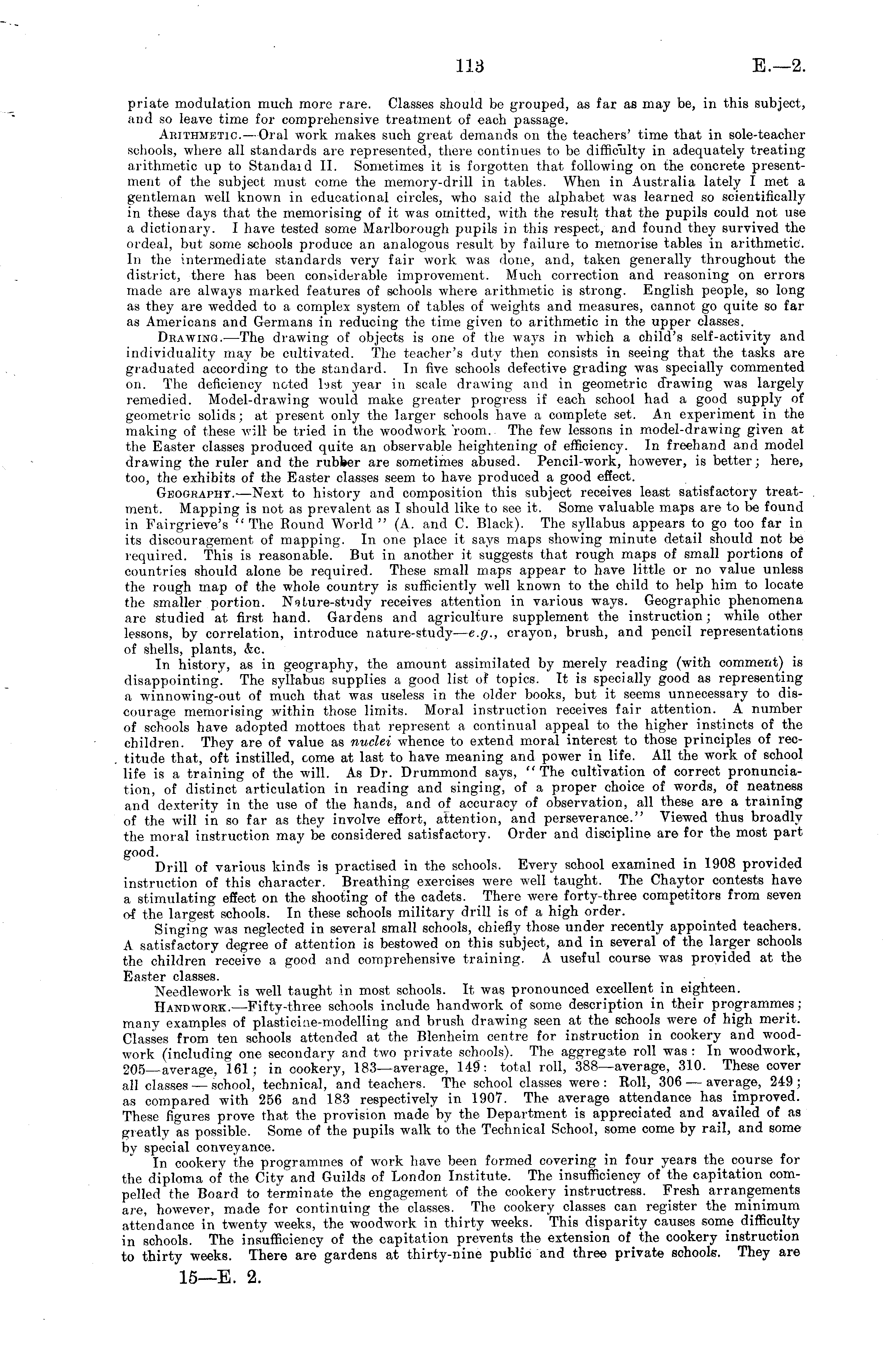priate modulation much more rare. Classes should be grouped, as far as may be, in this subject, and so leave time for comprehensive treatment of each passage. Arithmetic. —Oral work makes such great demands on the teachers' time that in sole-teacher schools, where all standards are represented, there continues to be difficulty in adequately treating arithmetic up to Standaid 11. Sometimes it is forgotten that following on the concrete presentment of the subject must come the memory-drill in tables. When in Australia lately I met a gentleman well known in educational circles, who said the alphabet was learned so scientifically in these days that the memorising of it was omitted, with the result that the pupils could not use a dictionary. I have tested some Marlborough pupils in this respect, and found they survived the ordeal, but some schools produce an analogous result by failure to memorise tables in arithmetic. In the intermediate standards very fair work was done, and, taken generally throughout the district, there has been considerable improvement. Much correction and reasoning on errors made are always marked features of schools where arithmetic is strong. English people, so long as they are wedded to a complex system of tables of weights and measures, cannot go quite so far as Americans and Germans in reducing the time given to arithmetic in the upper classes. Drawing.—The drawing of objects is one of the ways in which a child's self-activity and individuality may be cultivated. The teacher's duty then consists in seeing that the tasks are graduated according to the standard. In five schools defective grading was specially commented on. The deficiency noted year in scale drawing and in geometric drawing was largely remedied. Model-drawing would make greater progress if each school had a good supply of geometric solids; at present only the larger schools have a complete set. An experiment in the making of these will be tried in the woodwork room. The few lessons in model-drawing given at the Easter classes produced quite an observable heightening of efficiency. In freehand and model drawing the ruler and the rubber are sometimes abused. Pencil-work, however, is better; here, too, the exhibits of the Easter classes seem to have produced a good effect. Geography.—Next to history and composition this subject receives least satisfactory treatment. Mapping is not as prevalent as I should like to see it. Some valuable maps are to be found in Fairgrieve's "The Round World" (A. and C. Black). The syllabus appears to go too far in its discouragement of mapping. In one place it says maps showing minute detail should not be required. This is reasonable. But in another it suggests that rough maps of small portions of countries should alone be required. These small maps appear to have little or no value unless the rough map of the whole country is sufficiently well known to the child to help him to locate the smaller portion. Neture-study receives attention in various ways. Geographic phenomena are studied at first hand. Gardens and agriculture supplement the instruction; while other lessons, by correlation, introduce nature-study— e.g., crayon, brush, and pencil representations of shells, plants, &o. In history, as in geography, the amount assimilated by merely reading (with comment) is disappointing. The syllabus supplies a good list of topics. It is specially good as representing a winnowing-out of much that was useless in the older books, but it seems unnecessary to discourage memorising within those limits. Moral instruction receives fair attention. A number of schools have adopted mottoes that represent a continual appeal to the higher instincts of the children. They are of value as nuclei whence to extend moral interest to those principles of rectitude that, oft instilled, come at last to have meaning and power in life. All the work of school life is a training of the will. As Dr. Drummond says, "The cultivation of correct pronunciation, of distinct articulation in reading and singing, of a proper choice of words, of neatness and dexterity in the use of the hands, and of accuracy of observation, all these are a training of the will in so far as they involve effort, attention, and perseverance." Viewed thus broadly the moral instruction may be considered satisfactory. Order and discipline are for the most part good. Drill of various kinds is practised in the schools. Every school examined in 1908 provided instruction of this character. Breathing exercises were well taught. The Chaytor contests have a stimulating effect on the shooting of the cadets. There were forty-three competitors from seven of the largest schools. In these schools military drill is of a high order. Singing was neglected in several small schools, chiefly those under recently appointed teachers. A satisfactory degree of attention is bestowed on this subject, and in several of the larger schools the children receive a good and comprehensive training. A useful course was provided at the Easter classes. Needlework is well taught in most schools. It was pronounced excellent in eighteen. Handwork. —Fifty-three schools include handwork of some description in their programmes; many examples of plasticine-modelling and brush drawing seen at the schools were of high merit. Classes from ten schools attended at the Blenheim centre for instruction in cookery and woodwork (including one secondary and two private schools). The aggregate roll was :In woodwork, 205—average, 161; in cookery, 183—average, 149: total roll, 388—average, 310. These cover all classes — school, technical, and teachers. The school classes were: Roll, 306 — average, 249; as compared with 256 and 183 respectively in 1907. The average attendance has improved. These figures prove that the provision made by the Department is appreciated and availed of as greatly as possible. Some of the pupils walk to the Technical School, some come by rail, and
