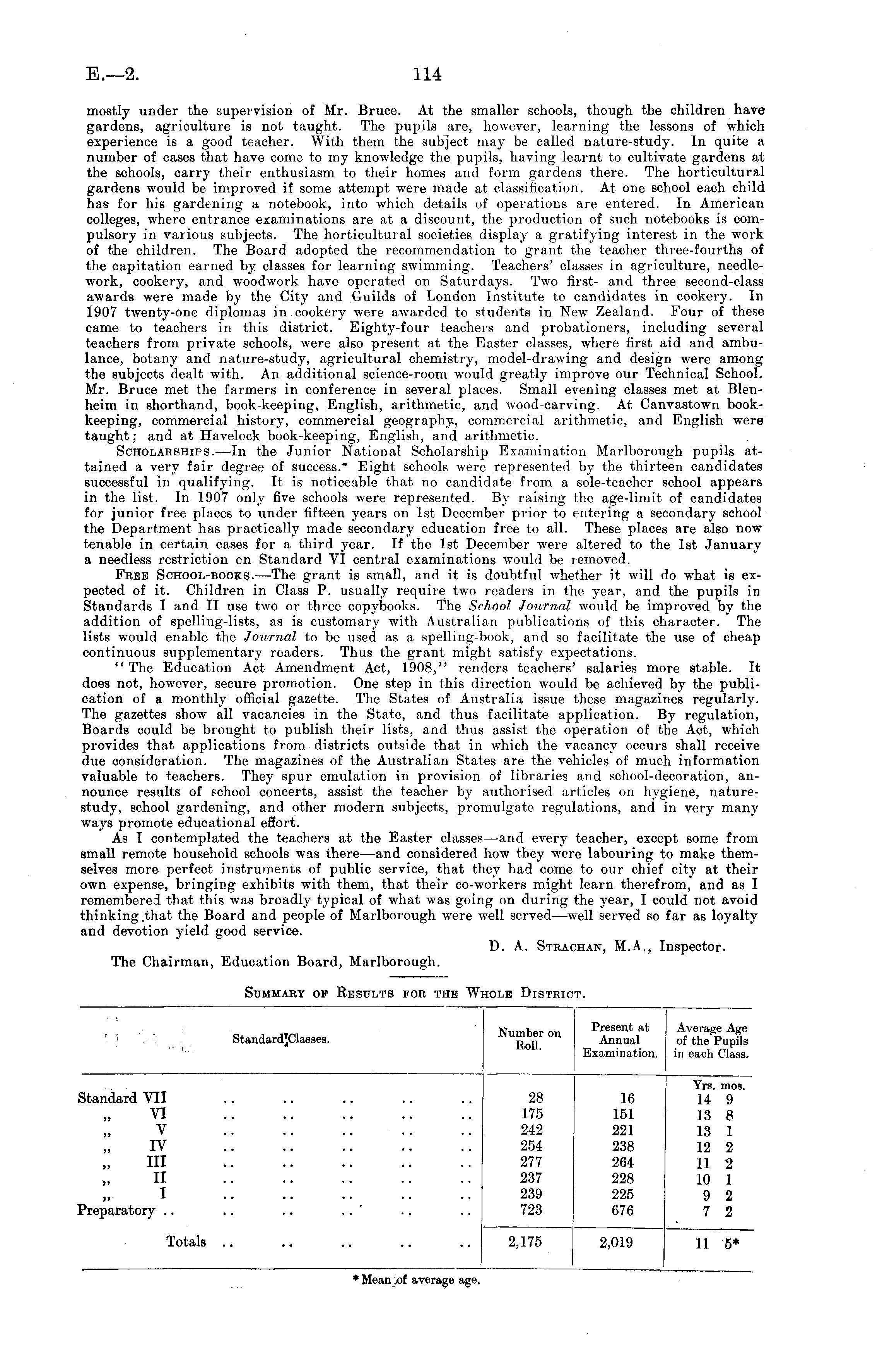 mostly under the supervision of Mr. Bruce. At the smaller schools, though the children have gardens, agriculture is not taught. The pupils are, however, learning the lessons of which experience is a good teacher. With them the subject may be called nature-study. In quite a number of cases that have come to my knowledge the pupils, having learnt to cultivate gardens at the schools, carry their enthusiasm to their homes and form gardens there. The horticultural gardens would be improved if some attempt were made at classification. At one school each child has for his gardening a notebook, into which details of operations are entered. In American colleges, where entrance examinations are at a discount, the production of such notebooks is compulsory in various subjects. The horticultural societies display a gratifying interest in the work of the children. The Board adopted the recommendation to grant the teacher three-fourths of the capitation earned by classes for learning swimming. Teachers' classes in agriculture, needlework, cookery, and woodwork have operated on Saturdays. Two first- and three second-class awards were made by the City and Guilds of London Institute to candidates in cookery. In 1907 twenty-one diplomas in cookery were awarded to students in New Zealand. Four of these came to teachers in this district. Eighty-four teachers and probationers, including several teachers from private schools, were also present at the Easter classes, where first aid and ambulance, botany and nature-study, agricultural chemistry, model-drawing and design were among the subjects dealt with. An additional science-room would greatly improve our Technical School. Mr. Bruce met the farmers in conference in several places. Small evening classes met at Blenheim in shorthand, book-keeping, English, arithmetic, and wood-carving. At Canvastown bookkeeping, commercial history, commercial geography., commercial arithmetic, and English were taught; and at Havelock book-keeping, English, and arithmetic. Scholarships.—ln the Junior National Scholarship Examination Marlborough pupils attained a very fair degree of success." Eight schools were represented by the thirteen candidates successful in qualifying. It is noticeable that no candidate from a sole-teacher school appears in the list. In 1907 only five schools were represented. By raising the age-limit of candidates for junior free places to under fifteen years on Ist December prior to entering a secondary school the Department has practically made secondary education free to all. These places are also now tenable in certain cases for a third year. If the Ist December were altered to the Ist January a needless restriction on Standard VI central examinations would be removed. Free School-books. —The grant is small, and it is doubtful whether it will do what is expected of it. Children in Class P. usually require two readers in the year, and the pupils in Standards I and II use two or three copybooks. The School Journal would be improved by the addition of spelling-lists, as is customary with Australian publications of this character. The lists would enable the Journal to be used as a spelling-book, and so facilitate the use of cheap continuous supplementary readers. Thus the grant might satisfy expectations. "The Education Act Amendment Act, 1908," renders teachers' salaries more stable. It does not, however, secure promotion. One step in this direction would be achieved by the publication of a monthly official gazette. The States of Australia issue these magazines regularly. The gazettes show all vacancies in the State, and thus facilitate application. By regulation, Boards could be brought to publish their lists, and thus assist the operation of the Act, which provides that applications from districts outside that in which the vacancy occurs shall receive due consideration. The magazines of the Australian States are the vehicles of much information valuable to teachers. They spur emulation in provision of libraries and school-decoration, announce results of school concerts, assist the teacher by authorised articles on hygiene, nature r study, school gardening, and other modern subjects, promulgate regulations, and in very many ways promote educational effort. As I contemplated the teachers at the Easter classes—and every teacher, except some from small remote household schools was there—and considered how they were labouring to make themselves more perfect instruments of public service, that they had come to our chief city at their own expense, bringing exhibits with them, that their co-workers might learn therefrom, and as I remembered that this was broadly typical of what was going on during the year, I could not avoid thinking .that the Board and people of Marlborough were well served —well served so far as loyalty and devotion yield good service. D. A. Strachan, M.A., Inspector. The Chairman, Education Board, Marlborough.