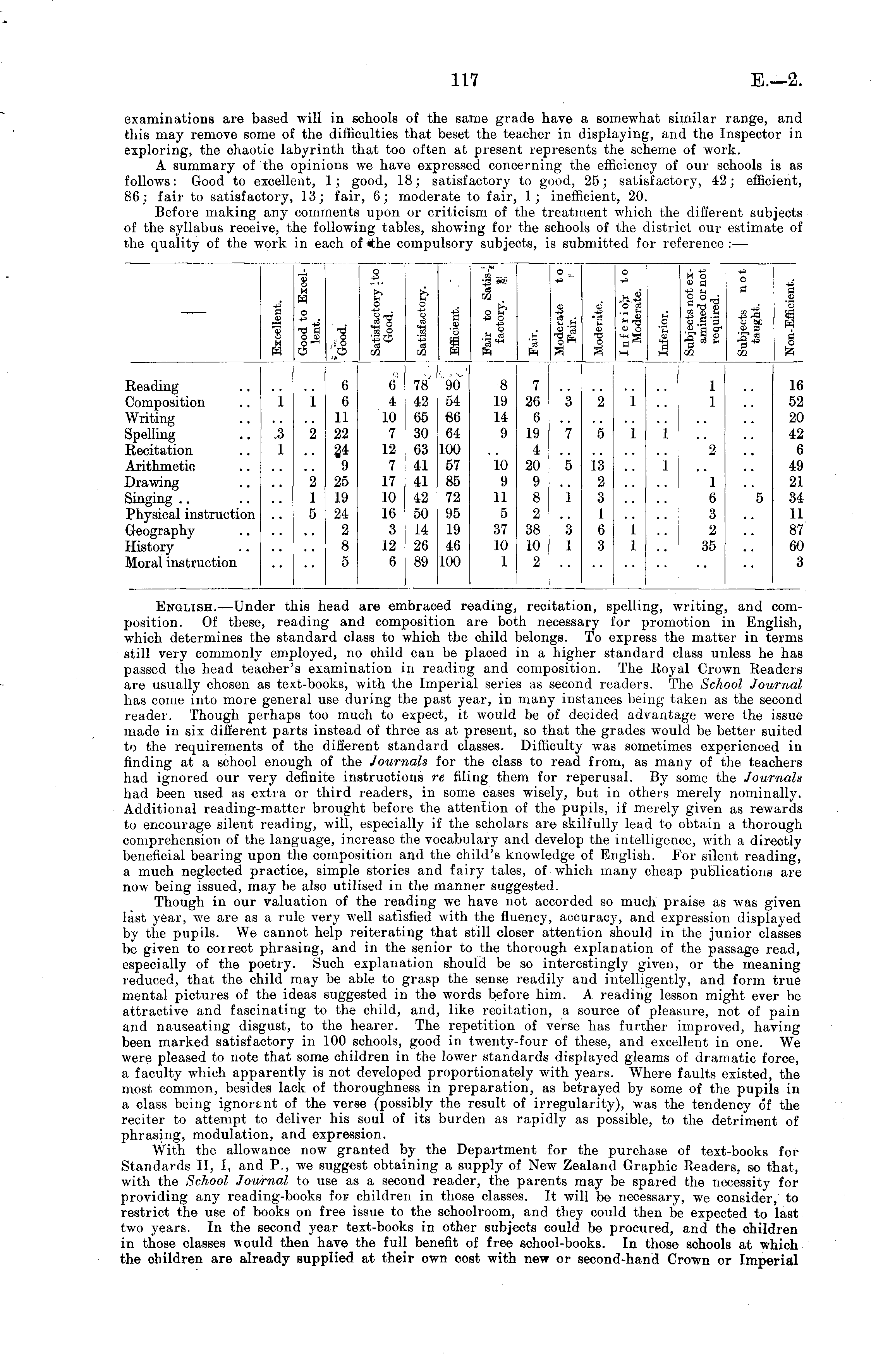 examinations are based will in schools of the same grade have a somewhat similar range, and this may remove some of the difficulties that beset the teacher in displaying, and the Inspector in exploring, the chaotic labyrinth that too often at present represents the scheme of work. A summary of the opinions we have expressed concerning the efficiency of our schools is as follows: Good to excellent, 1 ; good, 18; satisfactory to good, 25; satisfactory, 42; efficient, 80; fair to satisfactory, 13; fair, 6; moderate to fair, 1; inefficient, 20. Before making any comments upon or criticism of the treatment which the different subjects of the syllabus receive, the following tables, showing for the schools of the district our estimate of the quality of the work in each of «the compulsory subjects, is submitted for reference : —