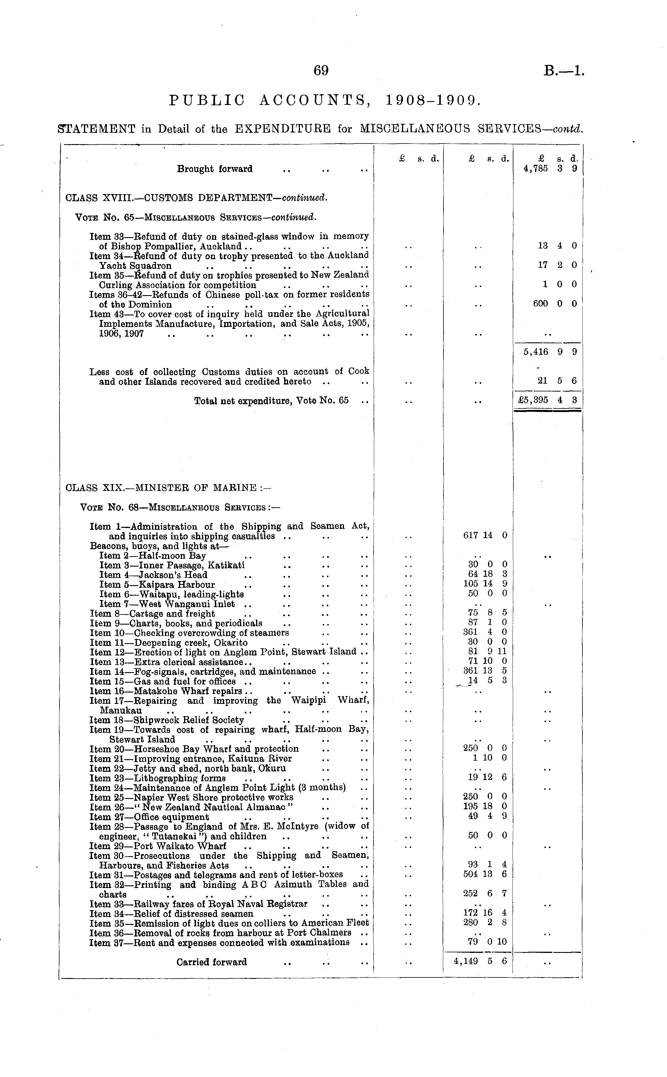 Brought forward £ s. d. £ b. d. £ 3. d. 4,785 3 9 CLASS XVIII.—CUSTOMS DEPARTMENT— continued. Vote No. 65—Miscellaneous Services— continued. Item 33—Refund of duty on Btained-glass window in memory of Bishop Pompallier, Auokland Item 34—Refund of duty on trophy presented to the Auokland Yaoht Squadron Item 35—Refund of duty on trophies presented to New Zealand Curling Association for competition Items 36-42 —Refunds of Chinese poll-tax on former residents of the Dominion Item 43—To cover cost of inquiry held under the Agricultural Implements Manufacture, Importation, and Sale Acts, 1905, 1906, 1907 13 4 0 17 2 0 10 0 600 0 0 5,416 9 9 Less cost of collecting Customs duties on aocount of Cook and other Islands recovered and credited hereto 21 5 6 Total net expenditure, Vote No. 65 .. £5,395 4 3 CLASS XIX.—MINISTER OF MARINE :— Vote No. 68—Miscellaneous Services :— Item 1—Administration of the Shipping and Seamen Aot, and inquiries into shipping casualties Beacons, buoys, and lights at — Item 2—Half-moon Bay Item 3—Inner Passage, Katikati Item 4—Jackson's Head Item 5—Kaipara Harbour Item 6—Waitapu, leading-lights Item 7—WeBt Wanganui Inlet Item 8—Cartage and freight Item 9—Charts, books, and periodicals Item 10 —Cheoking overcrowding of steamers Item 11—Deepening creek, Okarito Item 12—Erection of light on Anglem Point, Stewart Island .. Item 13—Extra clerioal assistance Item 14—Fog-signals, cartridges, and maintenance Item 15 —Gas and fuel for offices Item 16—Matakohe Wharf repairs Item 17 —Repairing and improving the Waipipi Wharf, Manukau Item 18—Shipwreok Relief Society Item 19 —Towards cost of repairing wharf, Half-moon Bay, Stewart Island Item 20 —Horseshoe Bay Wharf and protection Item 21—Improving entrance, Kaituna River Item 22—Jetty and shed, north bank, Okuru Item 23—Lithographing forms Item 24—Maintenance of Anglem Point Light (3 months) Item 25—Napier West Shore protective works Item 26—" New Zealand Nautioal Almanao " Item 27 —Office equipment Item 28—Passage to England of Mrs. E. Mclntyre (widow of engineer, " Tutanekai ") and ohildren Item 29—Port Waikato Wharf Item 30—Prosecutions under the Shipping and Seamen, Harbours, and Fisheries Acts Item 31—Postages and telegrams and rent of letter-boxes Item 32—Printing and binding ABC Azimuth Tables and charts Item 33—Railway fares of Royal Naval Registrar Item 34—Relief of distressed seamen Item 35—Remission of light dues on colliers to American Fleet Item 36—Removal of rocks from harbour at Port Chalmers .. Item 37—Rent and expenses oonneoted with examinations .. 617 14 0 30 0 0 64 18 3 105 14 9 50 0 0 75 8 5 87 1 0 361 4 0 30 0 0 81 9 11 71 10 0 361 13 5 14 5 3 250" 0 0 1 10 0 19 12 6 250 0 0 195 18 0 49 4 9 50 0 0 93 1 4 504 13 6 252 6 7 172" 16 4 280 2 8 79' 0 10 Carried forward 4,149 5 6