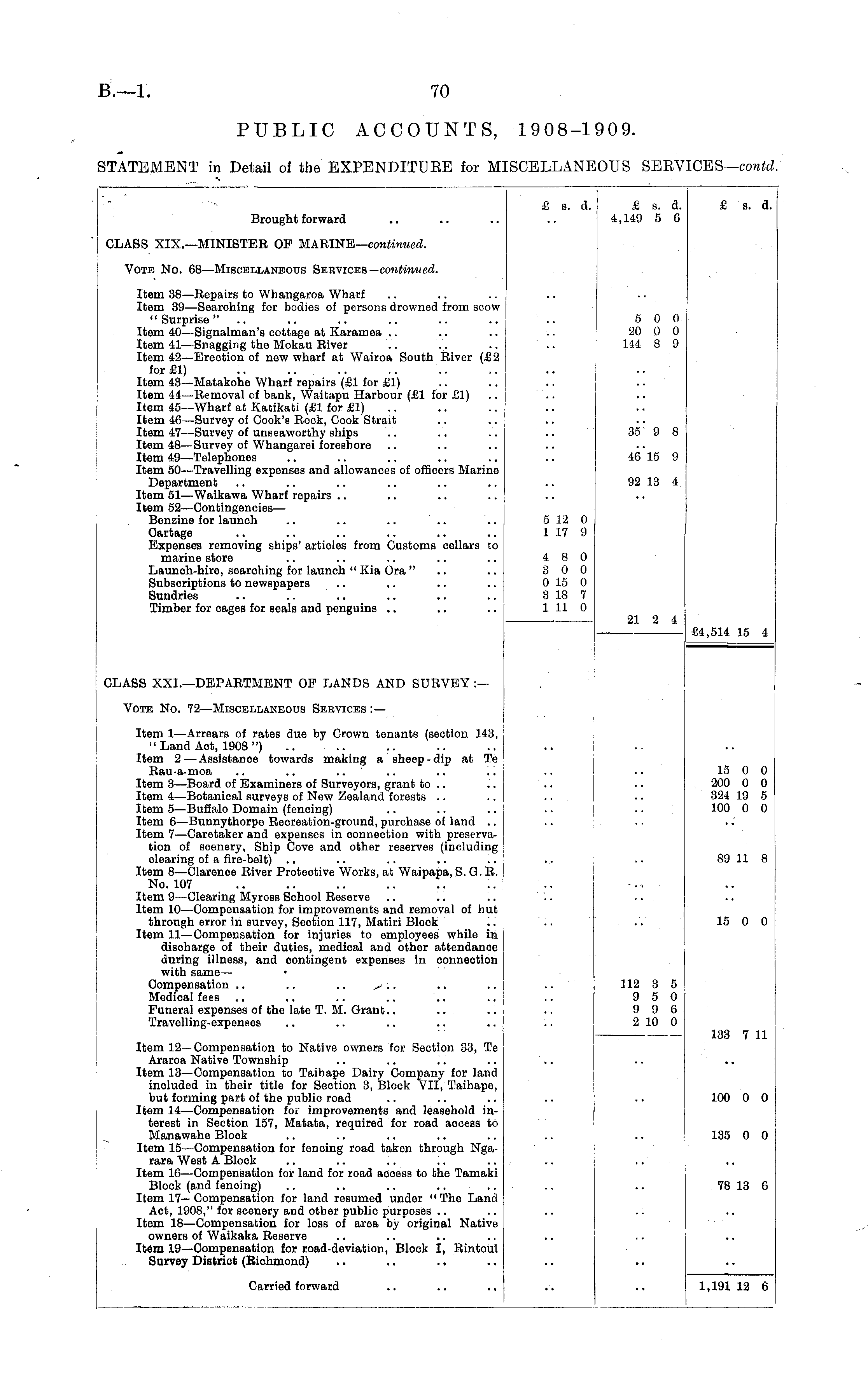 Brought forward £ s. d £ s. d. 4,149 5 6 s. CLASS XIX.—MINISTER OF MARINE— continued. Vote No. 68—Miscellaneous Services —continued. Item 38 —Repairs to Whangaroa Wharf Item 39 —Searching for bodies of persons drowned from scow " Surprise " .. Item 40—Signalman's cottage at Karamea Item 41—Snagging the Mokau River Item 42—Erection of new wharf at Wairoa South River (£2 for £1) Item 43—Matakohe Wharf repairs (£1 for £1) Item 44—Removal of bank, Waitapu Harbour (£1 for £1) Item 45—Wharf at Katikati (£1 for £1) Item 46—Survey of Cook's Rock, Cook Strait Item 47—Survey of unseaworthy ships Item 48—Survey of Whangarei foreshore Item 49—Telephones Item 50—Travelling expenses and allowances of officers Marine Department Item 51—Waikawa Wharf repairs Item 52—Contingencies— Benzine for launoh .. .. .. .. Cartage Expenses removing ships' articles from Customs cellars to marine store Launch-hire, searching for launch " Kia Ora " Subscriptions to newspapers Sundries Timber for cages for seals and penguins 5 0 0 20 0 0 144 8 9 35 - 9 8 4615 9 92 13 4 5 12 0 1 17 9 4 8 0 3 0 0 0 15 0 3 18 7 1 11 0 21 2 4 £4,514 15 4 CLASS XXI.—DEPARTMENT OF LANDS AND SURVEY :— Vote No. 72 —Miscellaneous Seevices :— Item 1—Arrears of rates due by Crown tenants (section 143, " Land Act, 1908 ") Item 2 — Assistance towards making a sheep-dip at Te Rau-a-moa Item 3—Board of Examiners of Surveyors, grant to .. Item 4—Botanical surveys of New Zealand forests Item 5 —Buffalo Domain (fenoing) Item 6—Bunnythorpe Recreation-ground, purchase of land .. Item 7 —Caretaker and expenses in connection with preservation of scenery, Ship Cove and other reserves (including clearing of a fire-belt) Item 8 —Clarence River Protective Works, at Waipapa, S. G. R. No. 107 Item 9—Clearing Myross School Reserve Item 10—Compensation for improvements and removal of hut through error in survey, Section 117, Matiri Block Item 11—Compensation for injuries to employees while in discharge of their duties, medical and other attendance during illness, and contingent expenses in connection with same— Compensation .. .. .. ... Medioal fees Funeral expenses of the late T. M. Grant.. Travelling-expenses 15 0 0 200 0 0 324 19 5 100 0 0 89 11 8 15 0 0 112 3 5 9 5 0 9 9 6 2 10 0 Item 12—Compensation to Native owners for Section 33, Te Araroa Native Township Item 13—Compensation to Taihape Dairy Company for land included in their title for Section 3, Block VII, Taihape, but forming part of the public road Item 14—Compensation for improvements and leasehold interest in Section 157, Matata, required for road access to Manawahe Blook Item 15 —Compensation for fencing road taken through Ngarara West A Blook Item 16—Compensation for land for road aocess to the Tamaki Block (and fenoing) Item 17— Compensation for land resumed under " The Land Act, 1908," for scenery and other public purposes Item 18—Compensation for loss of area by original Native owners of Waikaka Reserve Item 19—Compensation for road-deviation, Block I, Rintoul Survey District (Richmond) 133 7 11 100 0 0 135 0 0 78 13 6 Carried forward 1,191 12 6