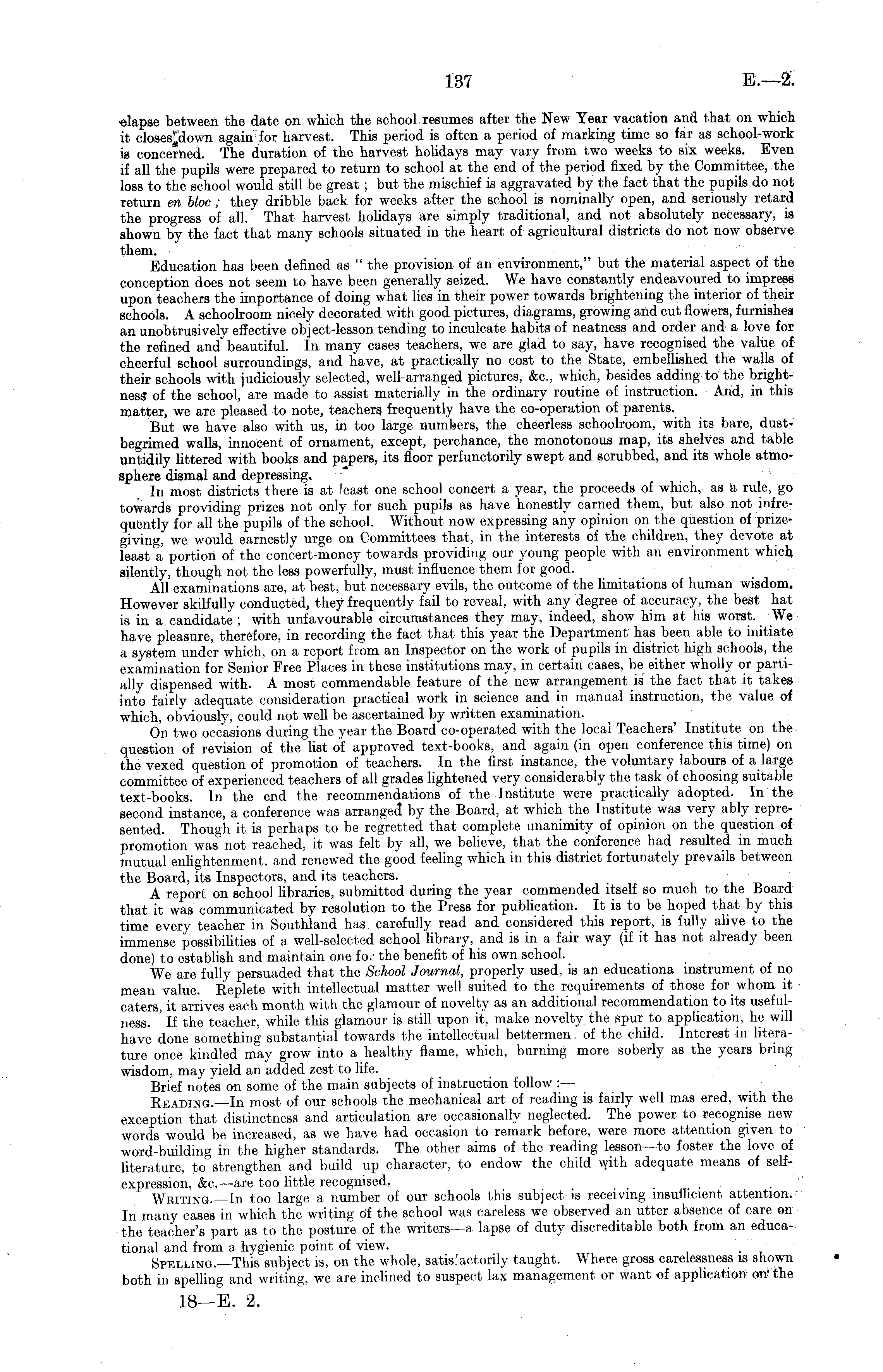 «lapse between the date on which the school resumes after the New Year vacation and that on which it closesTdown again for harvest. This period is often a period of marking time so far as school-work is concerned. The duration of the harvest holidays may vary from two weeks to six weeks. Even if all the pupils were prepared to return to school at the end of the period fixed by the Committee, the loss to the school would still be great; but the mischief is aggravated by the fact that the pupils do not return en bhc ; they dribble back for weeks after the school is nominally open, and seriously retard the progress of all. That harvest holidays are simply traditional, and not absolutely necessary, is shown by the fact that many schools situated in the heart of agricultural districts do not now observe them. Education has been defined as " the provision of an environment," but the material aspect of the conception does not seem to have been generally seized. We have constantly endeavoured to impress upon teachers the importance of doing what lies in their power towards brightening the interior of their schools. A schoolroom nicely decorated with good pictures, diagrams, growing and cut flowers, furnishes an unobtrusively effective object-lesson tending to inculcate habits of neatness and order and a love for the refined and beautiful. In many cases teachers, we are glad to say, have recognised the value of cheerful school surroundings, and have, at practically no cost to the State, embellished the walls of their schools with judiciously selected, well-arranged pictures, &c, which, besides adding to the brightness of the school, are made to assist materially in the ordinary routine of instruction. And, in this matter, we are pleased to note, teachers frequently have the co-operation of parents. But we have also with us, in too large numbers, the cheerless schoolroom, with its bare, dustbegrimed walls, innocent of ornament, except, perchance, the monotonous map, its shelves and table untidily littered with books and papers, its floor perfunctorily swept and scrubbed, and its whole atmosphere dismal and depressing. In most districts there is at least one school concert a year, the proceeds of which, as a rule, go towards providing prizes not only for such pupils as have honestly earned them, but also not infrequently for all the pupils of the school. Without now expressing any opinion on the question of prizegiving, we would earnestly urge on Committees that, in the interests of the children, they devote at least a portion of the concert-money towards providing our young people with an environment which silently, though not the less powerfully, must influence them for good. All examinations are, at best, but necessary evils, the outcome of the limitations of human wisdom. However skilfully conducted, they frequently fail to reveal, with any degree of accuracy, the best hat is in a candidate ; with unfavourable circumstances they may, indeed, show him at his worst. We have pleasure, therefore, in recording the fact that this year the Department has been able to initiate a system under which, on a report fiom an Inspector on the work of pupils in district high schools, the examination for Senior Free Places in these institutions may, in certain cases, be either wholly or partially dispensed with. A most commendable feature of the new arrangement is the fact that it takes into fairly adequate consideration practical work in science and in manual instruction, the value of which, obviously, could not well be ascertained by written examination. On two occasions during the year the Board co-operated with the local Teachers' Institute on the question of revision of the list of approved text-books, and again (in open conference this time) on the vexed question of promotion of teachers. In the first instance, the voluntary labours of a large committee of experienced teachers of all grades lightened very considerably the task of choosing suitable text-books. In the end the recommendations of the Institute were practically adopted. In the second instance, a conference was arranged" by the Board, at which the Institute was very ably represented. Though it is perhaps to be regretted that complete unanimity of opinion on the question of promotion was not reached, it was felt by all, we believe, that the conference had resulted in much mutual enlightenment, and renewed the good feeling which in this district fortunately prevails between the Board, its Inspectors, and its teachers. A report on school libraries, submitted during the year commended itself so much to the Board that it was communicated by resolution to the Press for publication. It is to be hoped that by this time every teacher in Southland has carefully read and considered this report, is fully alive to the immense possibilities of a well-selected school library, and is in a fair way (if it has not already been done) to establish and maintain one for the benefit of his own school. We are fully persuaded that the School Journal, properly used, is an educationa instrument of no mean value. Replete with intellectual matter well suited to the requirements of those for whom it caters, it arrives each month with the glamour of novelty as an additional recommendation to its usefulness. ' If the teacher, while this glamour is still upon it, make novelty the spur to application, he will have done something substantial towards the intellectual bettermen. of the child. Interest in literature once kindled may grow into a healthy flame, which, burning more soberly as the years bring wisdom, may yield an added zest to life. Brief notes on some of the main subjects of instruction follow : — Reading.—ln most of our schools the mechanical art of reading is fairly well mas ered, with the exception that distinctness and articulation are occasionally neglected. The power to recognise new words would be increased, as we have had occasion to remark before, were mo