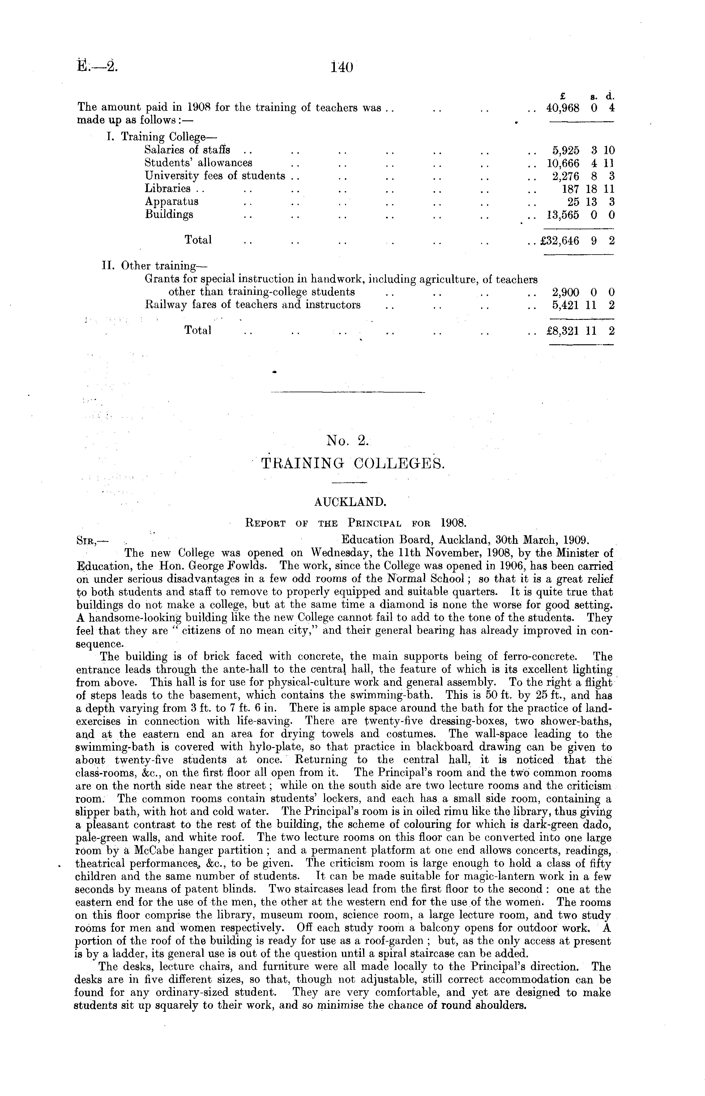 No. 2. TRAINING COLLEGES. AUCKLAND. Report of the Principal for 1908. Sir, — . Education Board, Auckland, 30th March, 1909. The new College was opened on Wednesday, the 11th November, 1908, by the Minister of Education, the Hon. George Fowlds. The work, since the College was opened in 1906, has been carried on under serious disadvantages in a few odd rooms of the Normal School; so that it is a great relief to both students and staff to remove to properly equipped and suitable quarters. It is quite true that buildings do not make a college, but at the same time a diamond is none the worse for good setting. A handsome-looking building like the new College cannot fail to add to the tone of the students. They feel that they are " citizens of no mean city," and their general bearing has already improved in consequence. The building is of brick faced with concrete, the main supports being of ferro-concrete. The entrance leads through the ante-hall to the central hall, the feature of which is its excellent lighting from above. This hall is for use for physical-culture work and general assembly. To the right a flight of steps leads to the basement, which contains the swimming-bath. This is 50 ft. by 25 ft., and has a depth varying from 3 ft. to 7 ft. 6 in. There is ample space around the bath for the practice of landexercises in connection with life-saving. There are twenty-five dressing-boxes, two shower-baths, and at the eastern end an area for drying towels and costumes. The wall-space leading to the swimming-bath is covered with hylo-plate, so that practice in blackboard drawing can be given to about twenty-five students at once. Returning to the central hall, it is noticed that the class-rooms, &c, on the first floor all open from it. The Principal's room and the two common rooms are on the north side near the street; while on the south side are two lecture rooms and the criticism room. The common rooms contain students' lockers, and each has a small side room, containing a slipper bath, with hot and cold water. The Principal's room is in oiled rimu like the library, thus giving a pleasant contrast to the rest of the building, the scheme of colouring for which is dark-green dado, pale-green walls, and white roof. The two lecture rooms on this floor can be converted into one large room by a McCabe hanger partition ; and a permanent platform at one end allows concerts, readings, theatrical &c, to be given. The criticism room is large enough to hold a class of fifty children and the same number of students. It can be made suitable for magic-lantern work in a few seconds by means of patent blinds. Two staircases lead from the first floor to the second : one at the eastern end for the use of the men, the other at the western end for the use of the women. The rooms on this floor comprise the library, museum room, science room, a large lecture room, and two study rooms for men and women respectively. Off each study room a balcony opens for outdoor work. A portion of the roof of the building is ready for use as a roof-garden ; but, as the only access at present is by a ladder, its general use is out of the question until a spiral staircase can be added. The desks, lecture chairs, and furniture were all made locally to the Principal's direction. The desks are in five different sizes, so that, though not adjustable, still correct accommodation can be found for any ordinary-sized student. They are very comfortable, and yet are designed to make students sit up squarely to their work, and so minimise the chance of round shoulders.