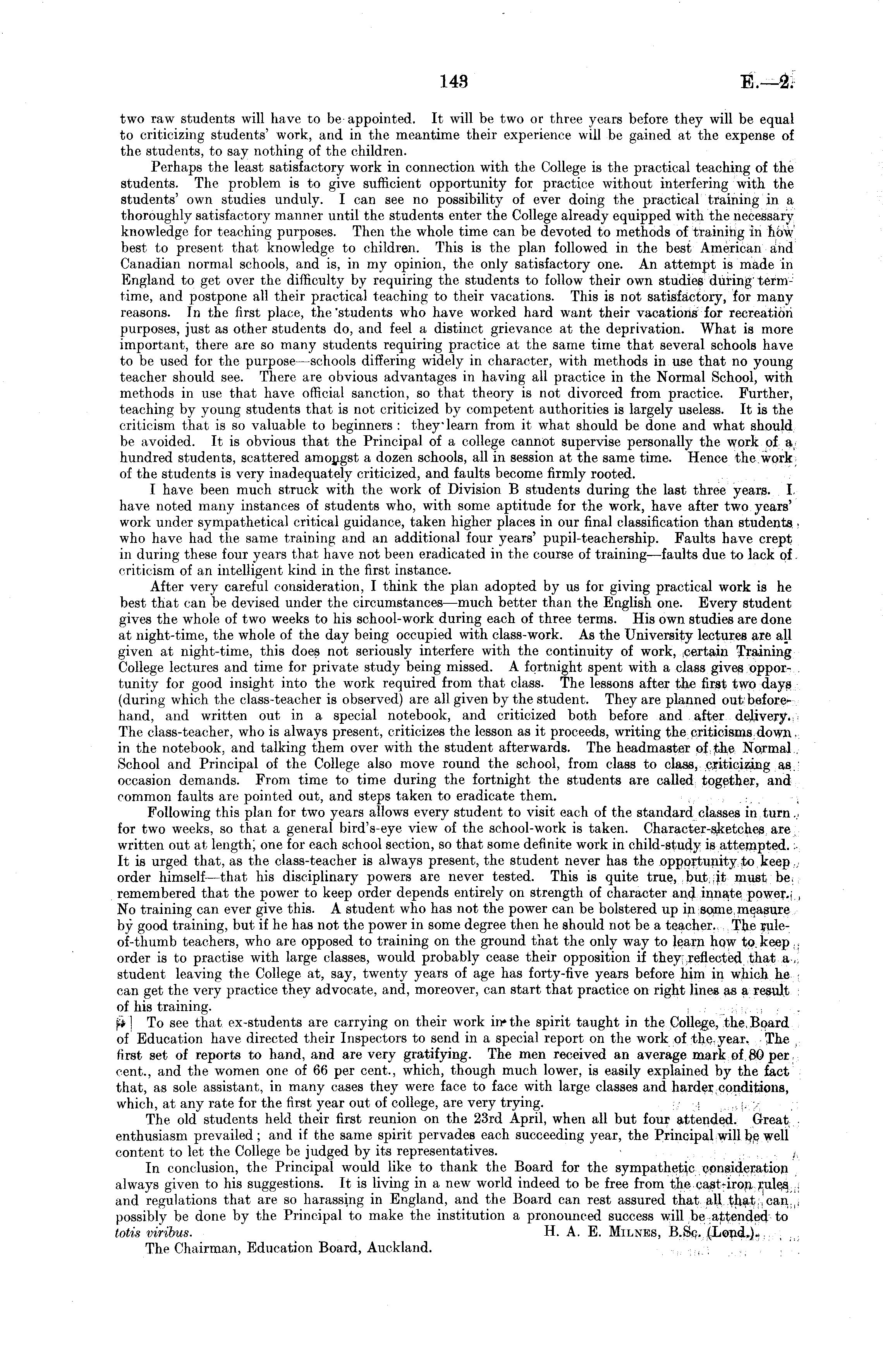 two raw students will have to be appointed. It will be two or three years before they will be equal to criticizing students' work, and in the meantime their experience will be gained at the expense of the students, to say nothing of the children. Perhaps the least satisfactory work in connection with the College is the practical teaching of the students. The problem is to give sufficient opportunity for practice without interfering with the students' own studies unduly. I can see no possibility of ever doing the practical training in a thoroughly satisfactory manner until the students enter the College already equipped with the necessary knowledge for teaching purposes. Then the whole time can be devoted to methods of training in how best to present that knowledge to children. This is the plan followed in the best American and Canadian normal schools, and is, in my opinion, the only satisfactory one. An attempt is made in England to get over the difficulty by requiring the students to follow their own studies during termtime, and postpone all their practical teaching to their vacations. This is not satisfactory, for many reasons. In the first place, the'students who have worked hard want their vacations for recreation purposes, just as other students do, and feel a distinct grievance at the deprivation. What is more important, there are so many students requiring practice at the same time that several schools have to be used for the purpose—schools differing widely in character, with methods in use that no young teacher should see. There are obvious advantages in having all practice in the Normal School, with methods in use that have official sanction, so that theory is not divorced from practice. Further, teaching by young students that is not criticized by competent authorities is largely useless. It is the criticism that is so valuable to beginners : they learn from it what should be done and what should be avoided. It is obvious that the Principal of a college cannot supervise personally the work of a hundred students, scattered amongst a dozen schools, all in session at the same time. Hence the work of the students is very inadequately criticized, and faults become firmly rooted. I have been much struck with the work of Division B students during the last three years. I have noted many instances of students who, with some aptitude for the work, have after two years' work under sympathetical critical guidance, taken higher places in our final classification than students who have had the same training and an additional four years' pupil-teachership. Faults have crept in during these four years that have not been eradicated in the course of training—faults due to lack of criticism of an intelligent kind in the first instance. After very careful consideration, I think the plan adopted by us for giving practical work is he best that can be devised under the circumstances —much better than the English one. Every student gives the whole of two weeks to his school-work during each of three terms. His own studies are done at night-time, the whole of the day being occupied with class-work. As the University lectures are all given at night-time, this does not seriously interfere with the continuity of work, certain Training College lectures and time for private study being missed. A fortnight spent with a class gives opportunity for good insight into the work required from that class. The lessons after the first two days (during which the class-teacher is observed) are all given by the student. They are planned out beforehand, and written out in a special notebook, and criticized both before and after delivery. The class-teacher, who is always present, criticizes the lesson as it proceeds, writing the criticisms down in the notebook, and talking them over with the student afterwards. The headmaster of the Normal School and Principal of the College also move round the school, from class to class, criticizing as occasion demands. From time to time during the fortnight the students are called together, and common faults are pointed out, and steps taken to eradicate them. Following this plan for two years allows every student to visit each of the standard classes in turn. for two weeks, so that a general bird's-eye view of the school-work is taken. Character-sketches are written out at length; one for each school section, so that some definite work in child-study is attempted. It is urged that, as the class-teacher is always present, the student never has the opportunity to keep order himself —that his disciplinary powers are never tested. This is quite true, but it must be remembered that the power to keep order depends entirely on strength of character and innate power. No training can ever give this. A student who has not the power can be bolstered up in some measure by good training, but if he has not the power in some degree then he should not be a teacher. The rule-of-thumb teachers, who are opposed to training on the ground that the only way to learn how to keep order is to practise with large classes, would probably cease their opposition if they reflected that a<, student leaving the College at, say, twenty years of age has forty-five years before him in which he can get the very practice they advocate, and, moreover, can start that practice on right lines as a result of his training. pi] To see that ex-students are carrying on their work in*the spirit taught in the College, the Board of Education have directed their Inspectors to send in a special report on the work of the year. The first set of reports to hand, and are very gratifying. The men received an average mark of 80 per cent., and the women one of 66 per cent., which, though much lower, is easily explained by the fact that, as sole assistant, in many cases they were face to face with large classes and harder conditions, which, at any rate for the first year out of college, are very trying. The old students held their fi