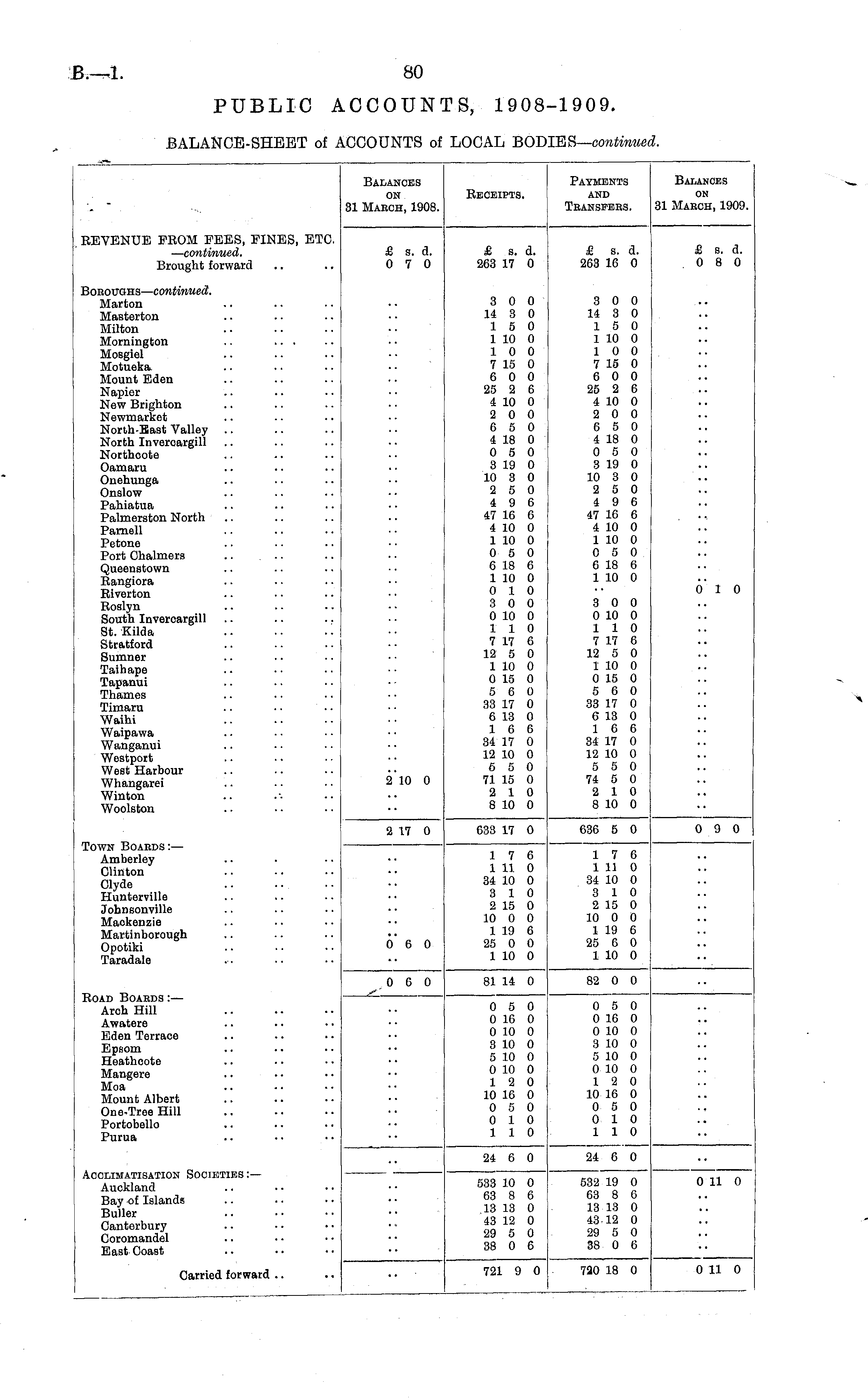Balances on 31 March, 1908. Receipts. Payments AND Tbansfees. Balances ON 31 March, 1909, REVENUE FROM FEES, FINES, ETC — continued. Brought forward £ s. d. 0 7 0 £ s. d. 263 17 0 £ s. d. 263 16 0 £ s. d. 0 8 0 Boroughs— continued. Marton Masterton Milton Mornington .. ... Mosgiel Motueka Mount Eden Napier New Brighton Newmarket North-East Valley North Invercargill Northcote Oamaru Onehunga Onslow Pahiatua Palmerston North Parnell Petone Port Chalmers Queenstown Rangiora Riverton Roslyn South Invercargill St. Kilda Stratford Sumner Taihape Tapanui Thames Timaru Waihi Waipawa Wanganui Westport West Harbour Whangarei Winton Woolston 3 0 0 14 3 0 15 0 1 10 0 10 0 7 15 0 6 0 0 25 2 6 4 10 0 2 0 0 6 5 0 4 18 0 0 5 0 3 19 0 10 3 0 2 5 0 4 9 6 47 16 6 4 10 0 1 10 0 0 5 0 6 18 6 1 10 0 0 10 3 0 0 0 10 0 110 7 17 6 12 5 0 1 10 0 0 15 0 5 6 0 33 17 0 6 13 0 16 6 34 17 0 12 10 0 5 5 0 71 15 0 2 10 8 10 0 3 0 0 14 3 0 15 0 1 10 0 10 0 7 15 0 6 0 0 25 2 6 4 10 0 2 0 0 6 5 0 4 18 0 0 5 0 3 19 0 10 3 0 2 5 0 4 9 6 47 16 6 4 10 0 1 10 0 0 5 0 6 18 6 1 10 0 010 3 0 0 0 10 0 110 7 17 6 12 5 0 1 10 0 0 15 0 5 6 0 33 17 0 6 13 0 1 6 6 34 17 0 12 10 0 5 5 0 74 5 0 2 10 8 10 0 Sl'lO 0 Town Boards: — Amberley Clinton Clyde Hunterville Johnsonville Mackenzie Martinborough Opotiki Taradale 2 17 0 633 17 0 17 6 1 11 0 34 10 0 3 10 2 15 0 10 0 0 1 19 6 25 0 0 1 10 0 636 5 0 17 6 1 11 0 34 10 0 3 10 2 15 0 10 0 0 1 19 6 25 6 0 1 10 0 0 9 0 6" 6 0 Road Boards :— Arch Hill Awatere Eden Terrace Epsom Heatheote Mangere Moa Mount Albert One-Tree Hill Portobello Purua 0 6 0 81 14 0 0 5 0 0 16 0 0 10 0 3 10 0 5 10 0 0 10 0 12 0 10 16 0 0 5 0 0 10 110 82 0 0 0 5 0 0 16 0 0 10 0 3 10 0 5 10 0 0 10 0 12 0 10 16 0 0 5 0 0 10 110 24 6 0 24 6 0 Acclimatisation Societies :— Auckland Bay of Islands Buller Canterbury Coromandel East Coast 533 10 0 63 8 6 13 13 0 43 12 0 29 5 0 38 0 6 532 19 0 63 8 6 13 13 0 4312 0 29 5 0 38 0 6 0 11 0 Carried forward 721 9 0 720 18 0 0 11 0