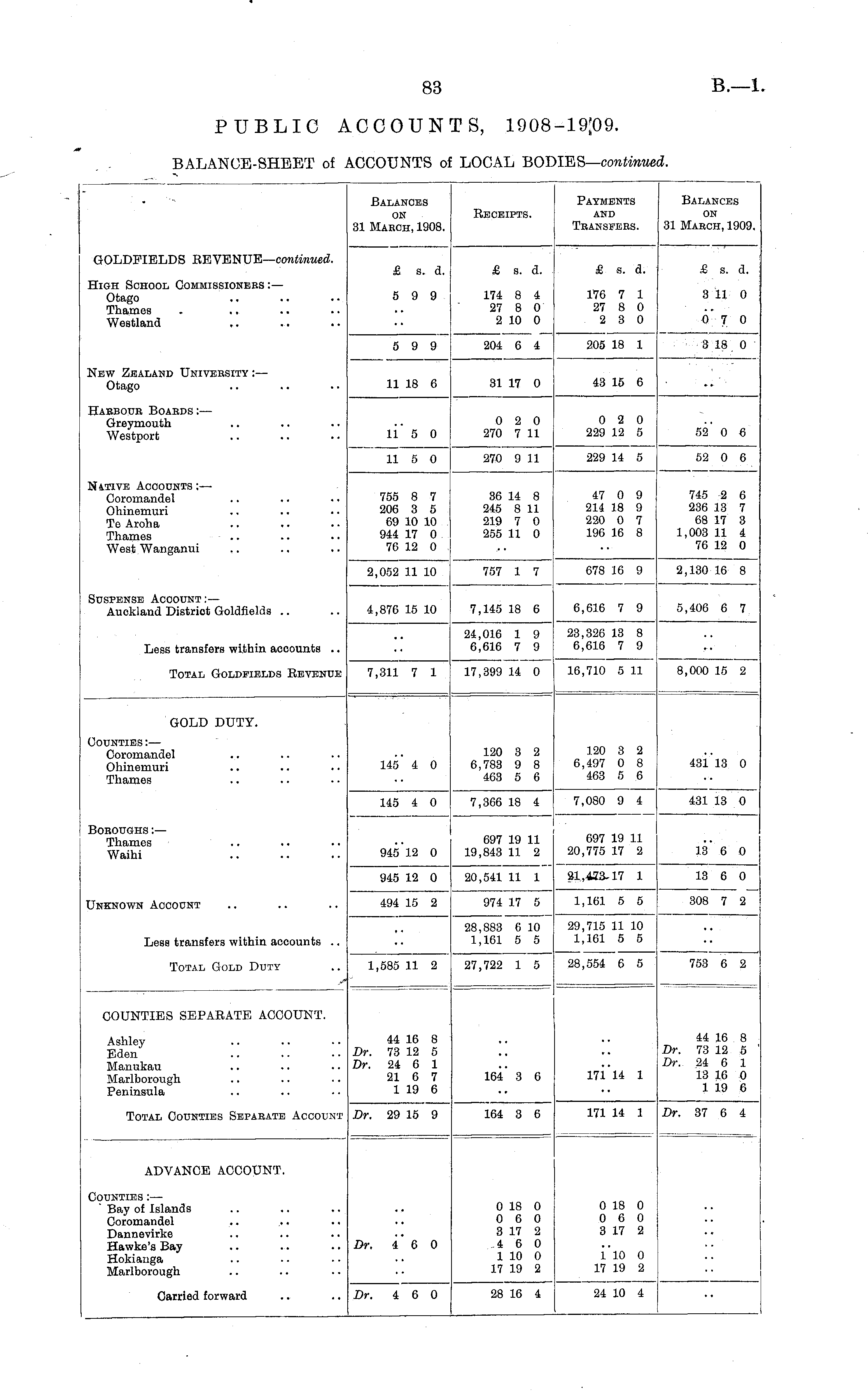 Balances on 31 March, 1908. Receipts. Payments AND Transfers. Balances on 31 Mabch, 1909 GOLDFIELDS REVENUE— continued. £ s. d. £ s. d. £ s. d. £ s. d. High School Commissionebs :— Otago Thames Westland 5 9 9 174 8 4 27 8 0 2 10 0 176 7 1 27 8 0 2 3 0 3 11 0 67O 5 9 9 204 6 4 205 18 1 3 18 0 New Zealand University :— Otago 11 18 6 31 17 0 43 IS 6 Harbour Boards :— Greymouth Westport li' 5 0 0 2 0 270 7 11 0 2 0 229 12 5 52 0 6 11 5 0 270 9 11 229 14 5 52 0 6 Native Accounts :— Coromandel Ohinemuri Te Aroha Thames West Wanganui 755 8 7 206 3 5 69 10 10 944 17 0 76 12 0 36 14 8 245 8 11 219 7 0 255 11 0 47 0 9 214 18 9 220 0 7 196 16 8 745 2 6 236 13 7 68 17 3 1,003 11 4 76 12 0 2,052 11 10 757 1 7 678 16 9 2,130 16 8 Suspense Account:— Auckland Distriot Goldfields 4,876 15 10 7,145 18 6 6,616 7 9 5,406 6 7 Less transfers within accounts .. 24,016 1 9 6,616 7 9 23,326 13 8 6,616 7 9 Total Goldfields Revenue 7,311 7 1 17,399 14 0 16,710 5 11 8,000 15 2 GOLD DUTY. Counties :— Coromandel Ohinemuri Thames 145 - 4 0 120 3 2 6,783 9 8 463 5 6 120 3 2 6,497 0 8 463 5 6 431 13 0 145 4 0 7,366 18 4 7,080 9 4 431 13 0 Boboughs :— Thames Waihi 697 19 11 19,843 11 2 697 19 11 20,775 17 2 13 - 6 0 945 12 0 945 12 0 20,541 11 1 21,473-17 1 13 6 0 Unknown Account 494 15 2 974 17 5 1,161 5 5 308 7 2 Less transfers within accounts .. 28,883 6 10 1,161 5 5 29,715 11 10 1,161 5 5 Total Gold Duty 1,585 11 2 27,722 1 5 28,554 6 5 753 6 2 COUNTIES SEPARATE ACCOUNT. 44 16 8 Dr. 73 12 5 Dr. 24 6 1 13 16 0 1 19 6 Ashley Eden Manukau Marlborough Peninsula Dr. Dr. 44 16 8 73 12 5 24 6 1 21 6 7 1 19 6 164' 3 6 171*14 1 Total Counties Separate Account Dr. 29 15 9 164 3 6 171 14 1 Dr. 37 6 4 ADVANCE ACCOUNT. Counties :— Bay of Islands Coromandel Dannevirke Hawke's Bay Hokianga Marlborough Dr. 46 0 0 18 0 0 6 0 3 17 2 4 6 0 1 10 0 17 19 2 0 18 0 0 6 0 3 17 2 i'10 0 17 19 2 Carried forward Dr. 4 6 0 28 16 4 24 10 4