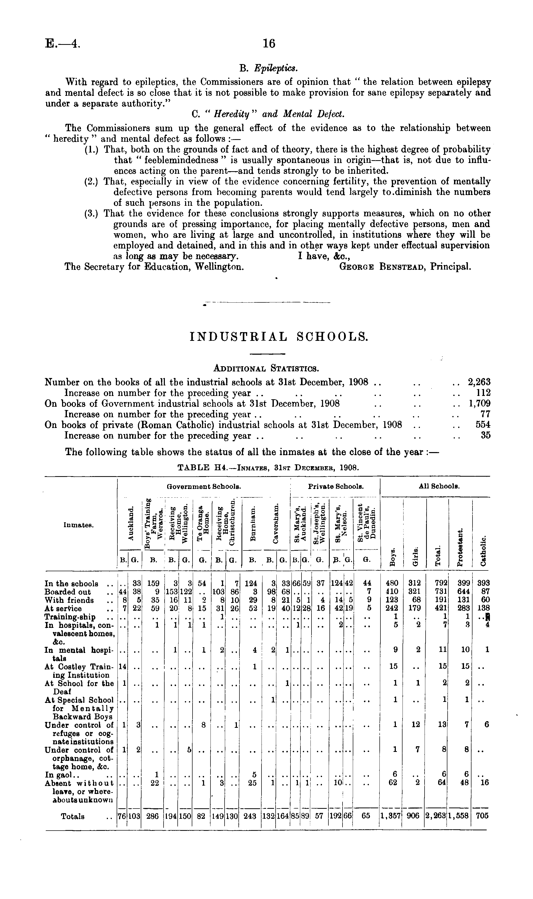 B. Epikftics. With regard to epileptics, the Commissioners are of opinion that " the relation between epilepsy and mental defect is so close that it is not possible to make provision for sane epilepsy separately and under a separate authority." C. " Heredity " and Mental Deject. The Commissioners sum up the general effect of the evidence as to the relationship between " heredity " and mental defect as follows : — (1.) That, both on the grounds of fact and of theory, there is the highest degree of probability that " feeblemindedness " is usually spontaneous in origin—that is, not due to influences acting on the parent—and tends strongly to be inherited. (2.) That, especially in view of the evidence concerning fertility, the prevention of mentally defective persons from becoming parents would tend largely to.diminish the numbers of such persons in the population. (3.) That the evidence for these conclusions strongly supports measures, which on no other grounds are of pressing importance, for placing mentally defective persons, men and women, who are living at large and uncontrolled, in institutions where they will be employed and detained, and in this and in other ways kept under effectual supervision as long as may be necessary. I have, &c, The Secretary for Education, Wellington. George Benstead, Principal.