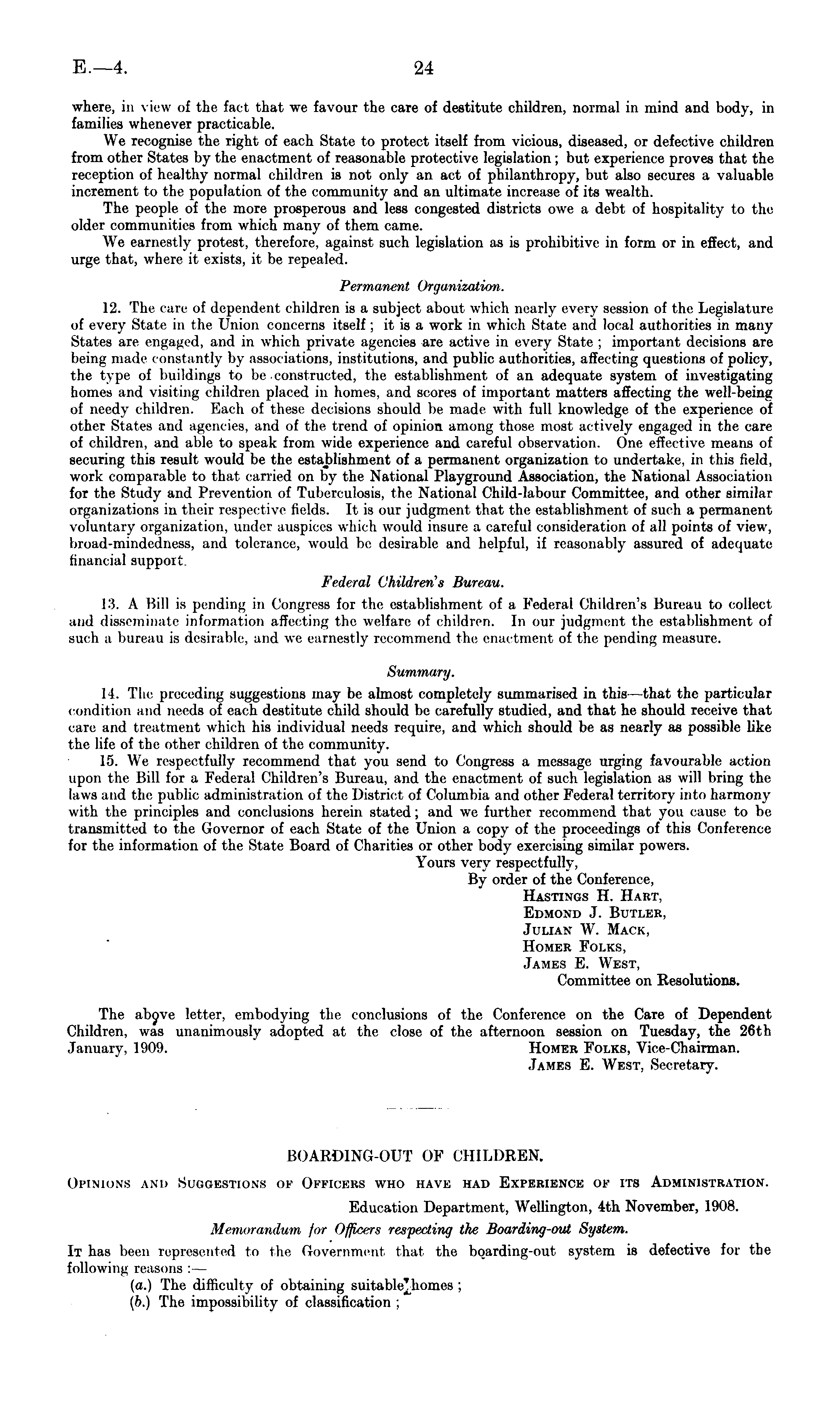 where, in view of the fact that we favour the care of destitute children, normal in mind and body, in families whenever practicable. We recognise the right of each State to protect itself from vicious, diseased, or defective children from other States by the enactment of reasonable protective legislation ; but experience proves that tinreception of healthy normal children is not only an act of philanthropy, but also secures a valuable increment to the population of the community and an ultimate increase of its wealth. The people of the more prosperous and less congested districts owe a debt of hospitality to the older communities from which many of them came. We earnestly protest, therefore, against such legislation as is prohibitive in form or in effect, and urge that, where it exists, it be repealed. Permanent Organization. 12. The care of dependent children is a subject about which nearly every session of the Legislature of every State in the Union concerns itself ; it is a work in which State and local authorities in many States are engaged, and in which private agencies are active in every State : important decisions are being made constantly by associations, institutions, and public authorities, affecting questions of policy, the type of buildings to be constructed, the establishment of an adequate system of investigating homes and visiting children placed in homes, and scores of important matters affecting the well-being of needy children. Each of these decisions should be made with full knowledge of the experience of other States and agencies, and of the trend of opinion among those most actively engaged in the care of children, and able to speak from wide experience and careful observation. One effective means of securing this result would be the establishment of a permanent organization to undertake, in this field, work comparable to that carried on by the National Playground Association, the National Association for the Study and Prevention of Tuberculosis, the National Child-labour Committee, and other similar organizations in their respective fields. It is our judgment that the establishment of such a permanent voluntary organization, under auspices which would insure a careful consideration of all points of view, broad-mindedness, and tolerance, would be desirable and helpful, if reasonably assured of adequate financial supp<> friliin/ Children's Bureau. 13. A Bill is pending in Congress lor the establishment of a Federal Children's Bureau to collect and disseminate information affecting the welfare of children. In our judgment the establishment of such a bureau is desirable, and we earnestly recommend the enactment of the pending measure. Summary. 11. The preceding suggestions may be almost completely summarised in this that the particular condition and needs of each destitute child should be carefully studied, and that he should receive that care and treatment which his individual needs require, and which should be as nearly as possible like the life of the other children of the community. 15. We respectfully recommend that you send to Congress a message urging favourable action upon the Bill for a Federal Children's Bureau, and the enactment of such legislation as will bring the laws and the public administration of the District of Columbia and other Federal territory into harmony with the principles and conclusions herein stated ; and we further recommend that you cause to be transmitted to the Governor of each State of the Union a copy of the proceedings of this Conference for the information of the State Board of Charities or other body exercising similar powers. Yours very respectfully, By order of the Conference, Hastings H. Hart, Edmoxd J. Butler, Julian W. Mace, Homer Folks. James E. West, Committee on Resolutions. The above letter, embodying the conclusions of the Conference on the Care of Dependent Children, was unanimously adopted at the close of the afternoon session on Tuesday, the 26th January, 1909. Homer Folks, Vice-Chairman. James E. West, Secretary.