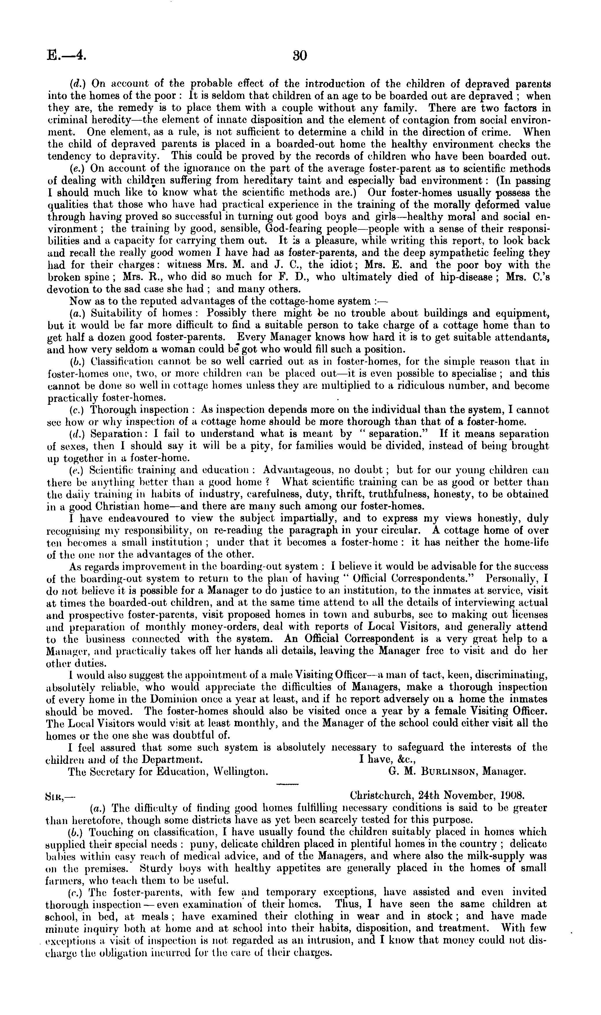 Sir, — Christchurch, 24th November. 1908. (a.) The difficulty of finding gI h ea fulfilling necessary conditions is said to be greater than heretofore, though some districts have as yet been scarcely tested for this purpose. (b.) Touching on classification, I have usually found the children suitably placed in homes which supplied their special needs : puny, delicate children placed ill plentiful homes ill the country : delicate babies within easy reach of medical advice, and of the Managers, and where also the iiiiik-supply was on the premises. Sturdy boys with healthy appetites are generally placed in the homes of small farmers, who teach them to be useful. (o.) The foster-parents, with few anil temporary exceptions, have assisted and even invited thorough inspection even examination of their homes. Thus, I have seen the same children at school, in bed, at meals: have examined their clothing in wear and in stock: and have made minute inquiry both at home and at school into their habits, disposition, and treatment. With few exceptions a visit of inspection is not regarded as an intrusion, and I know that money could not discharge | he obligation incurred for the 'ere of their charges.